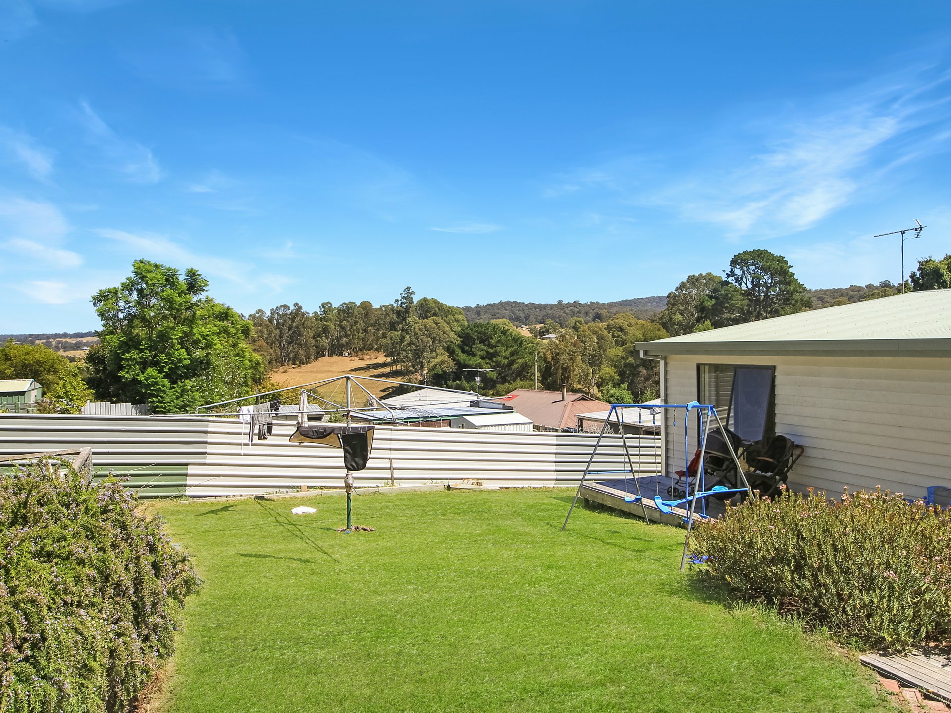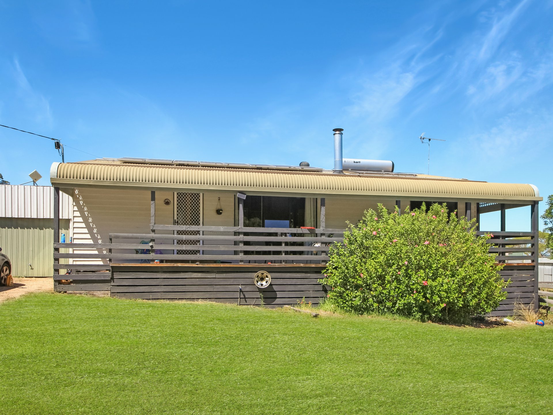 Inside, the home features three comfortable bedrooms with fans, a central bathroom and two separate living areas, providing flexibility for growing families or those who appreciate extra space to unwind. A split system and cosy wood heater ensure year-round comfort, while solar panels add an energy-efficient bonus to help keep living costs down.