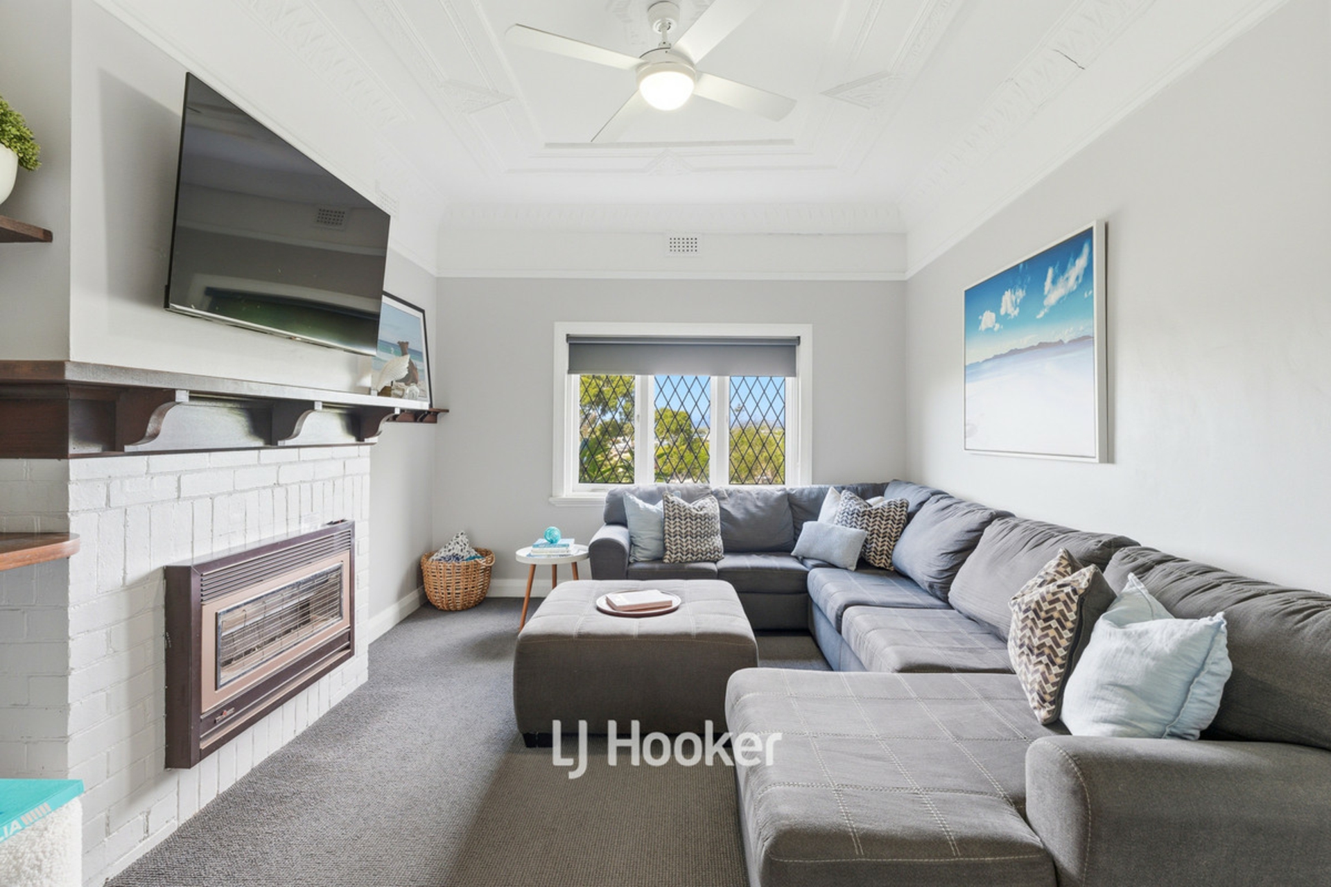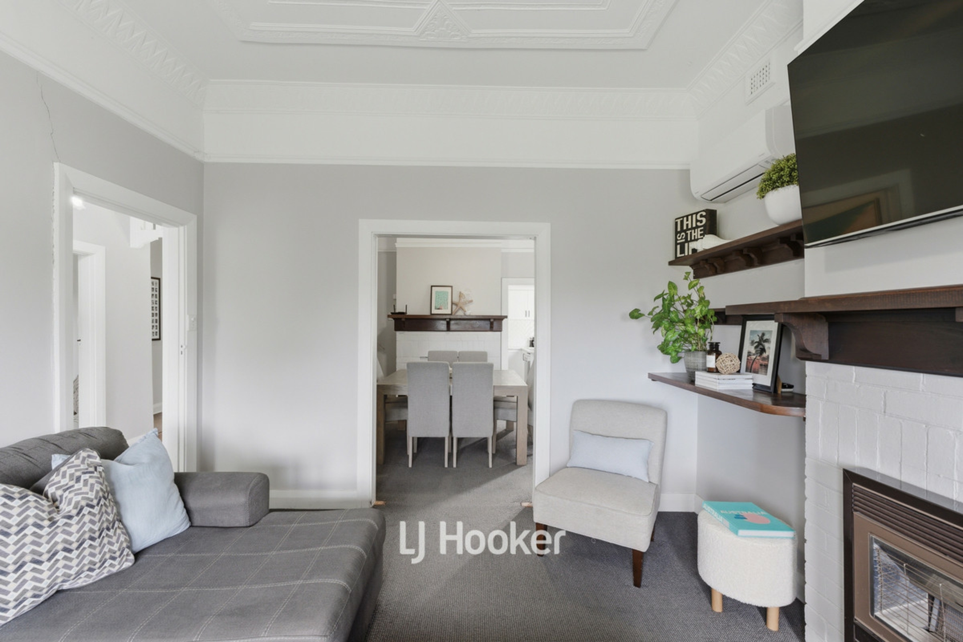 - Front lounge room with gas heater (surrounded by fireplace mantle), a wall mounted reverse cycle split system
