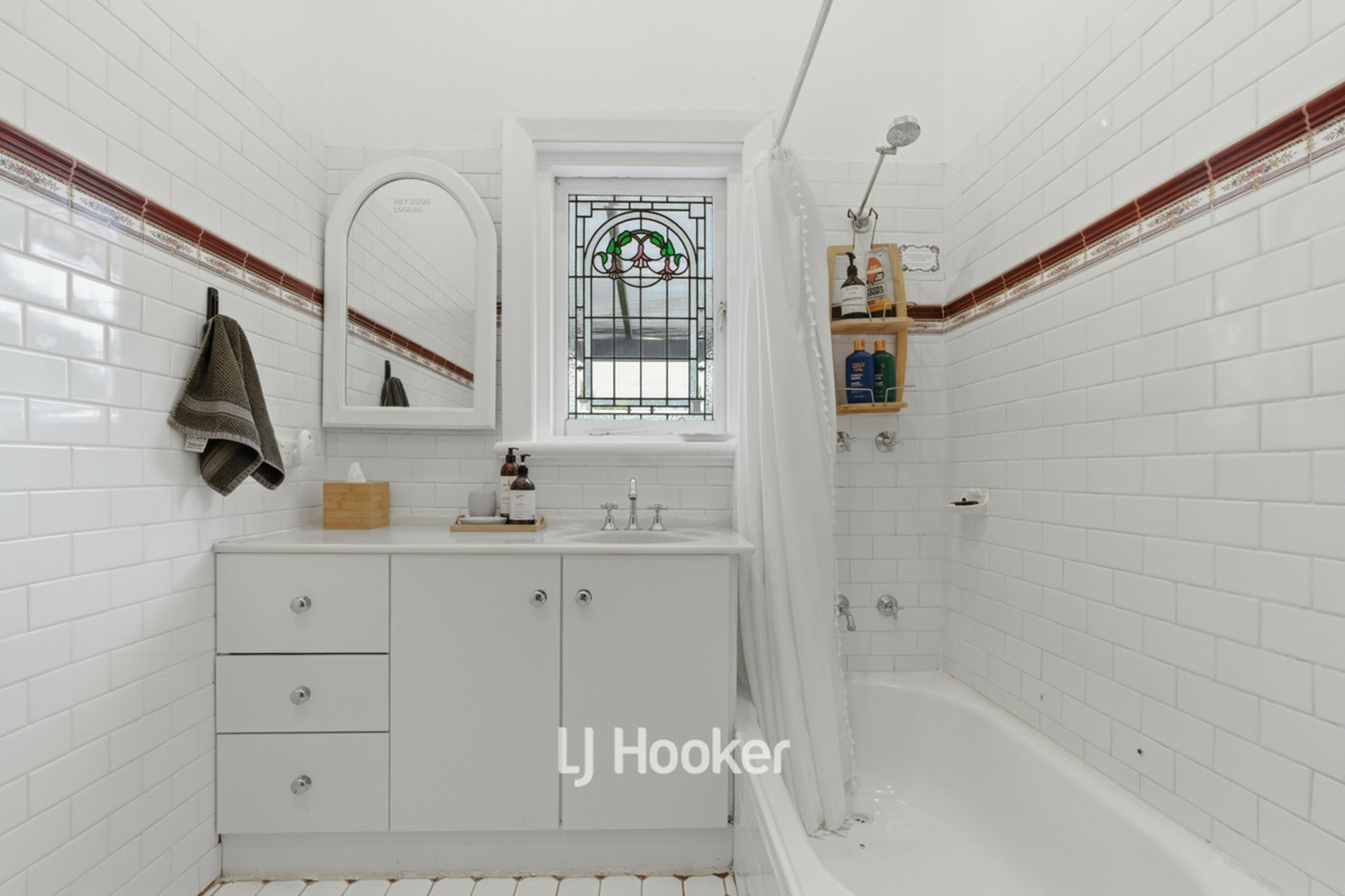 - Main bathroom features original stained-glass window and tiled walls