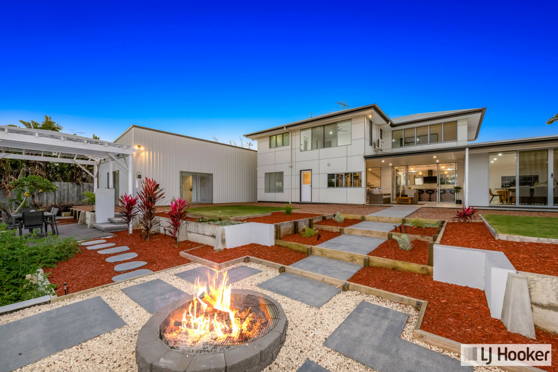 - Centrally located fire pit framed by landscaped retaining walls