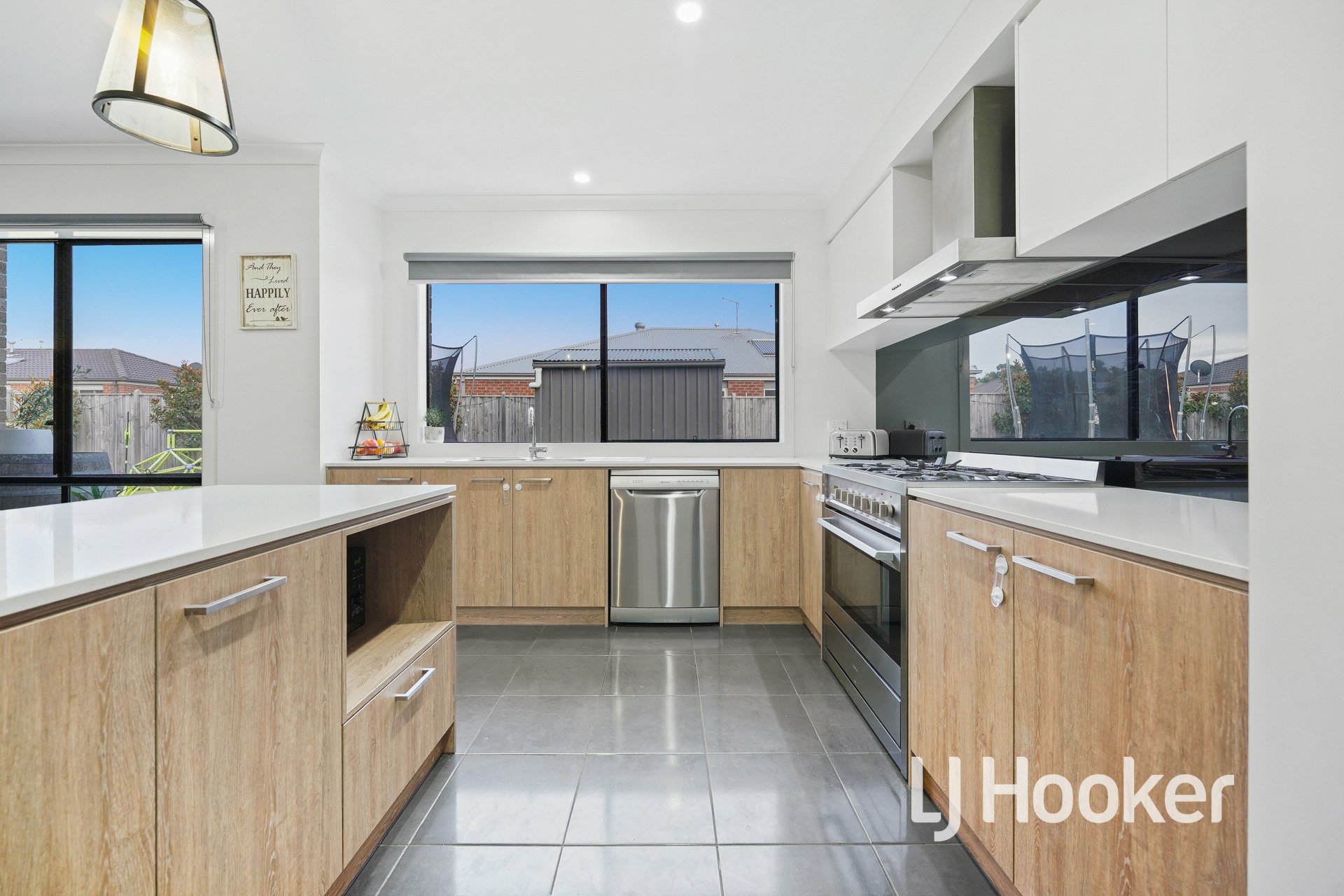 - Stunning kitchen designed for the home chef includes island bench with stone benchtops, 900mm stainless steel upright oven and cooktop, rangehood, dishwasher, walk in pantry, window overlooking the backyard, perfect for keeping an eye on the kids.