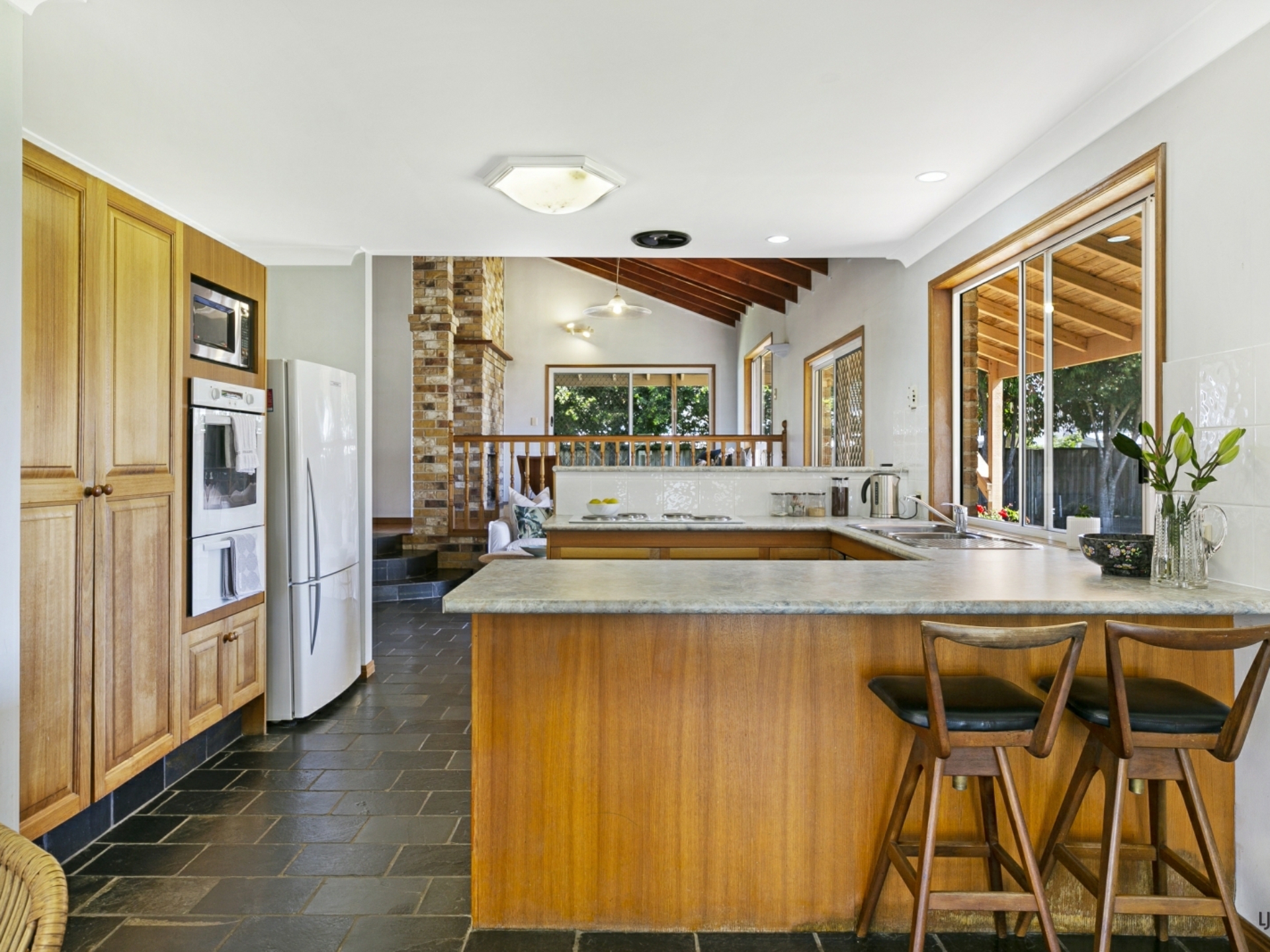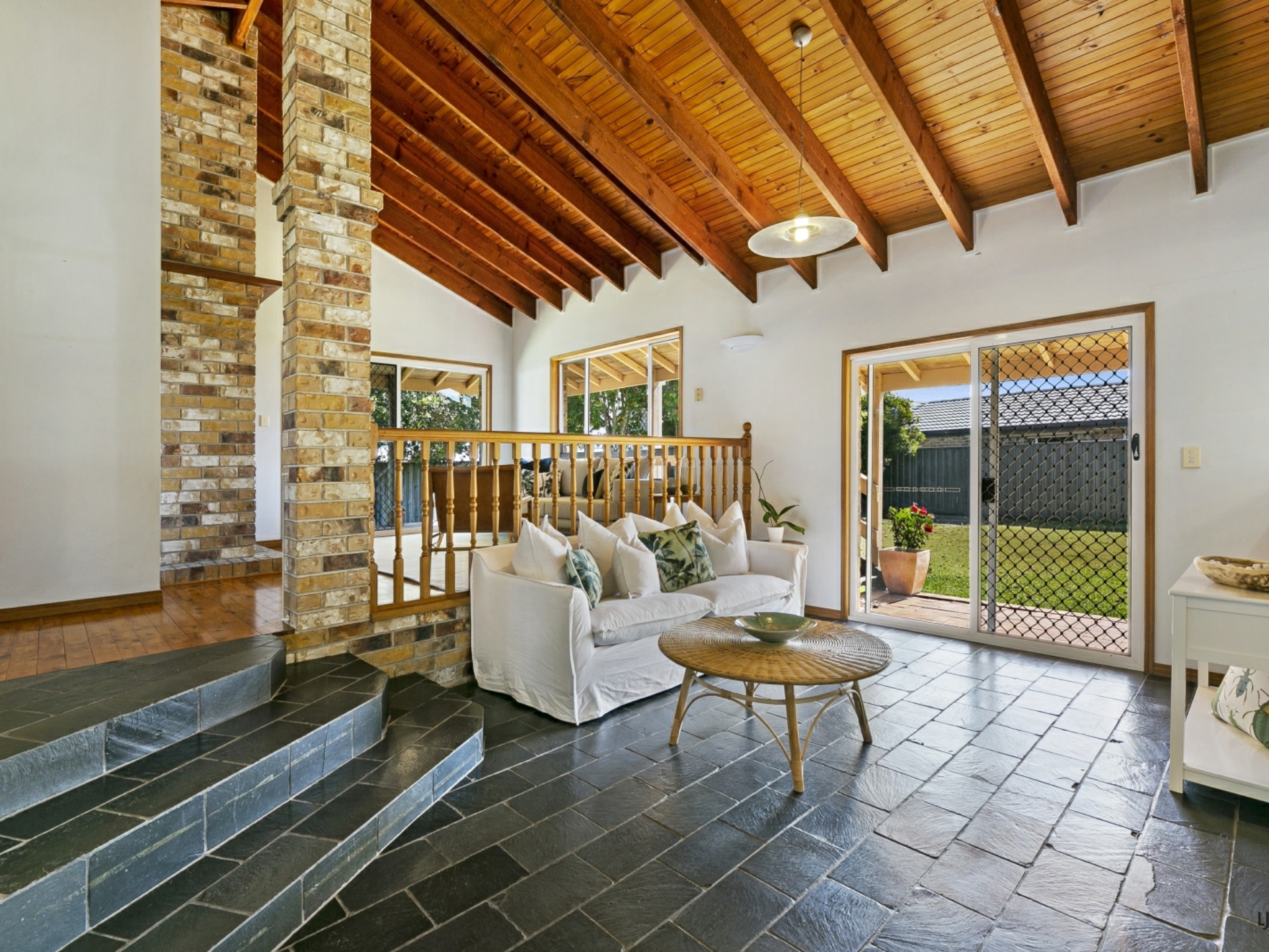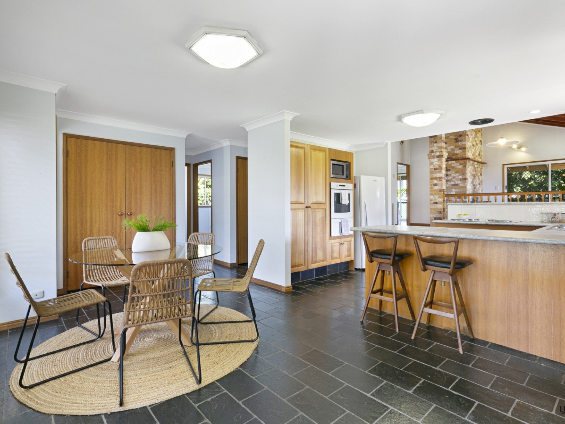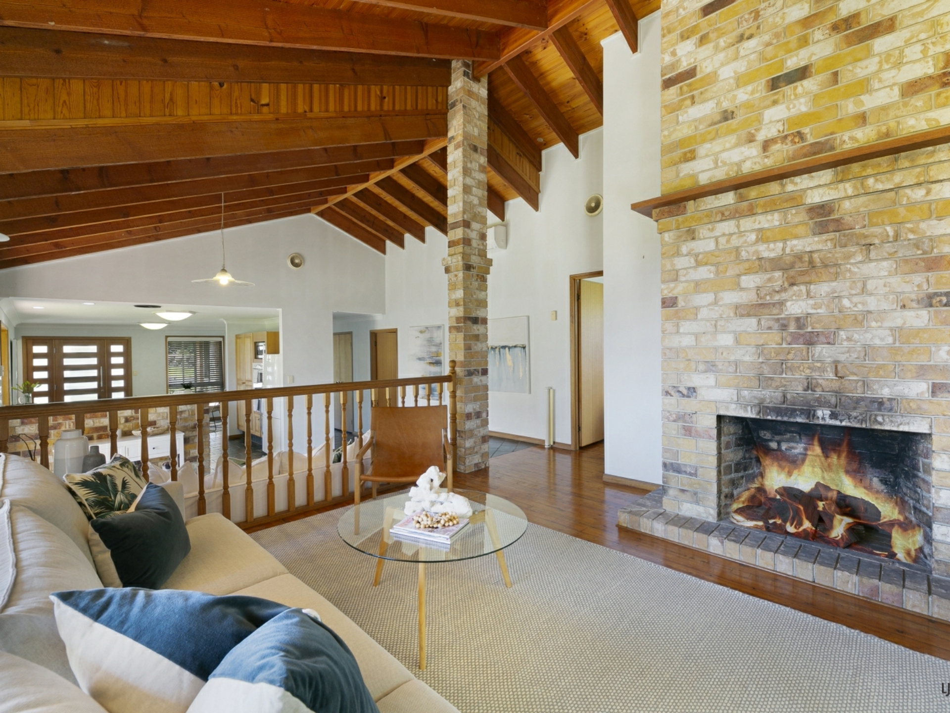 Internally the home features raked ceilings and wood fireplace, hardwood flooring in main living areas and stylish slate flooring throughout kitchen and dining.