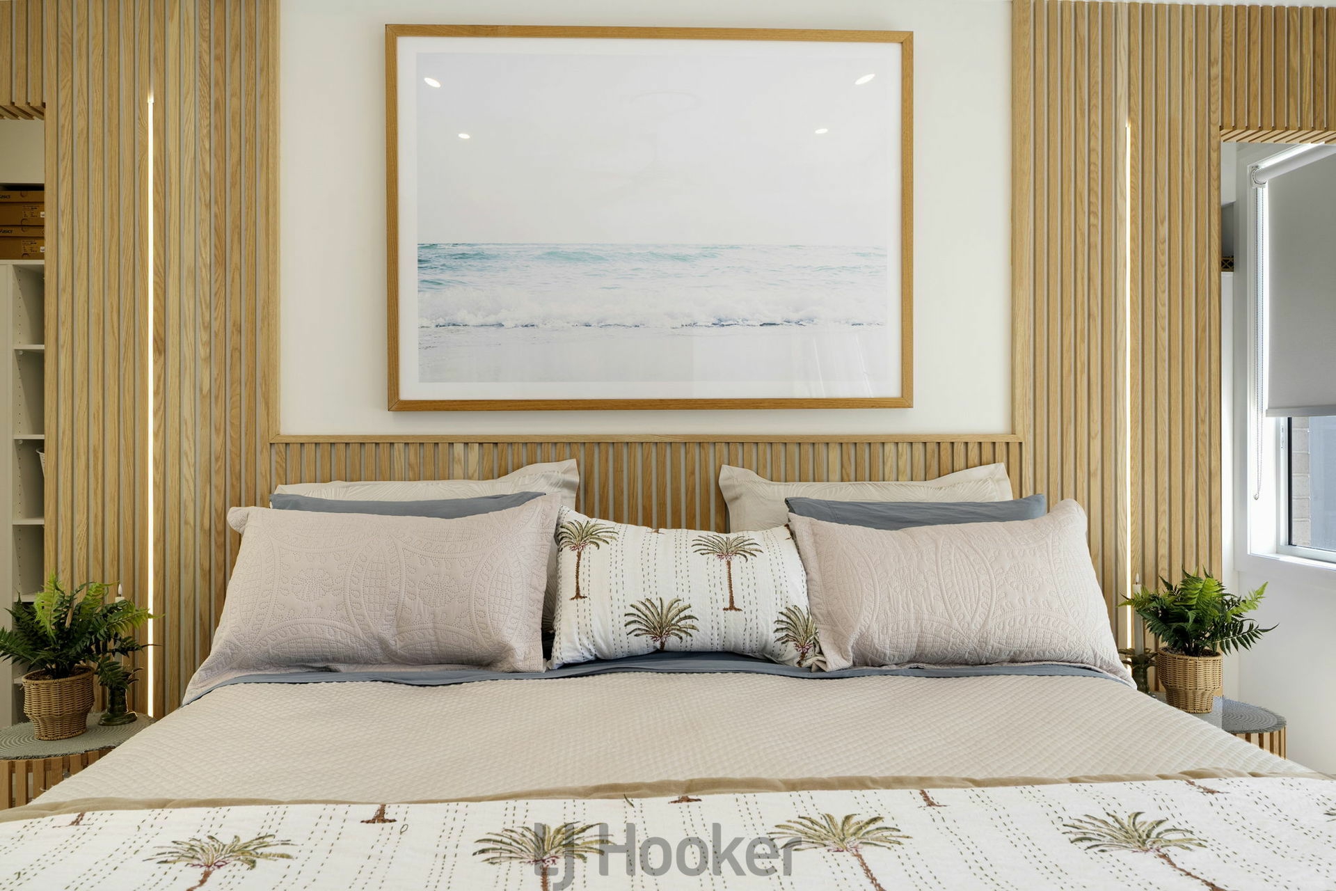 The spacious master suite includes an ensuite, his and hers walk-in robes and direct access to the sunlit deck and pool area.