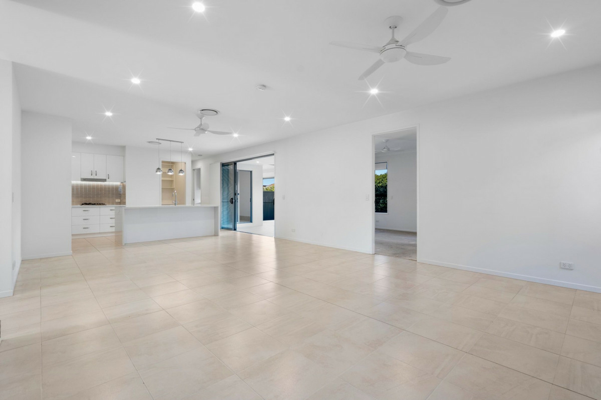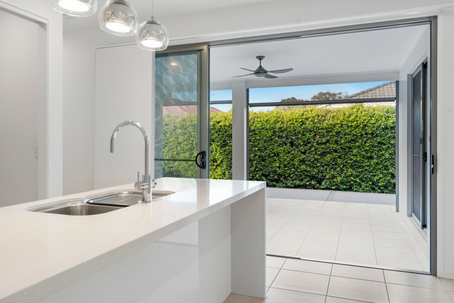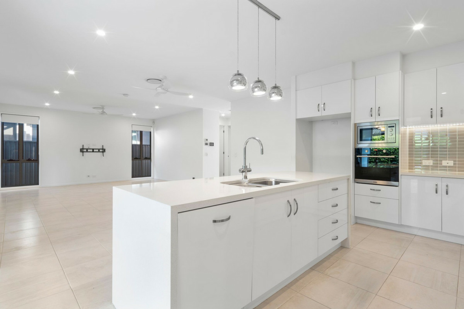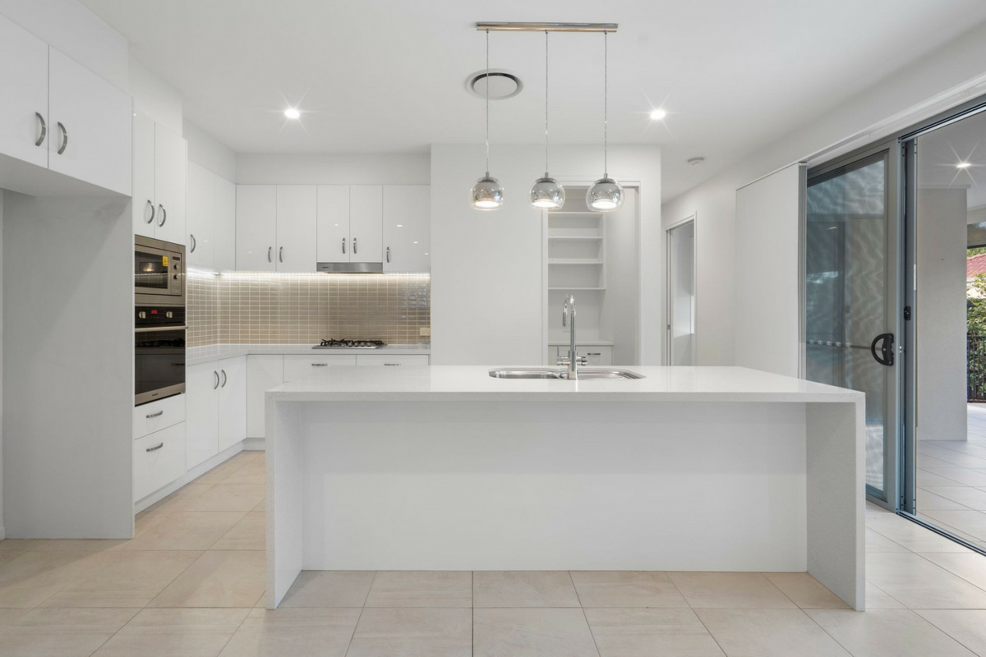 • Open-plan galley-style kitchen with Caesarstone waterfall benchtops, electric & gas cooking, built-in microwave, large butler's pantry and dishwasher