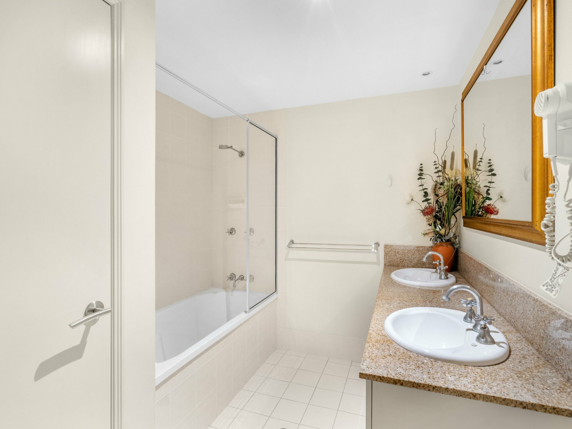 - Bathroom has a shower over bath and stone double vanity, separate toilet