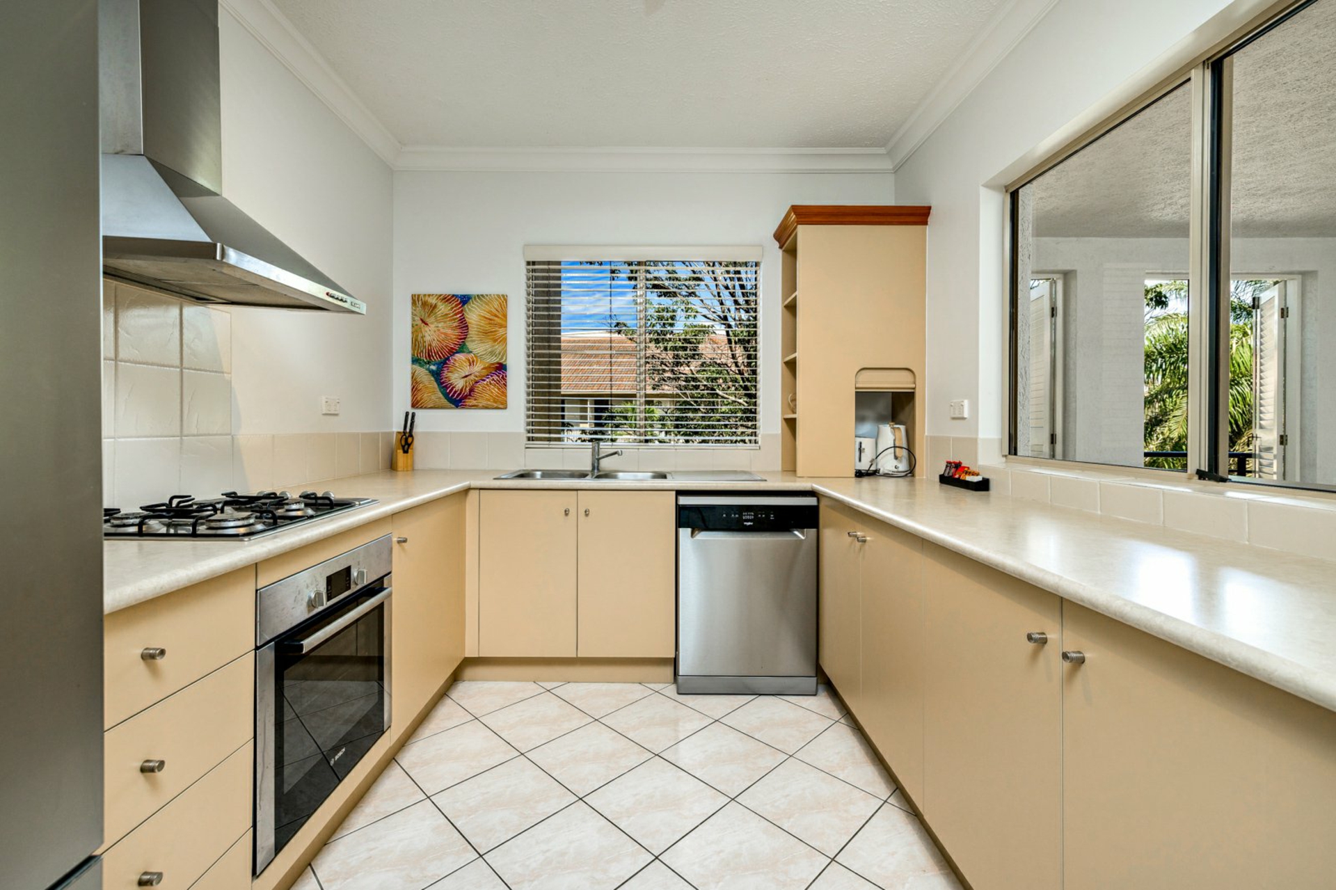 Tiled flooring extends throughout both the internal and external living areas, enhancing the homes low maintenance appeal. The kitchen is filled with natural light and equipped with modern appliances and ample storage. Spacious bedrooms include built in wardrobes, while the contemporary bathroom features a shower over bath, double vanity with stone benchtops, and excellent built in storage. An internal laundry with linen cupboards adds further practicality.