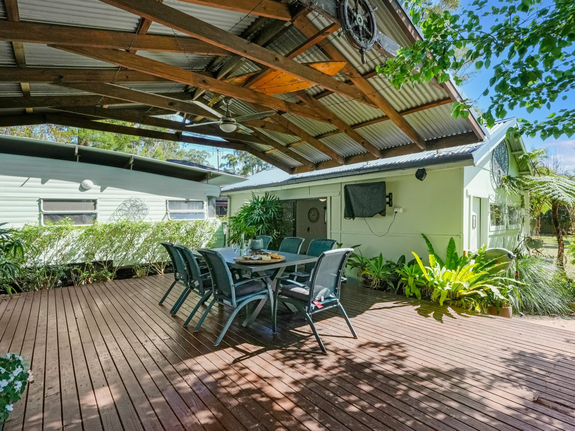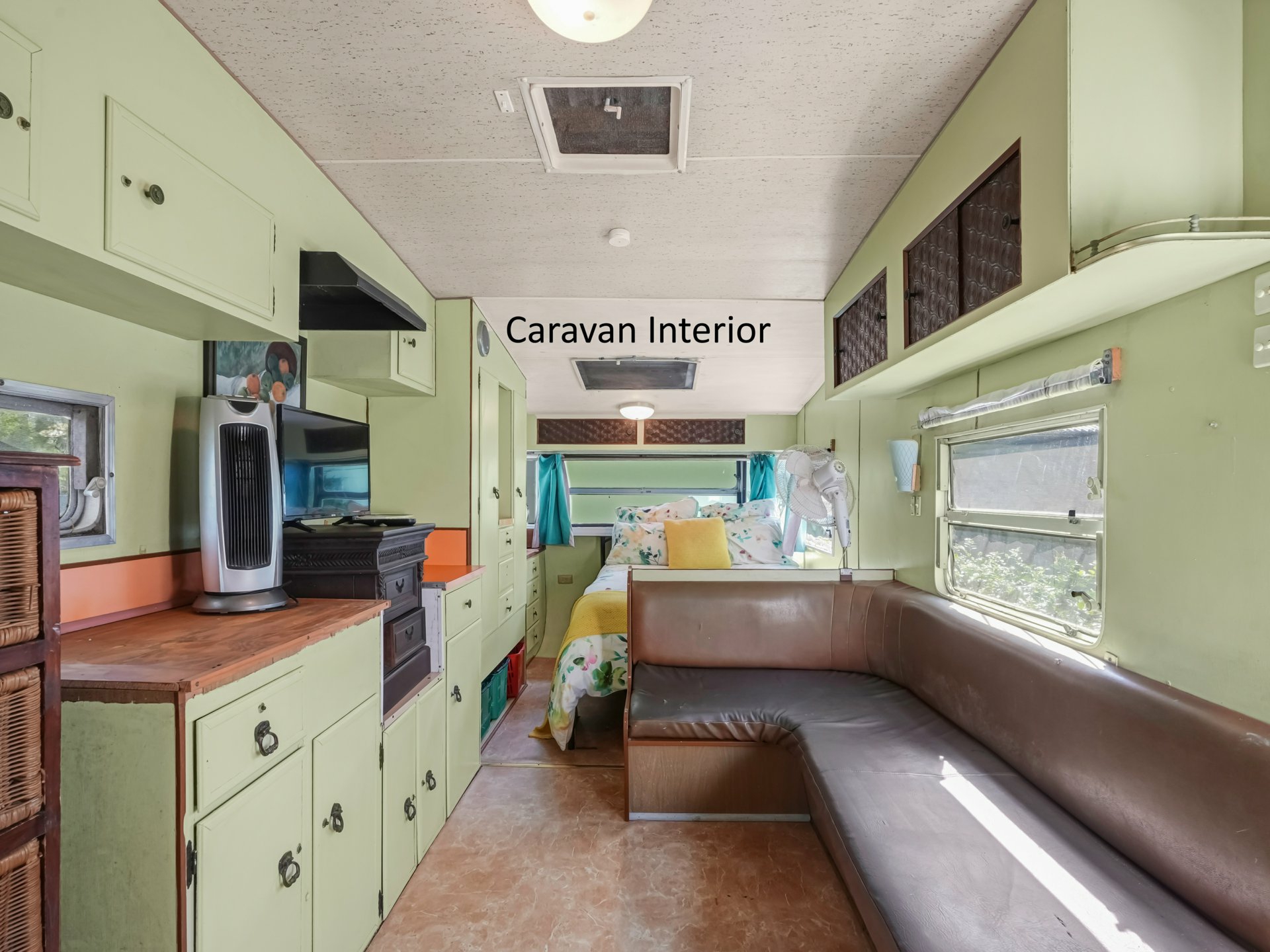 I step into a huge undercover entertainment deck, surrounded by a renovated TV room, a sleep-out with four built-in robes, and a second covered entertainment area that could easily be used as a carport. And wait for it… a very quirky on-site caravan, perfect for teenagers when they want their own space!