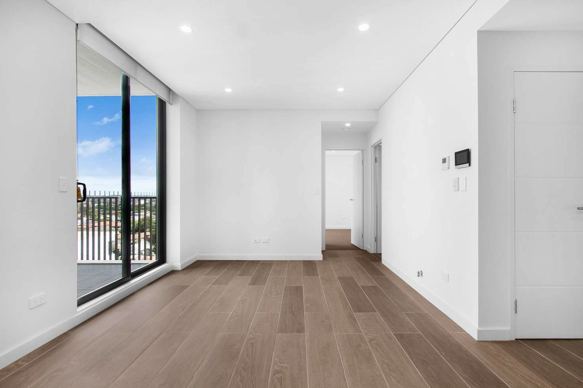 -Tiled combined dining and living area with access to balcony
