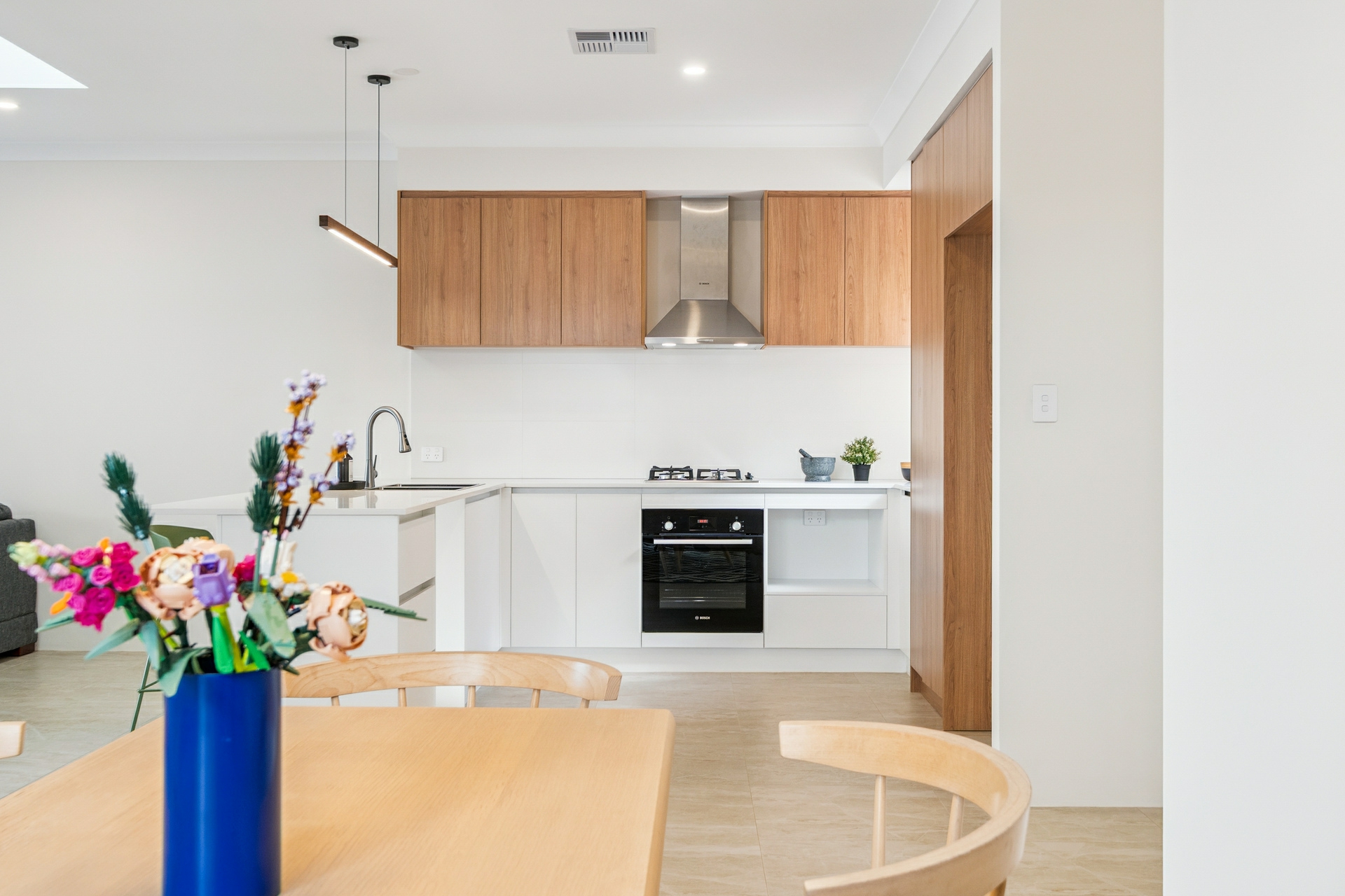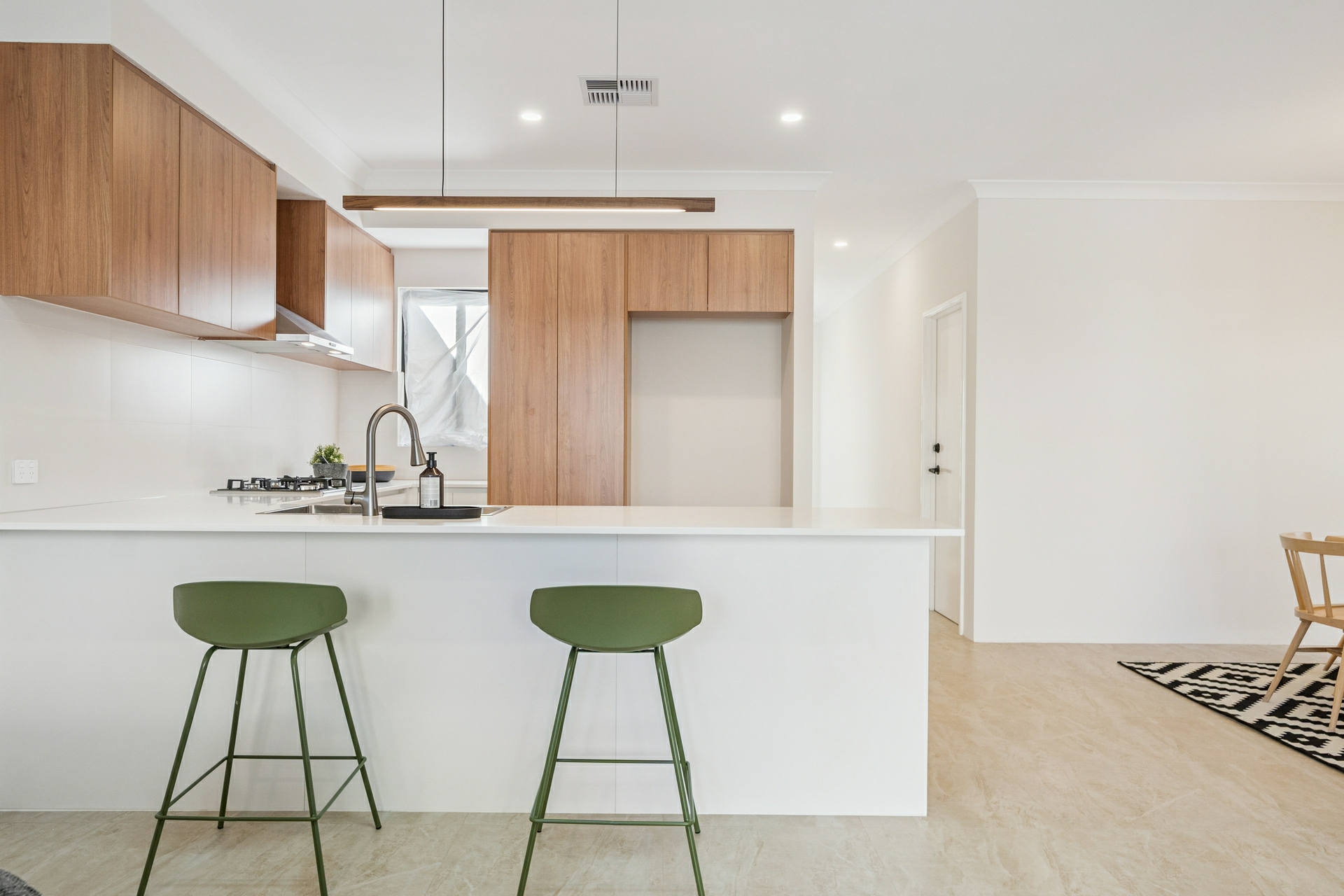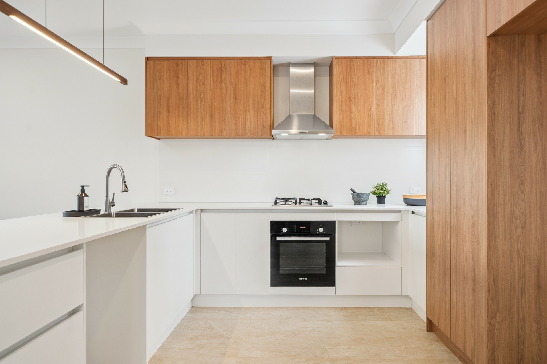• Stone benchtops + two tone Tasmanian Oak/White cabinetry � Sleek, timeless, and abundant storage