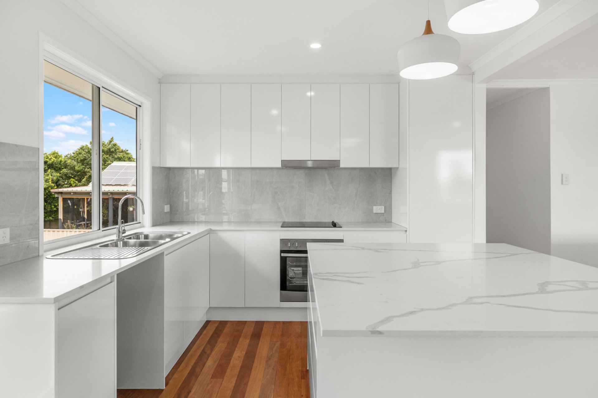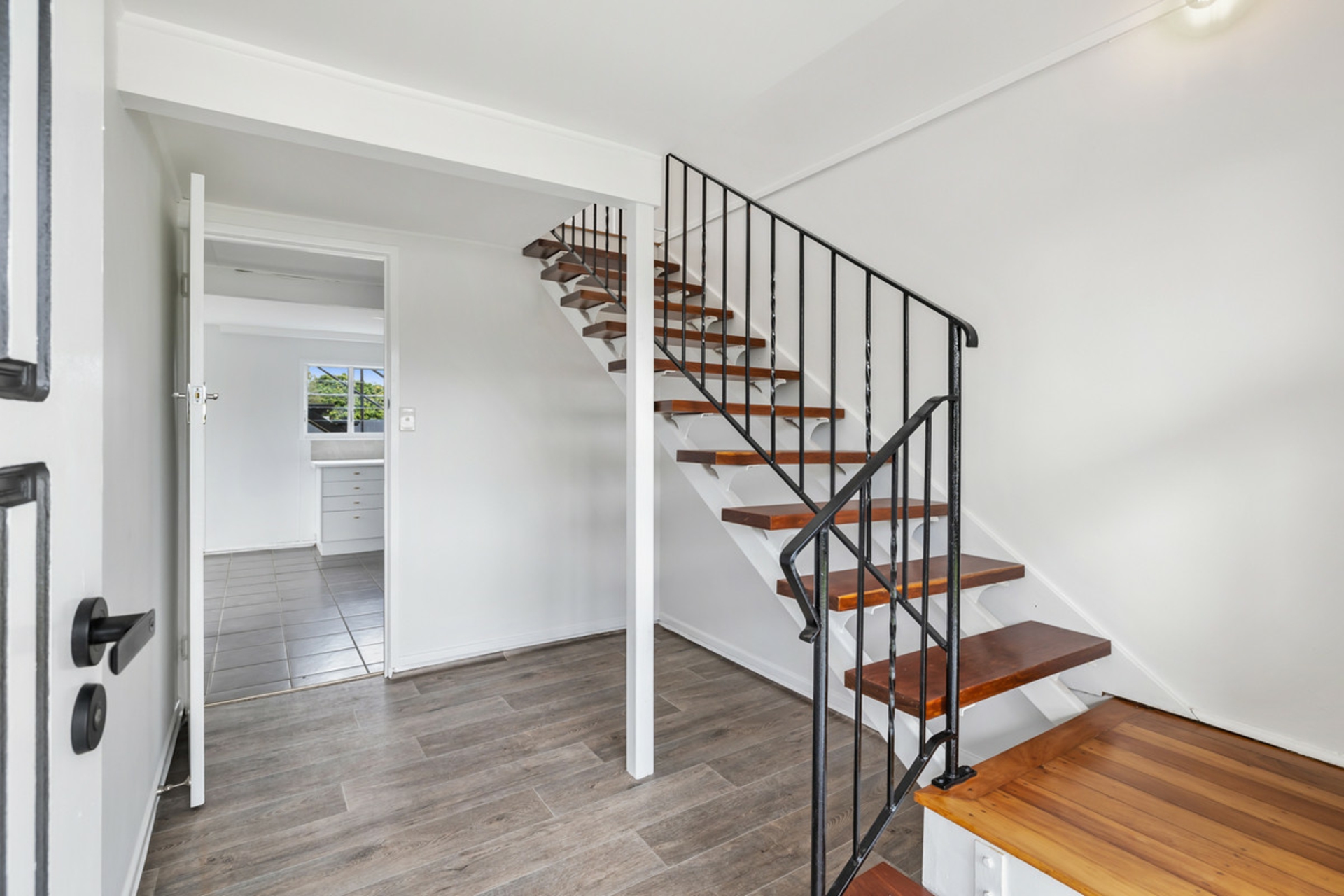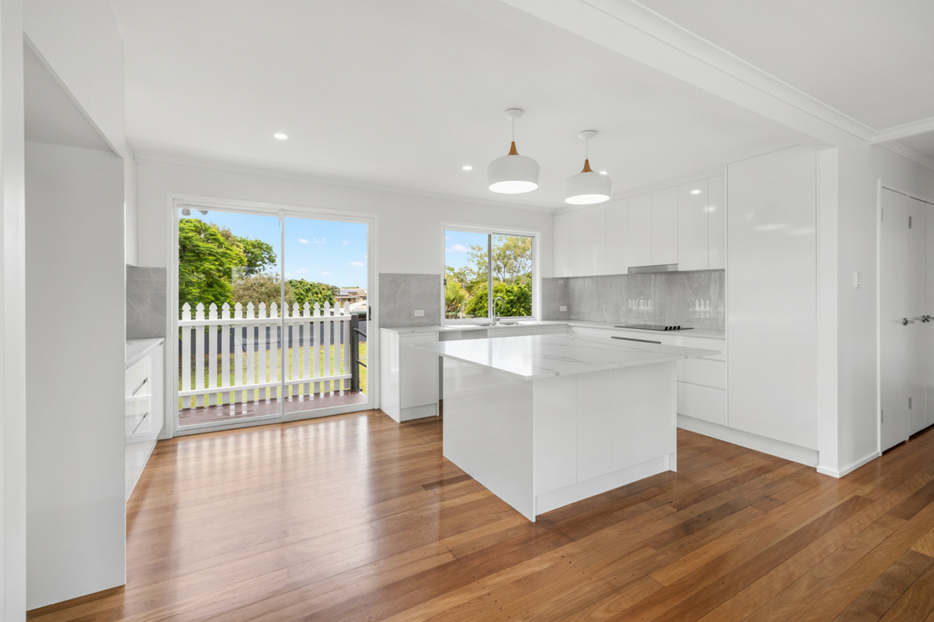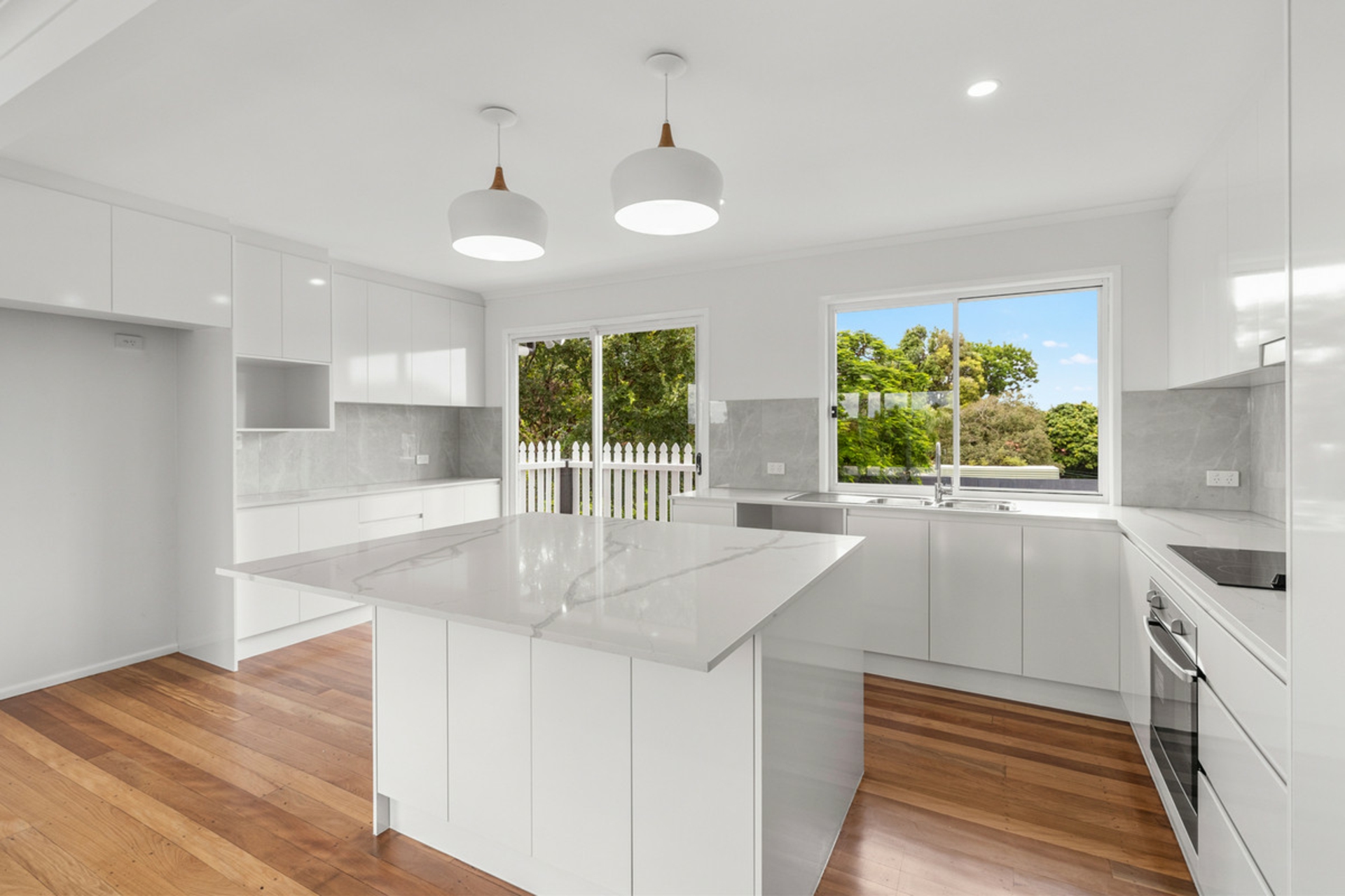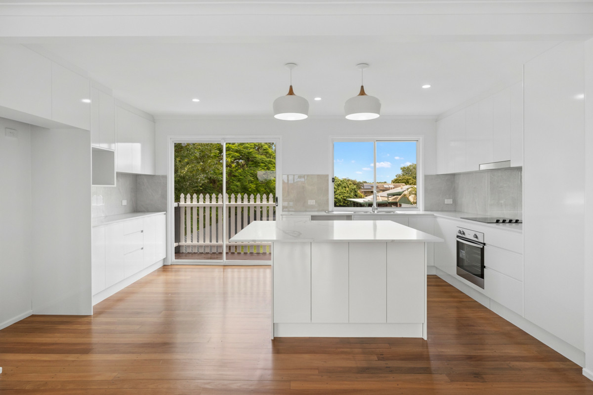 Upstairs, you'll find an impressive new chef's kitchen featuring an island with seating for four, adorned with sleek stone benchtops, and exuding a fresh, bright ambiance. This kitchen serves as the heart of the home, with stairs leading to the backyard.