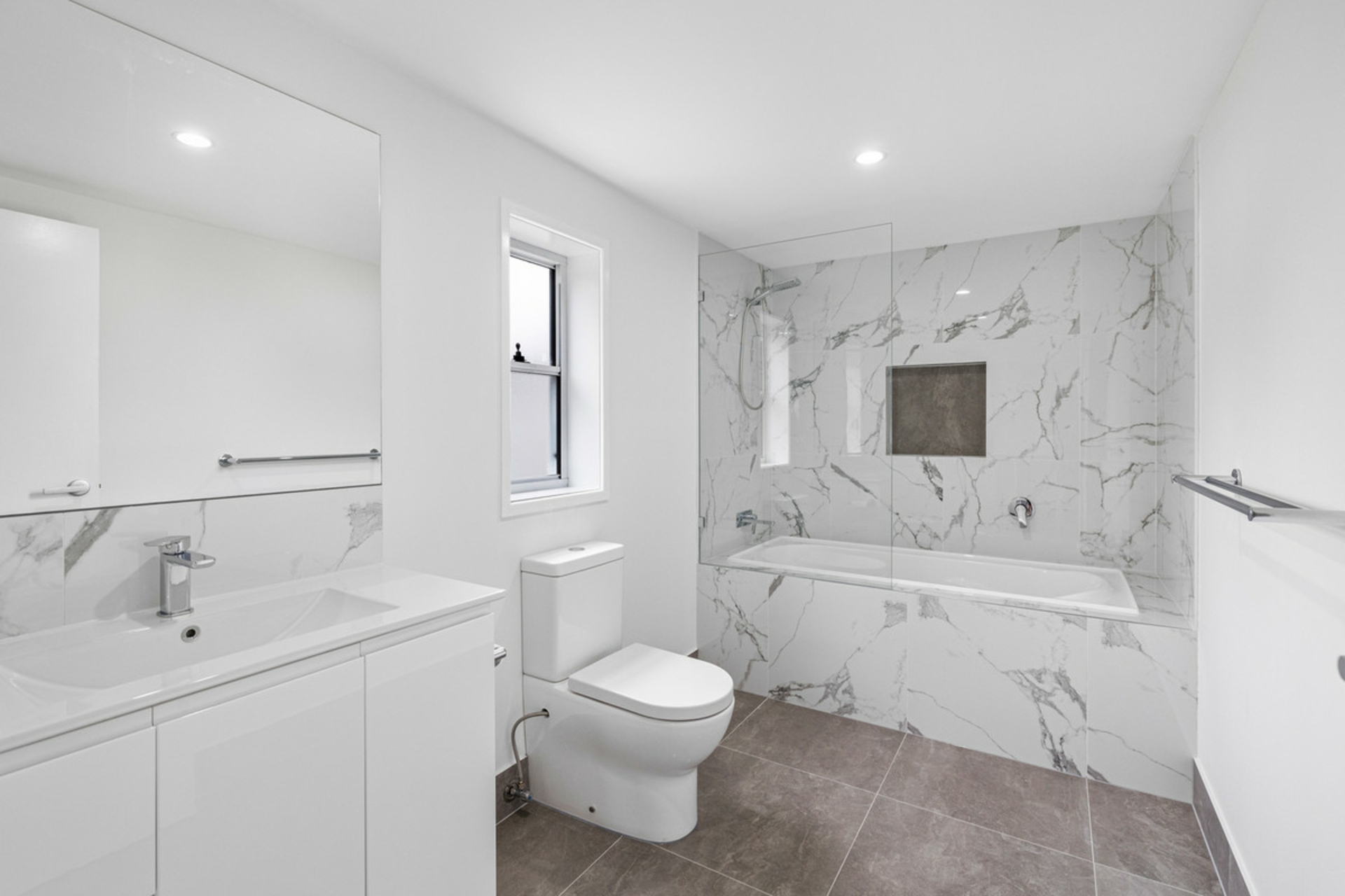 Boasting a completely modernized bathroom, featuring a stone vanity, walk-in shower, and floor-to-ceiling tiling, along with a separate toilet for added convenience.