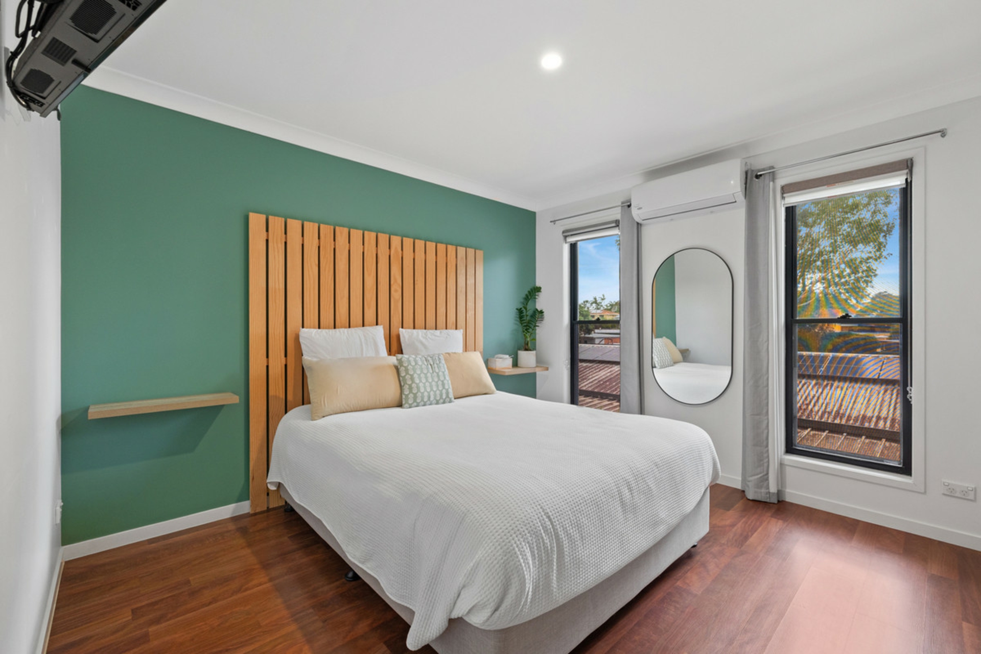 Large windows flood the home with natural light, complementing the modern fixtures and finishes throughout. Year-round comfort is assured with air conditioning, while solar power helps keep energy costs down.