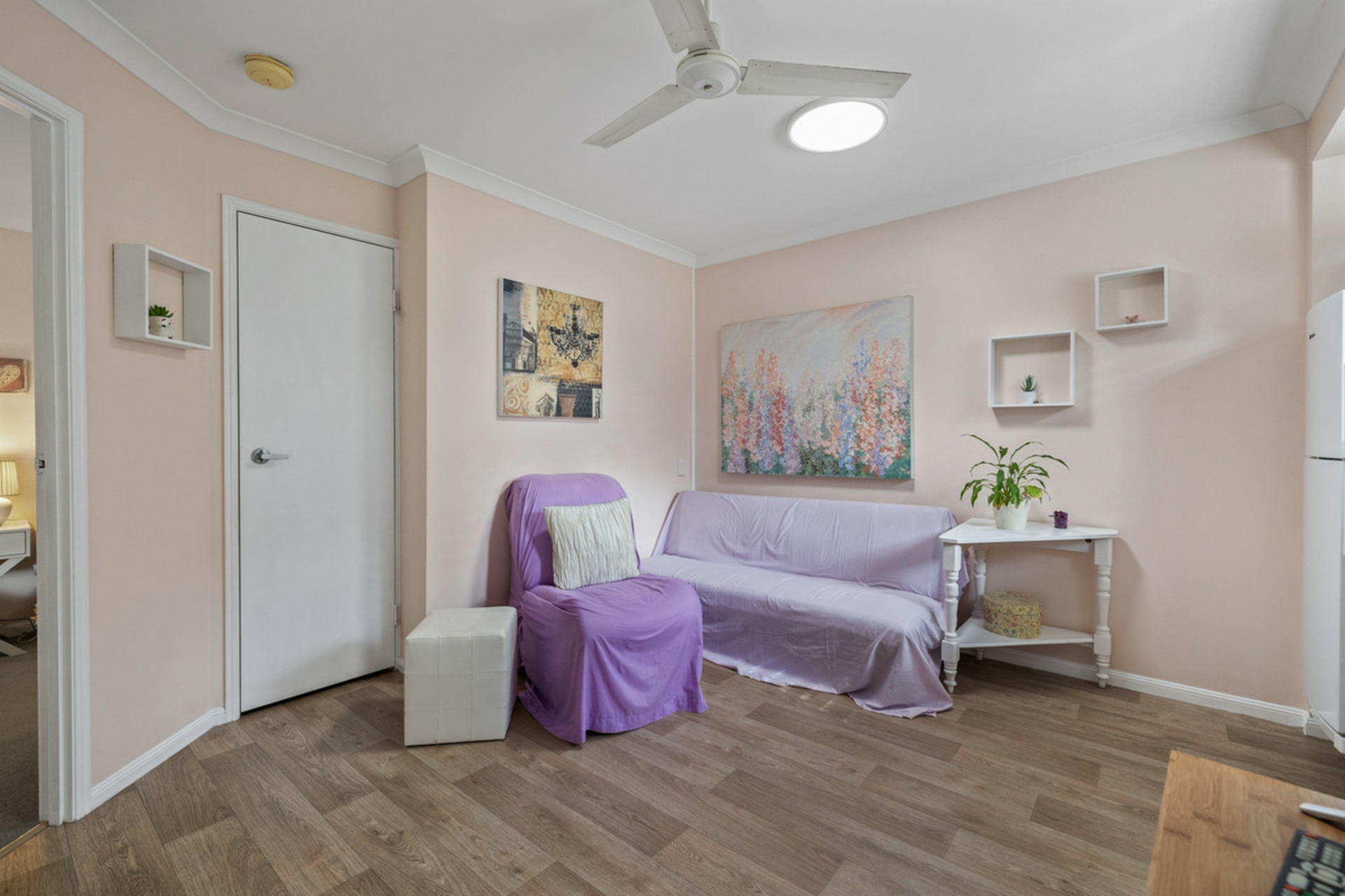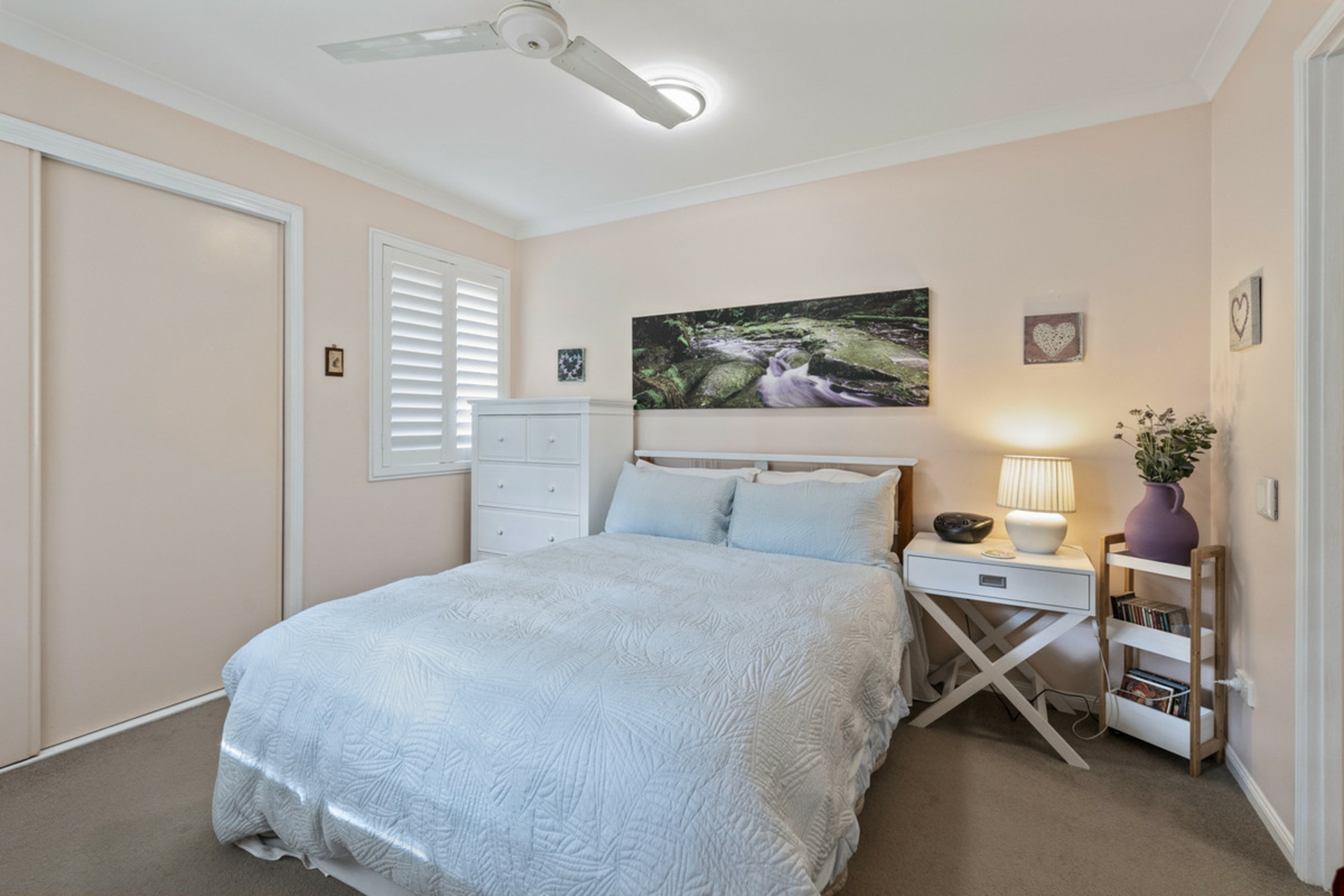 • Single bedroom with built-in wardrobe and fan
