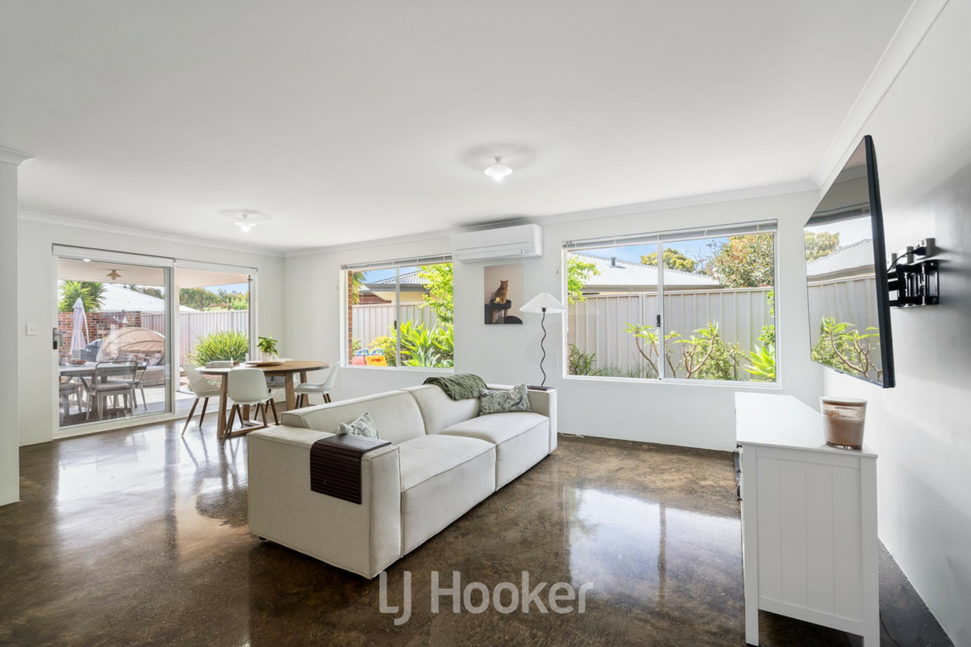 The home welcomes you via a charming front verandah leading to a wide entrance with security screen doors. Polished concrete flooring flows throughout, offering a modern, low-maintenance finish. Designed for flexible living, the layout includes a separate second living area that can be utilised as a theatre room, formal dining space, or fifth bedroom in addition to the expansive open-plan kitchen, living and dining area.