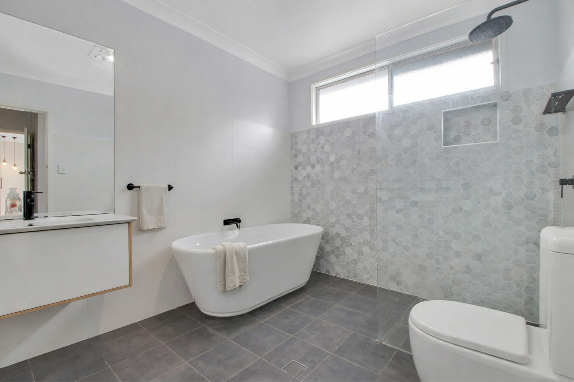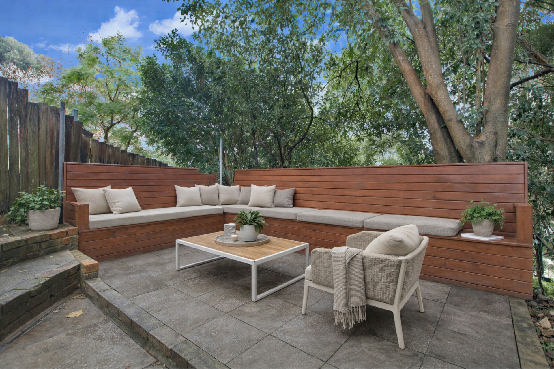 All three bedrooms are bright and airy, two featuring built-in wardrobes, while the master bedroom includes air-conditioning for year-round comfort. The recently renovated bathroom adds a touch of luxury with its wall-hung vanity, designer tiling, and indulgent freestanding bathtub.