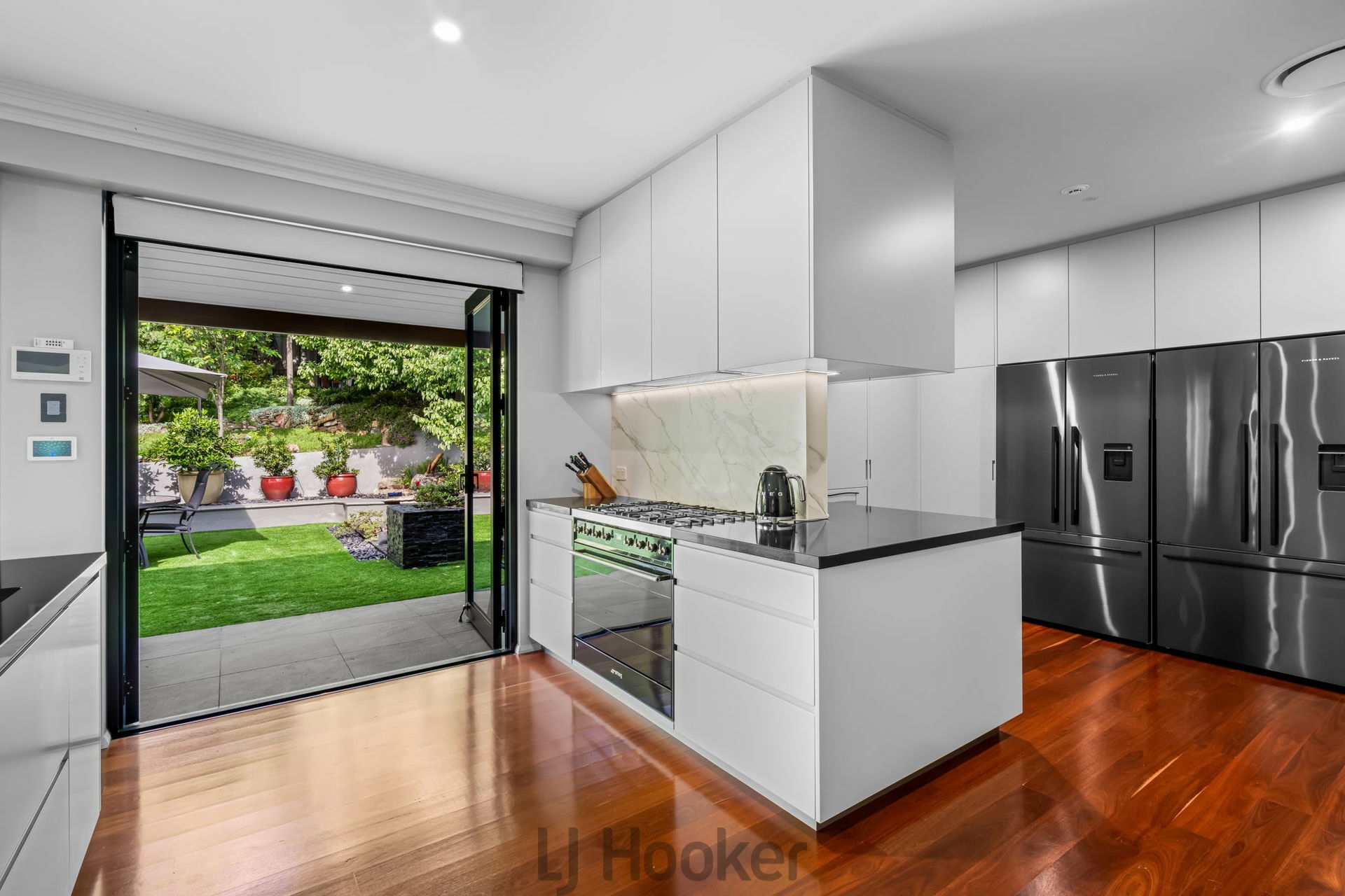 - Chef's kitchen with stone bench tops, 900mm 'Smeg' oven, gas cooktop, Miele dishwasher and quiet 'Schweigen' rangehood