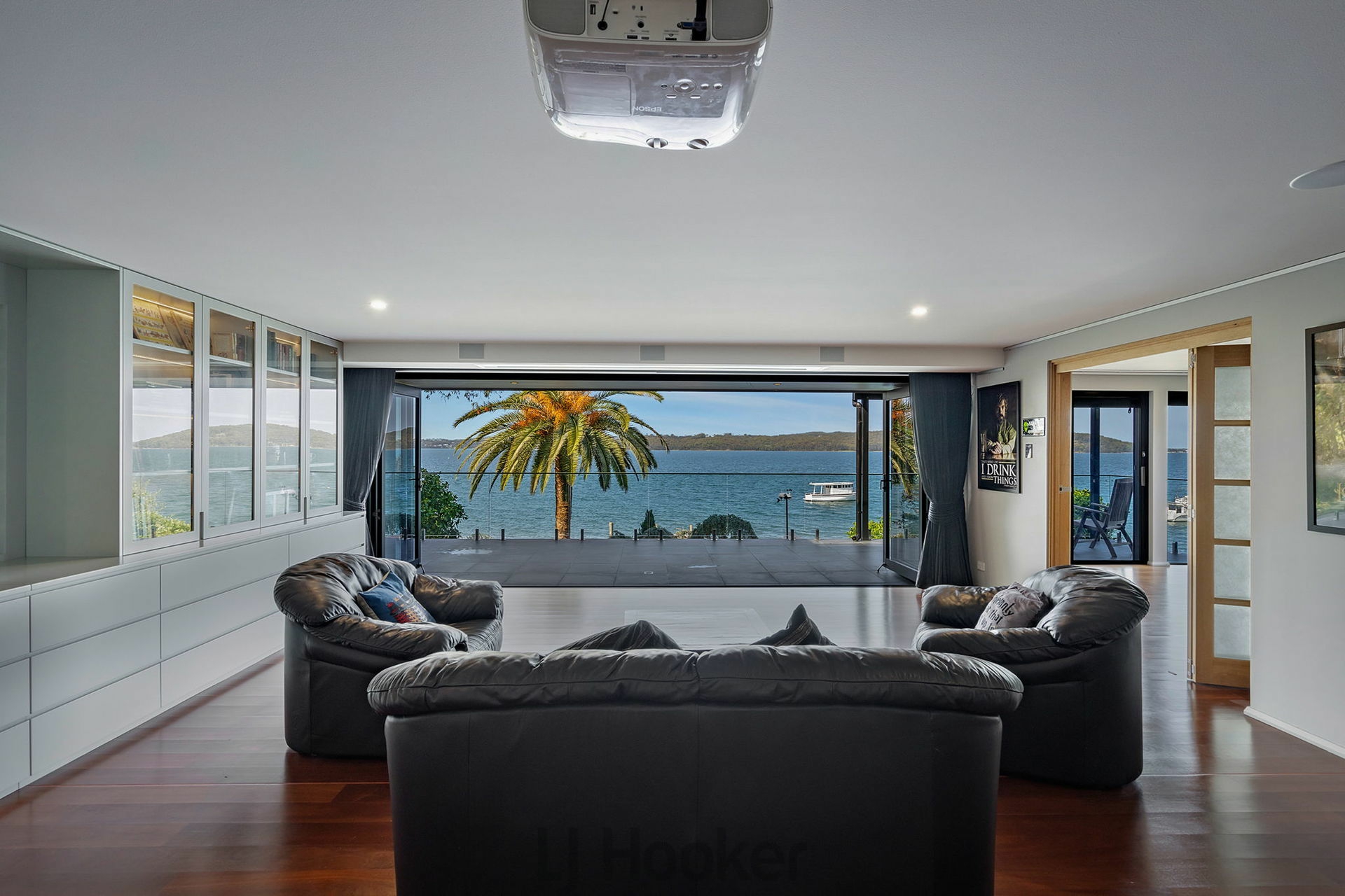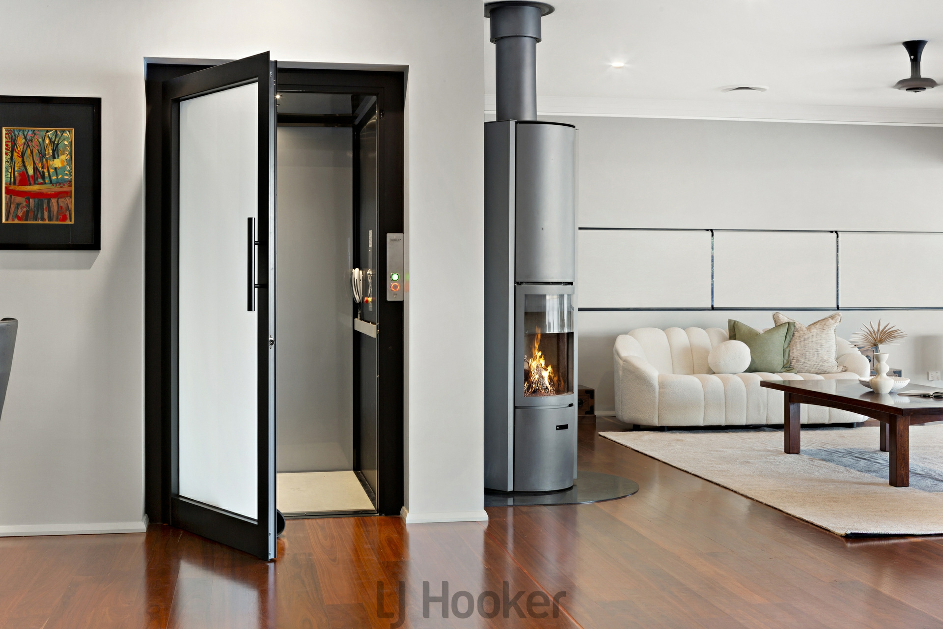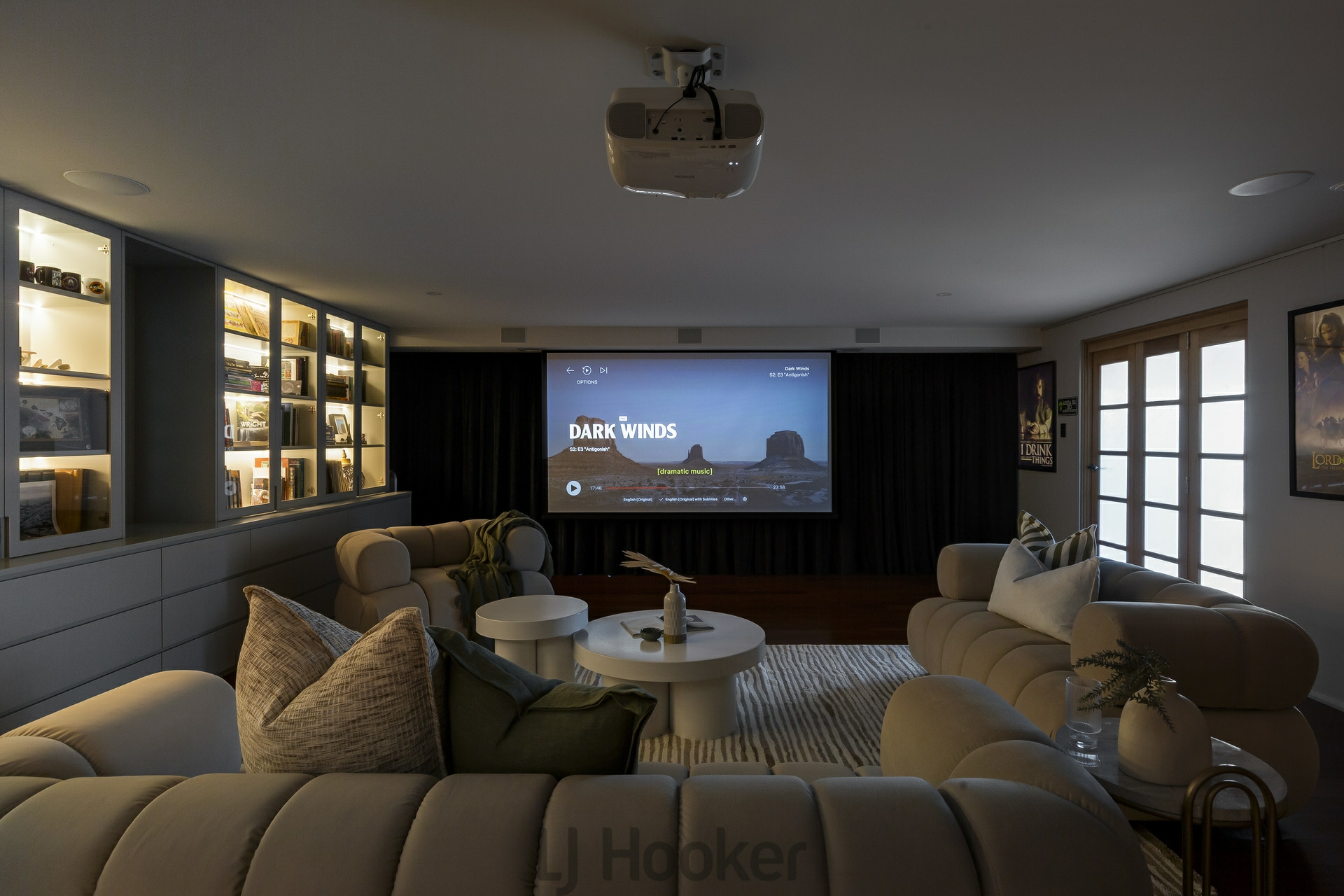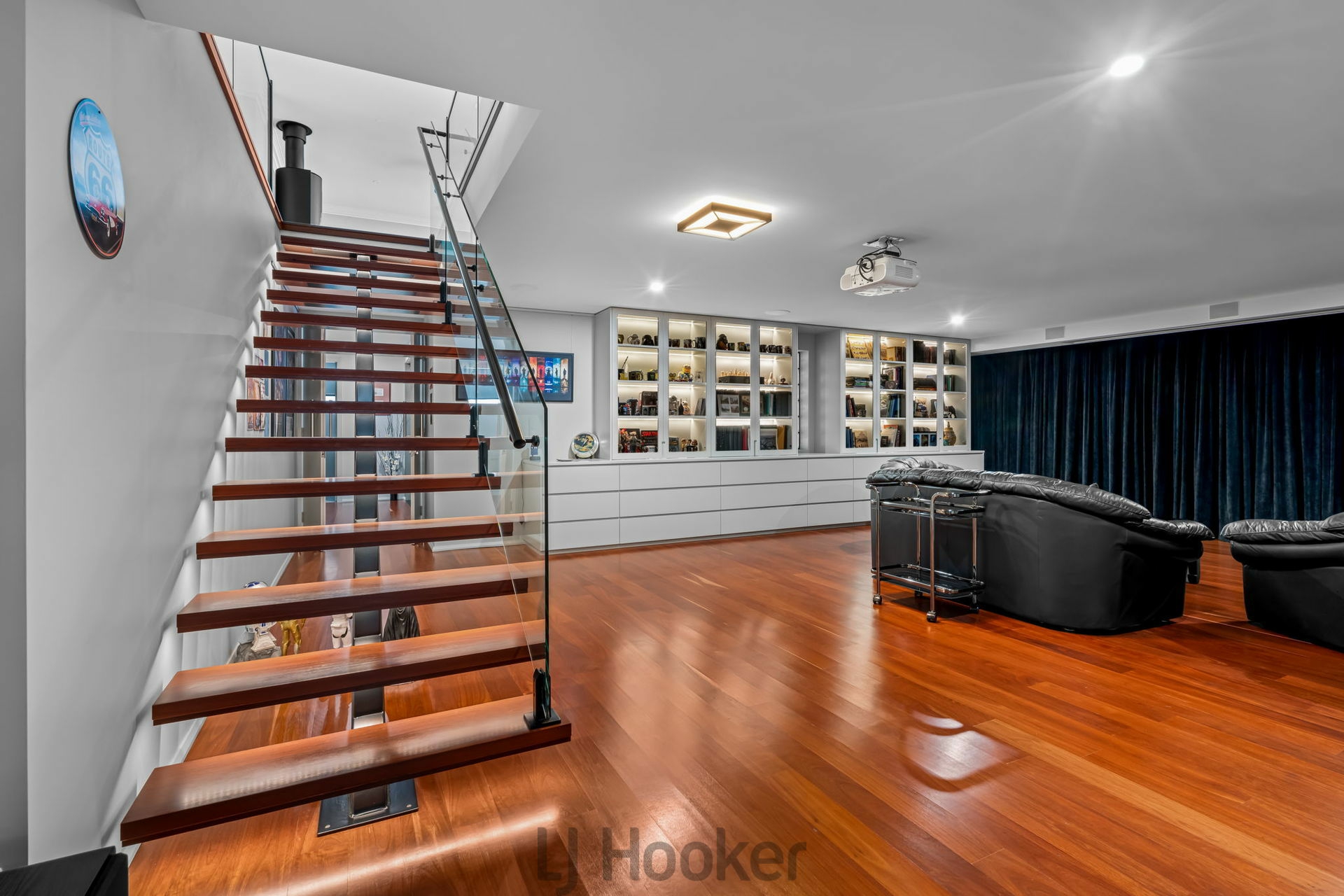 - The Downstairs living room is accessed from the lift and from a floating red mahogany staircase from the upper floor. It includes projector, drop screen, surround sound and blackout curtains creating a cinema experience.