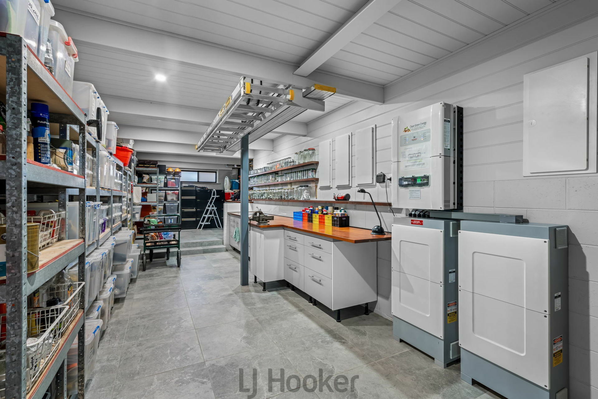 - Tiled workshop/hobby area has space and storage for all your interests and houses the electronics &media hub