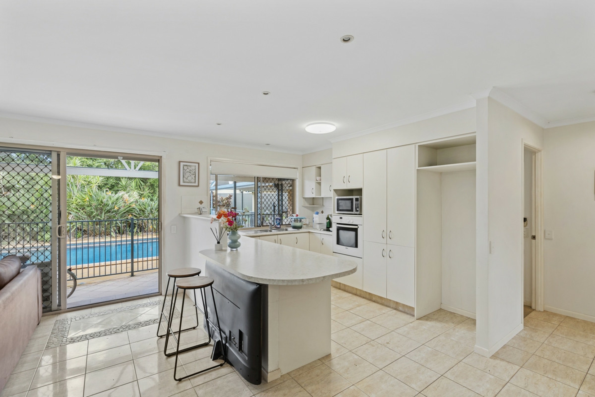 Function chef kitchen with a good amount of cupboard space and a great outlook to the pool area