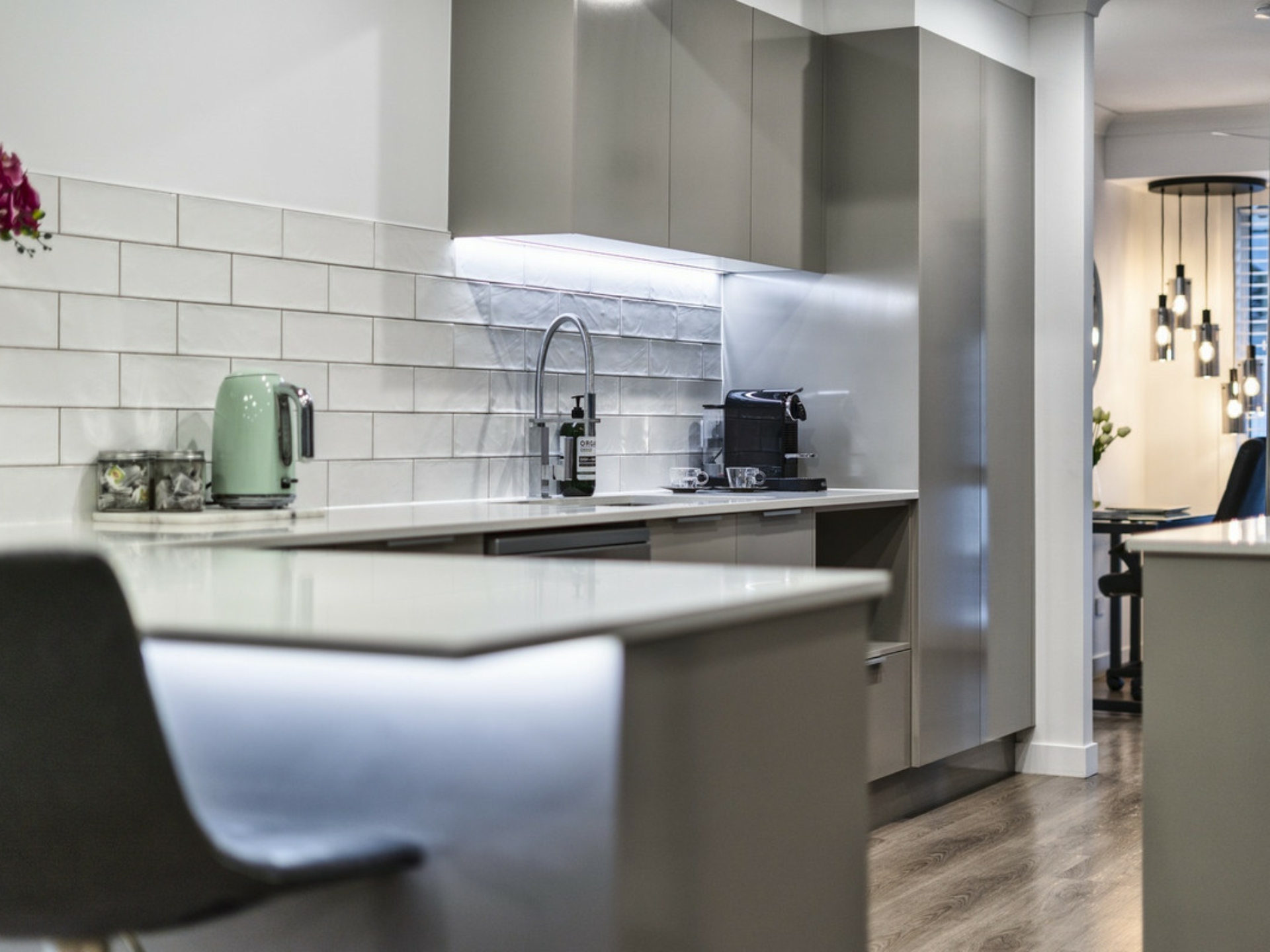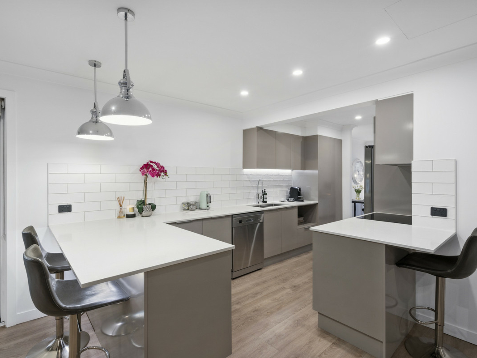 • Contemporary kitchen with plenty of storage, stone bench tops and European appliances