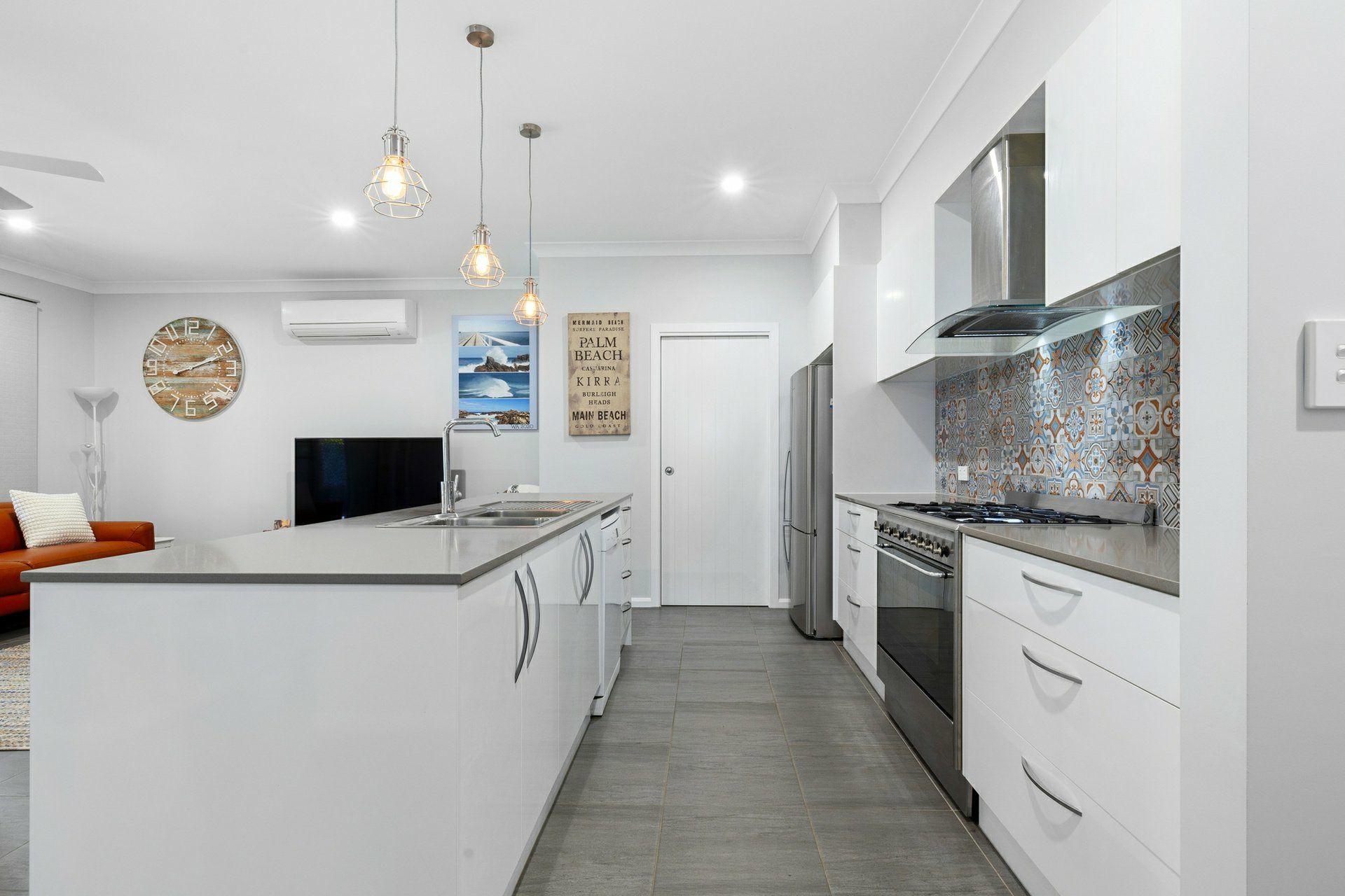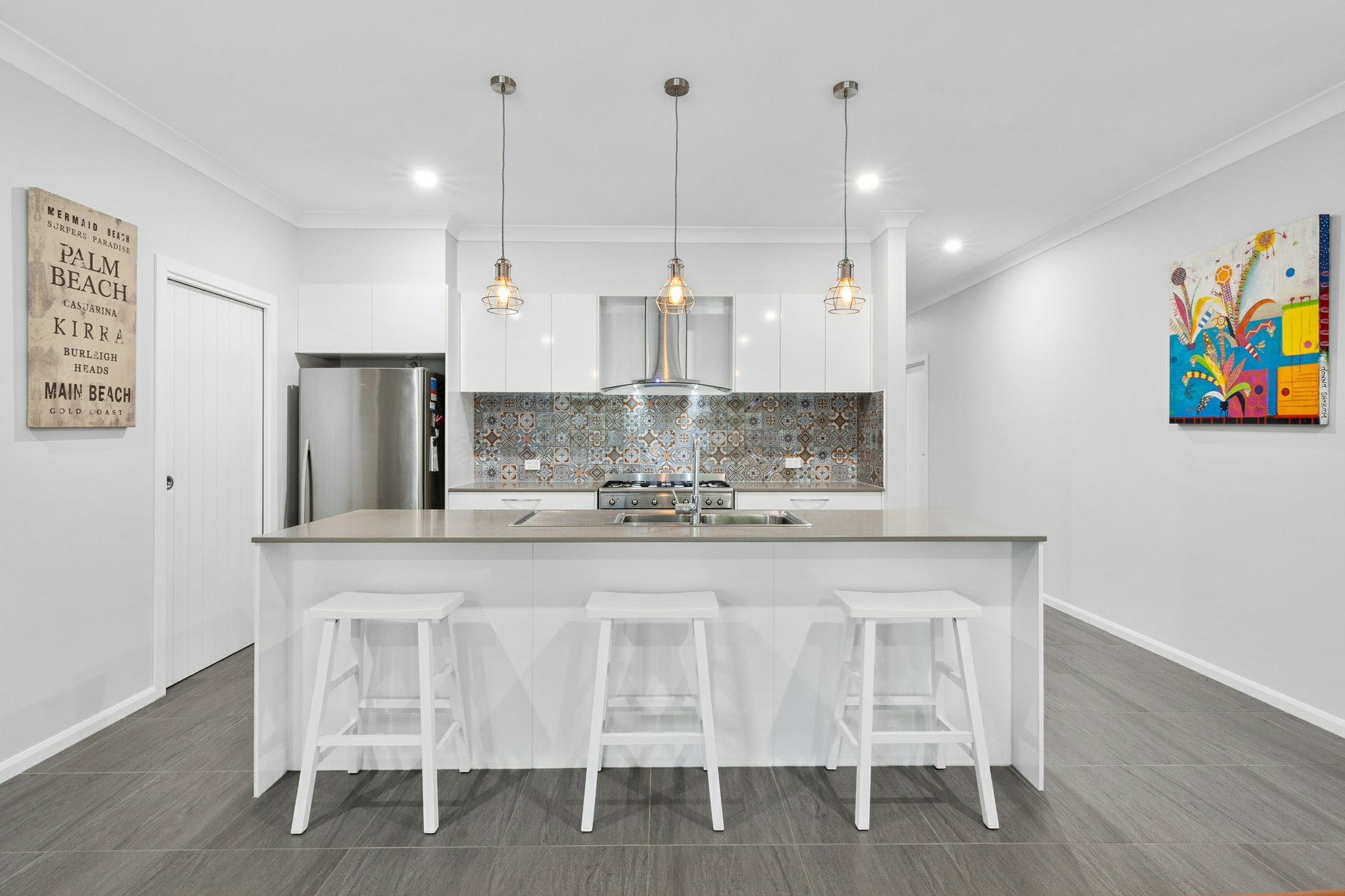 Striking high ceilings, a feature throughout the home, enhance natural light and capture summer breezes. The central kitchen features a butler’s pantry and expansive island bench, ideal for entertaining and everyday family living.