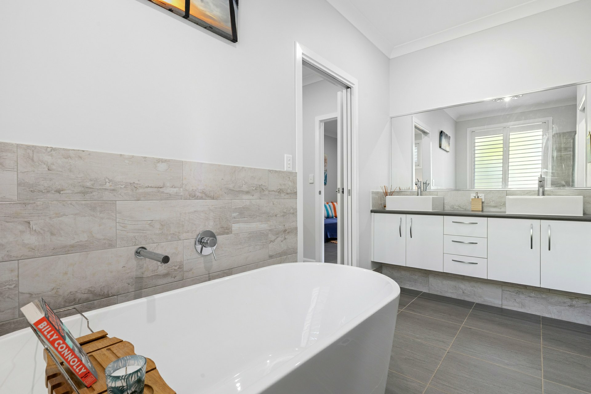 Back inside, the generous master suite features air-conditioning, walk-in robe and an ensuite with double vanity and a luxurious freestanding bath.