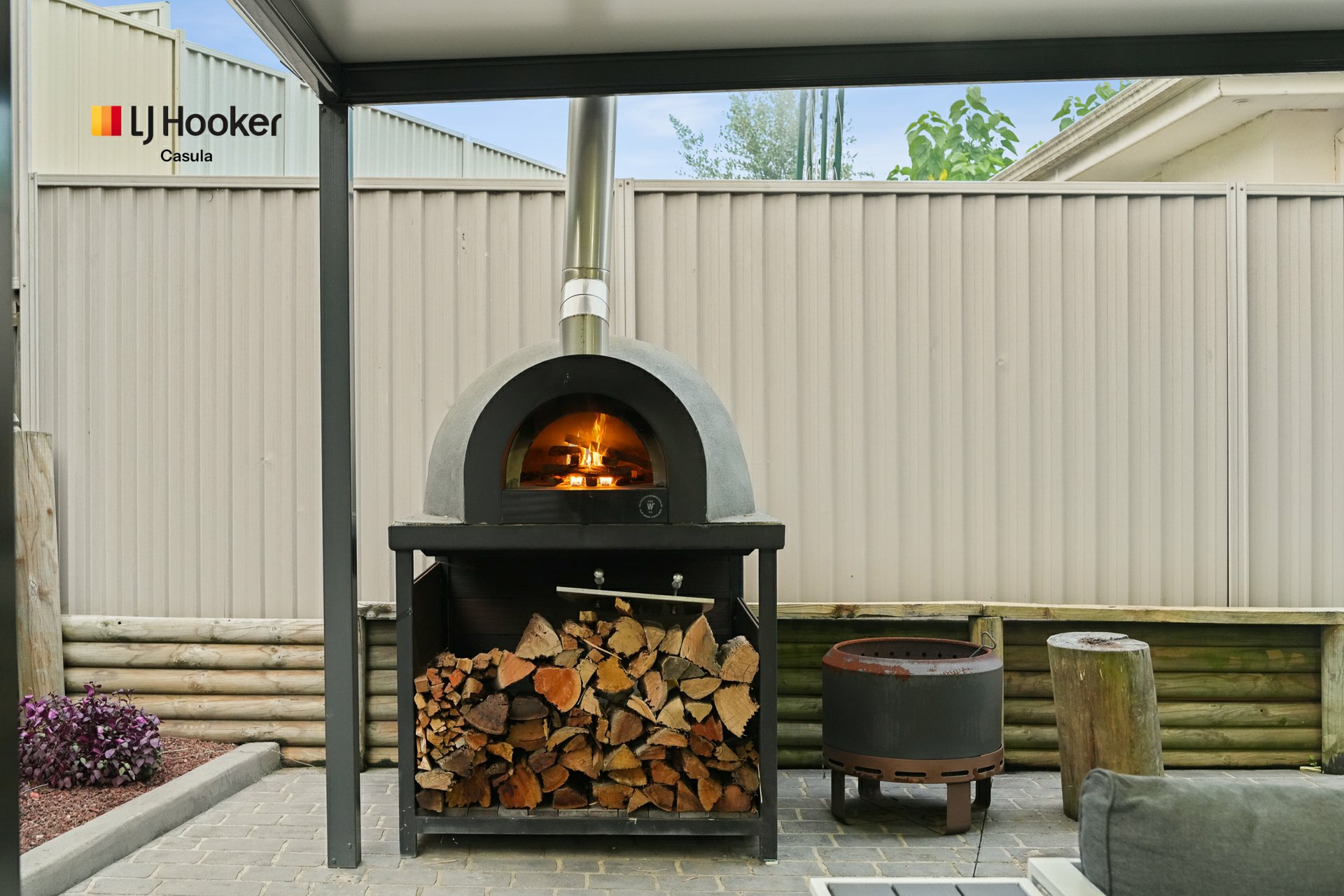 Host unforgettable gatherings under the large covered pergola complete with a built-in pizza oven — perfect for entertaining all year round.