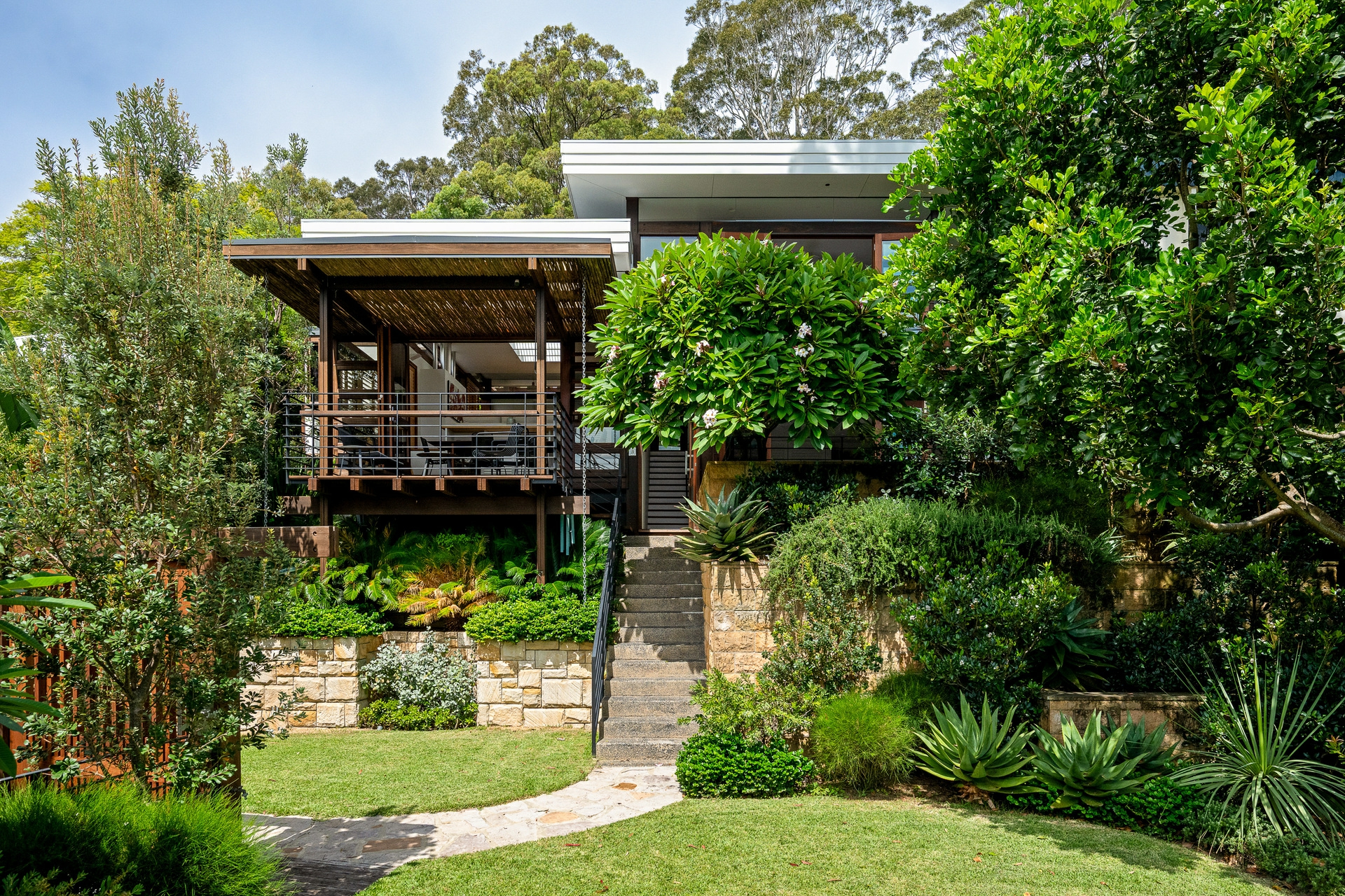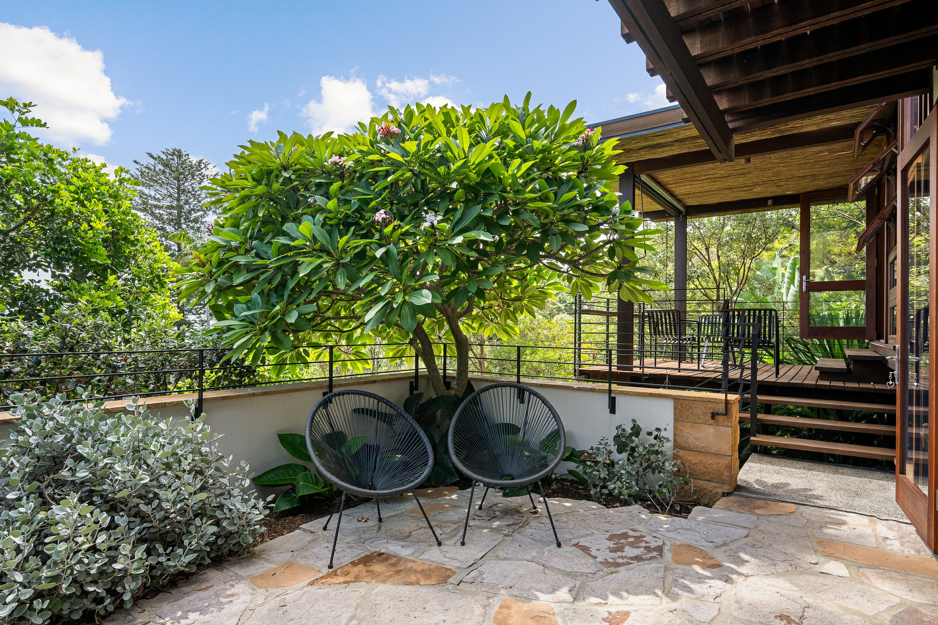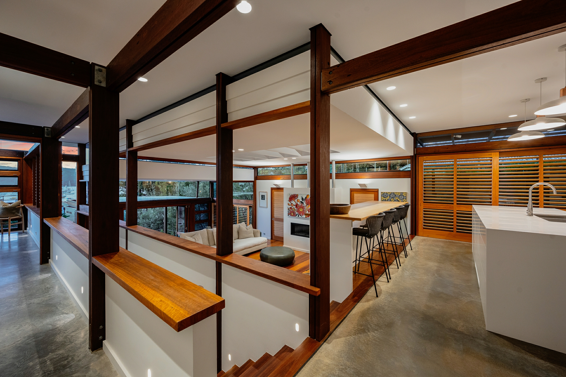 - Free-flowing layout opens to waterfront decks and sandstone terraces