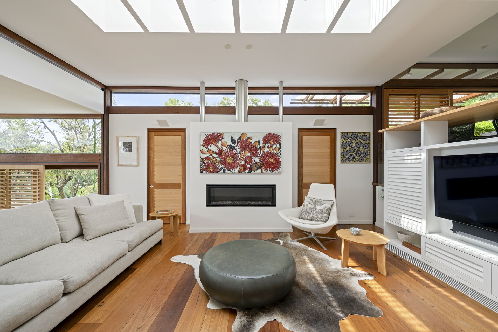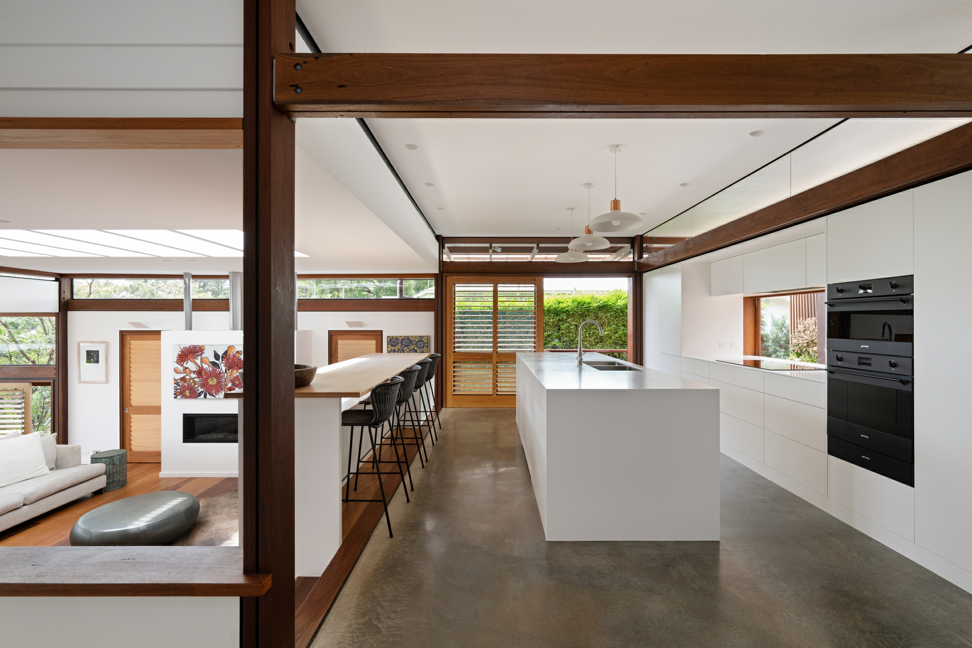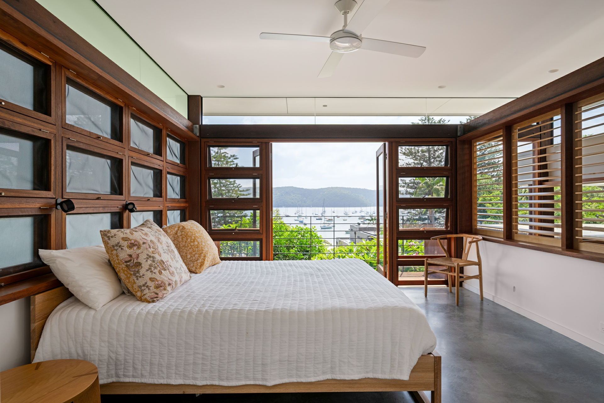 On approach, the scale of the residence is not immediately clear, the sculpted contours of the land leave only the roofline and curated gardens in view, creating a sense of unrivalled privacy paired with panoramic views across the harbour at Clareville Beach; extensive glazing frames what is a truly remarkable outlook. Light-drenched living zones under soaring ceilings are visually connected but blissfully separate with tallowwood decks providing a seamless transition between indoors and out.