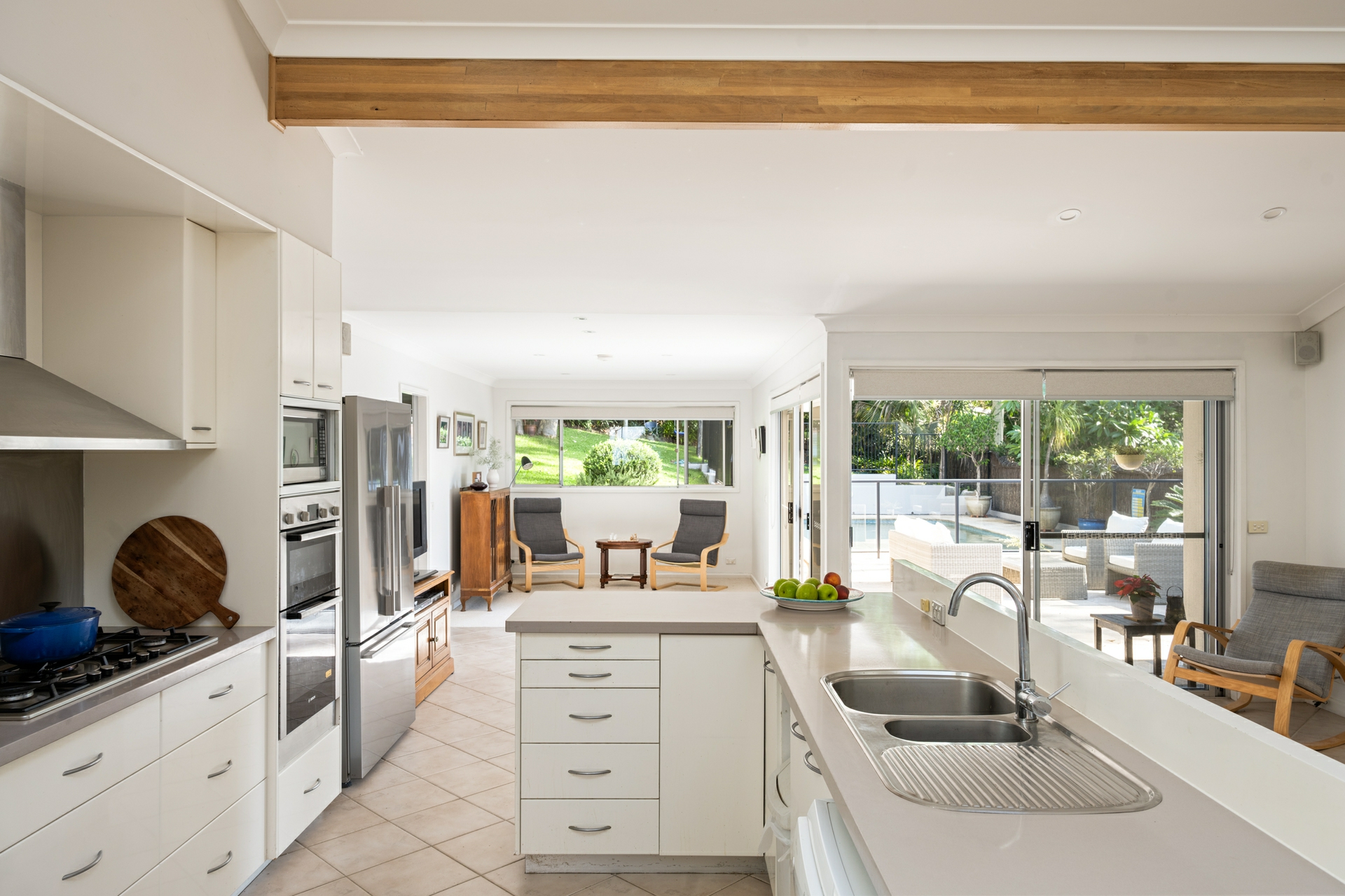 - Interiors anchored by contemporary Bosch kitchen with pool views