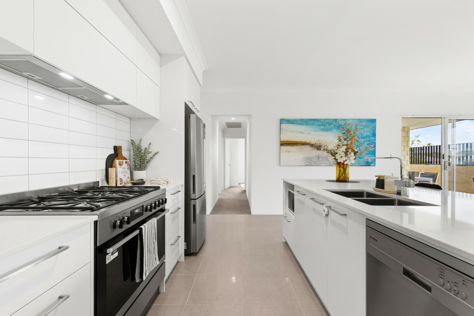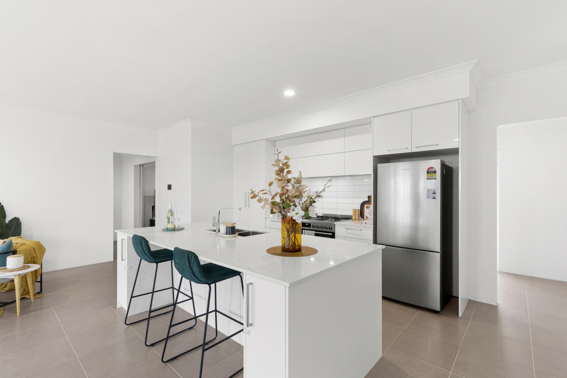 At the heart of the home, the open-plan kitchen, living and dining area is designed to bring people together. Clean lines, quality finishes, and a practical flow make it equally suited to quiet nights in or entertaining friends and family. The kitchen is finished with stone benchtops and modern appliances, giving it both presence and functionality.