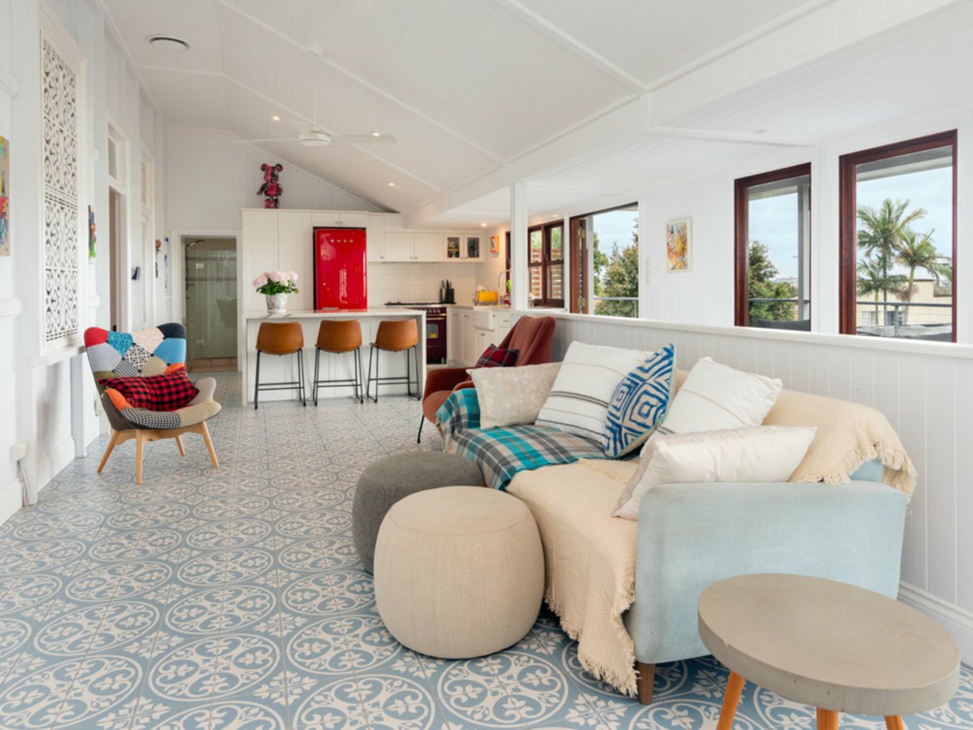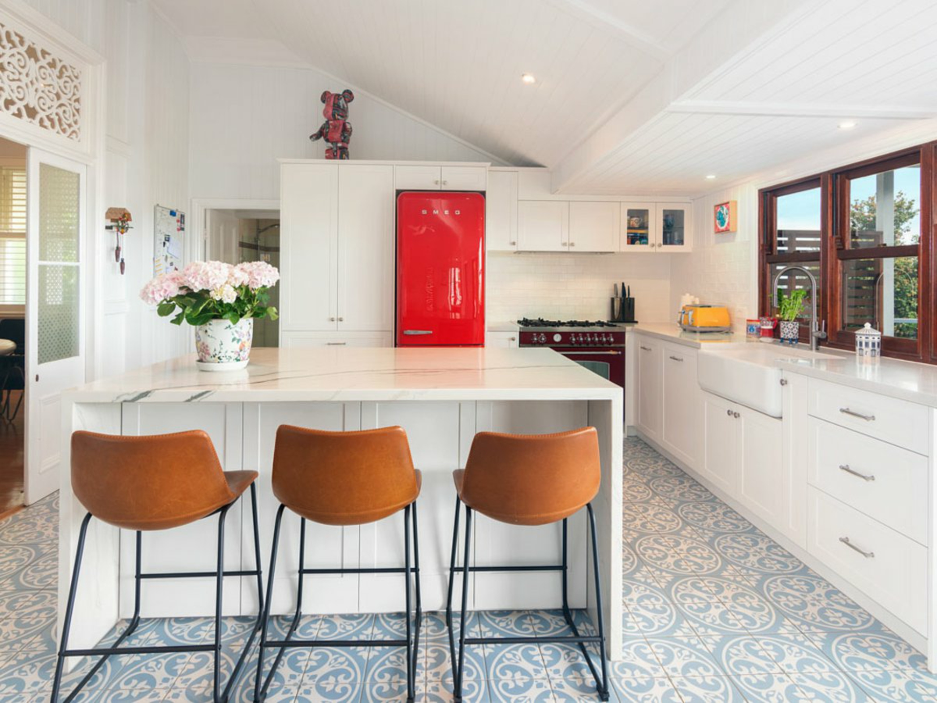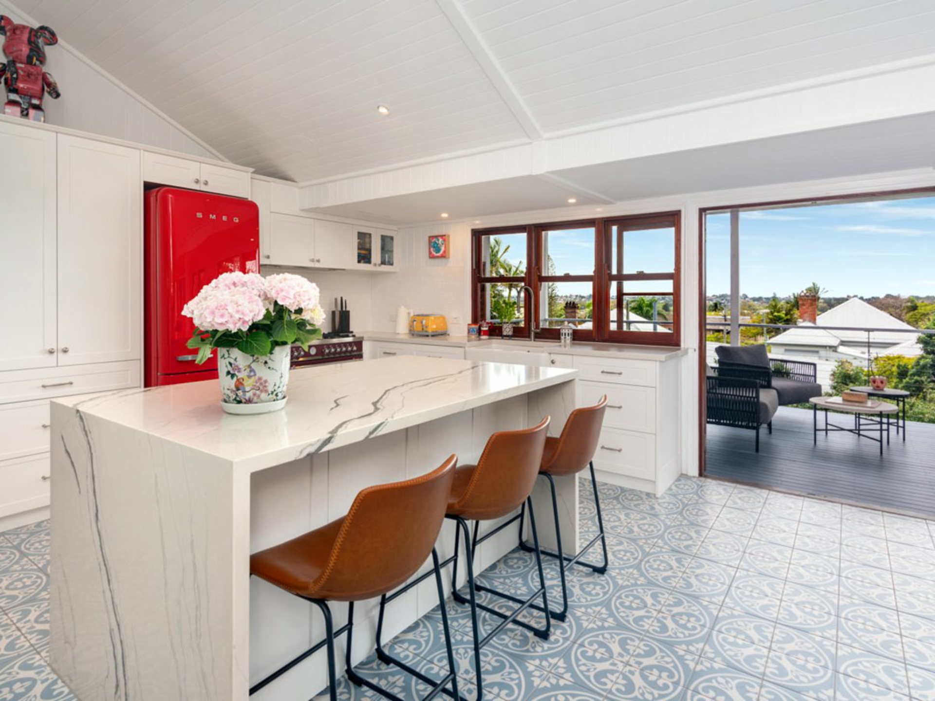 A beautiful bay window frames the sunlight and scenery from the formal living room, and encaustic tiles span the open living and dining area, featuring a warming fireplace and stunning kitchen equipped with a waterfall island bench, gas stove, and flowing floor plan extending outdoors.