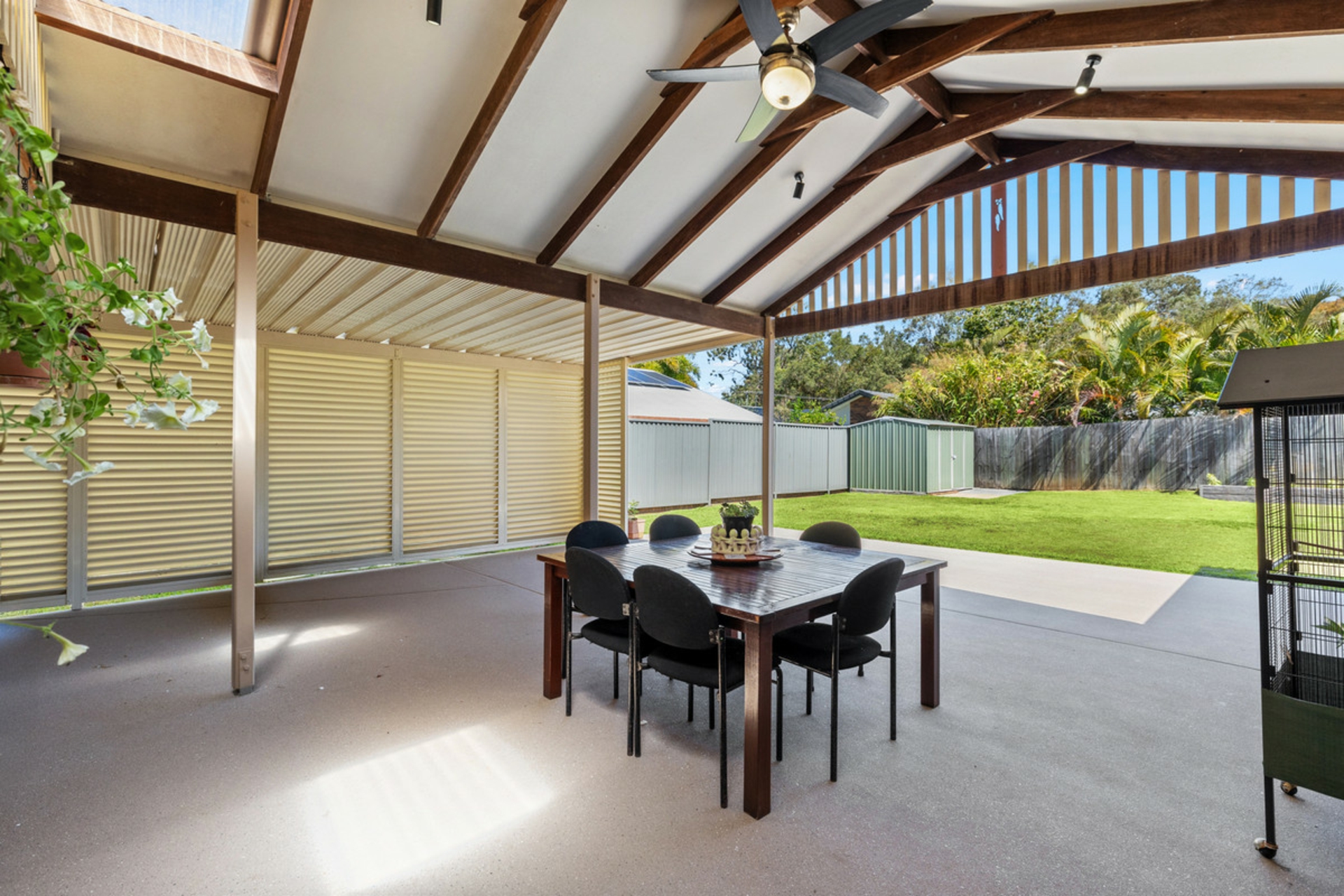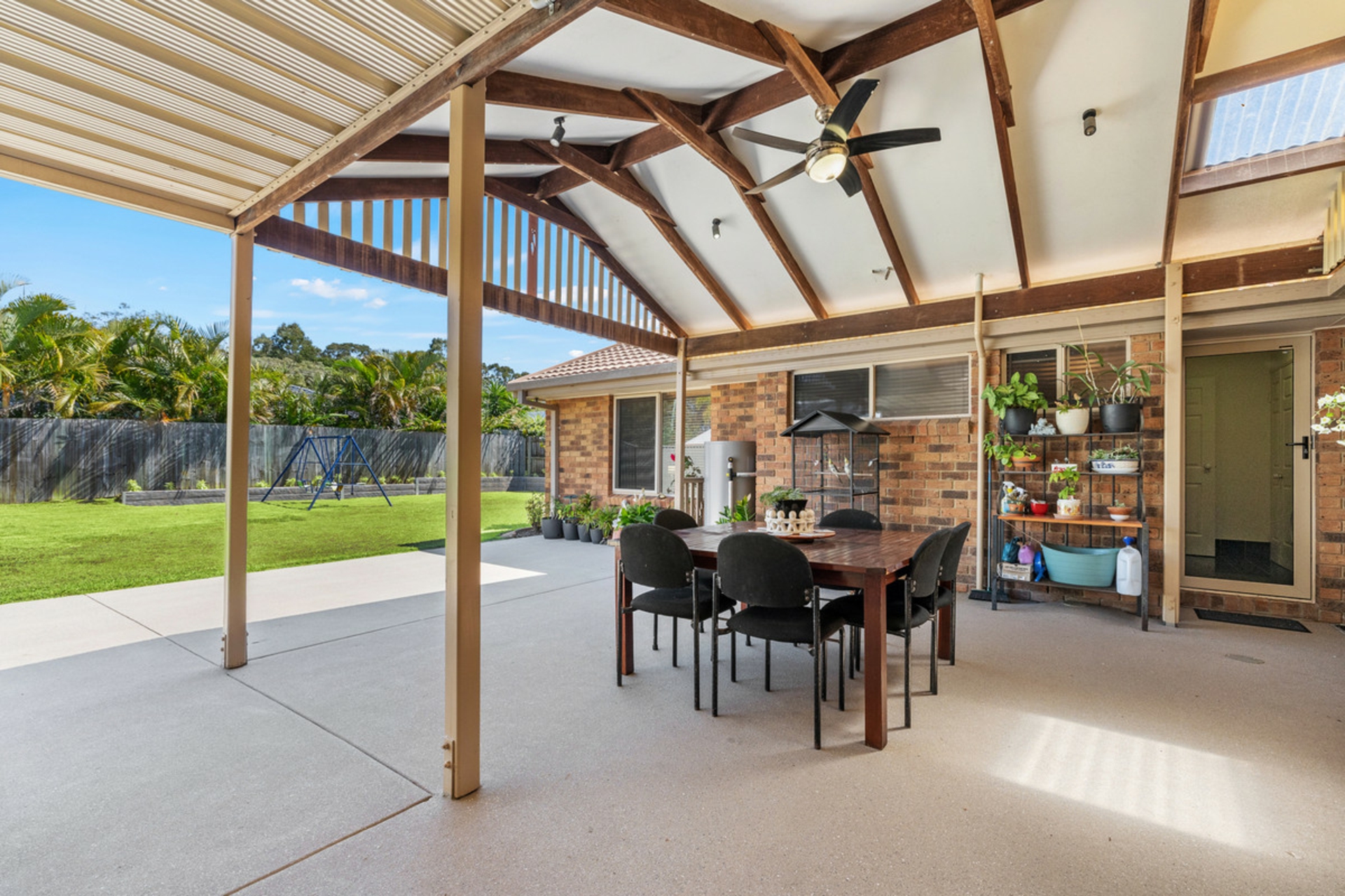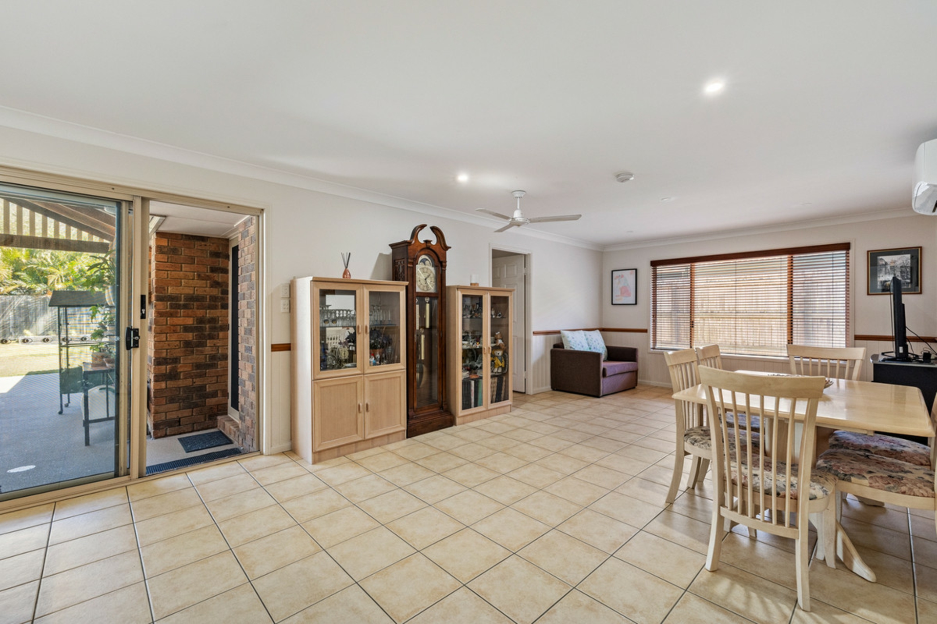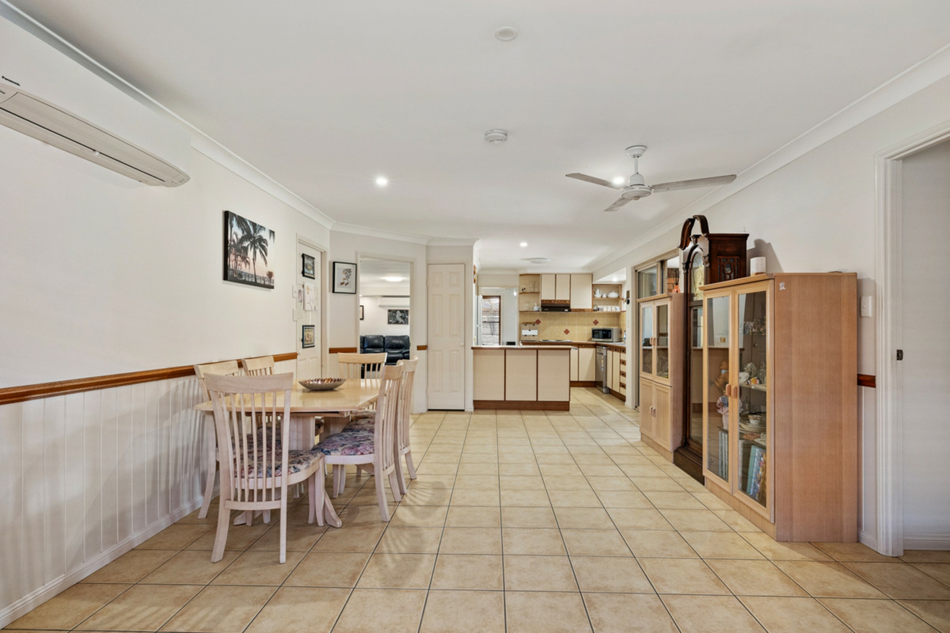 The light-filled interiors are enhanced by air-conditioning, ceiling fans, and beautiful wainscoting walls that add warmth and character to the living area. The open-plan living and dining area flows seamlessly to an enormous covered patio, ideal for entertaining family and friends all year round.