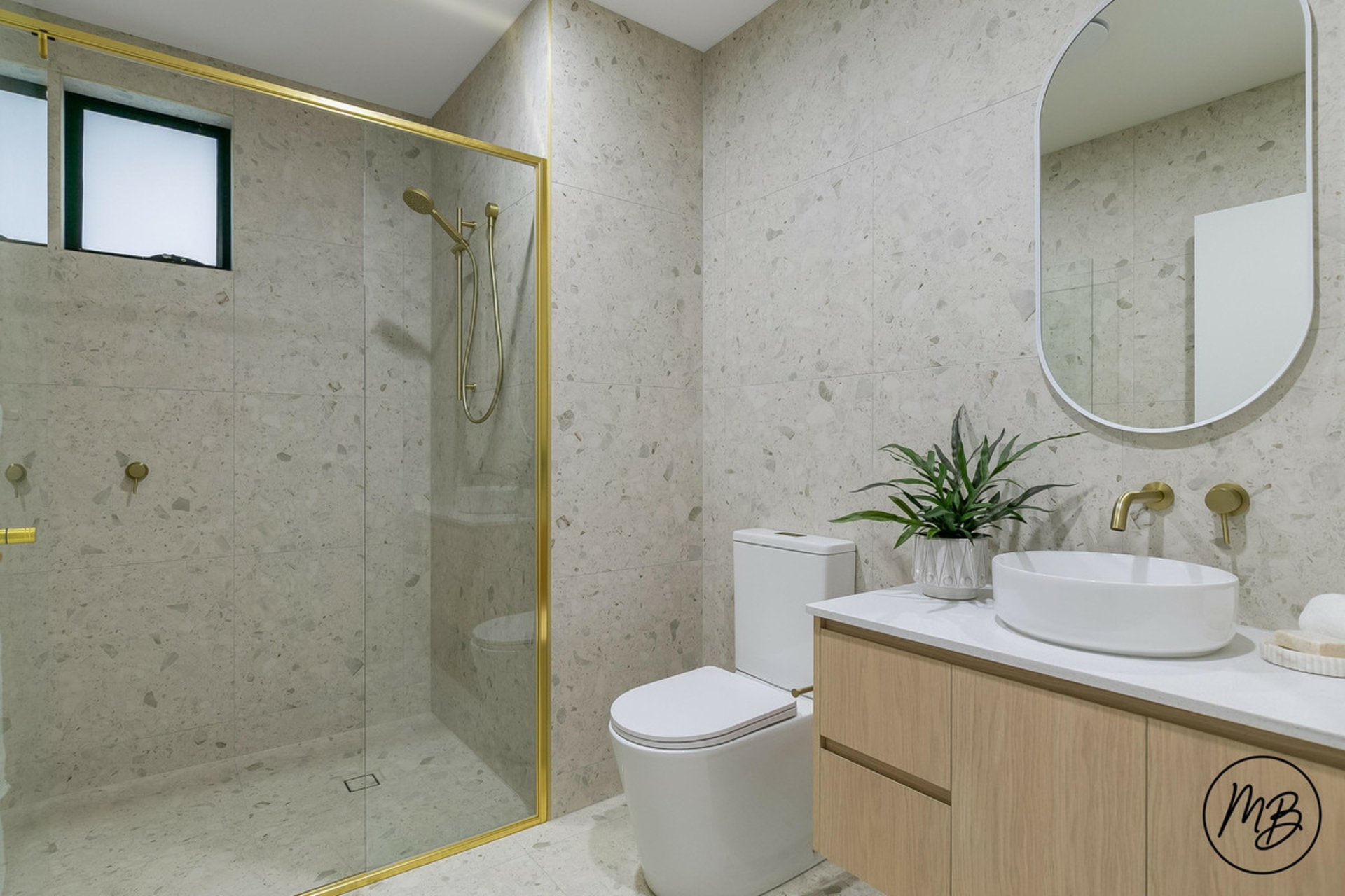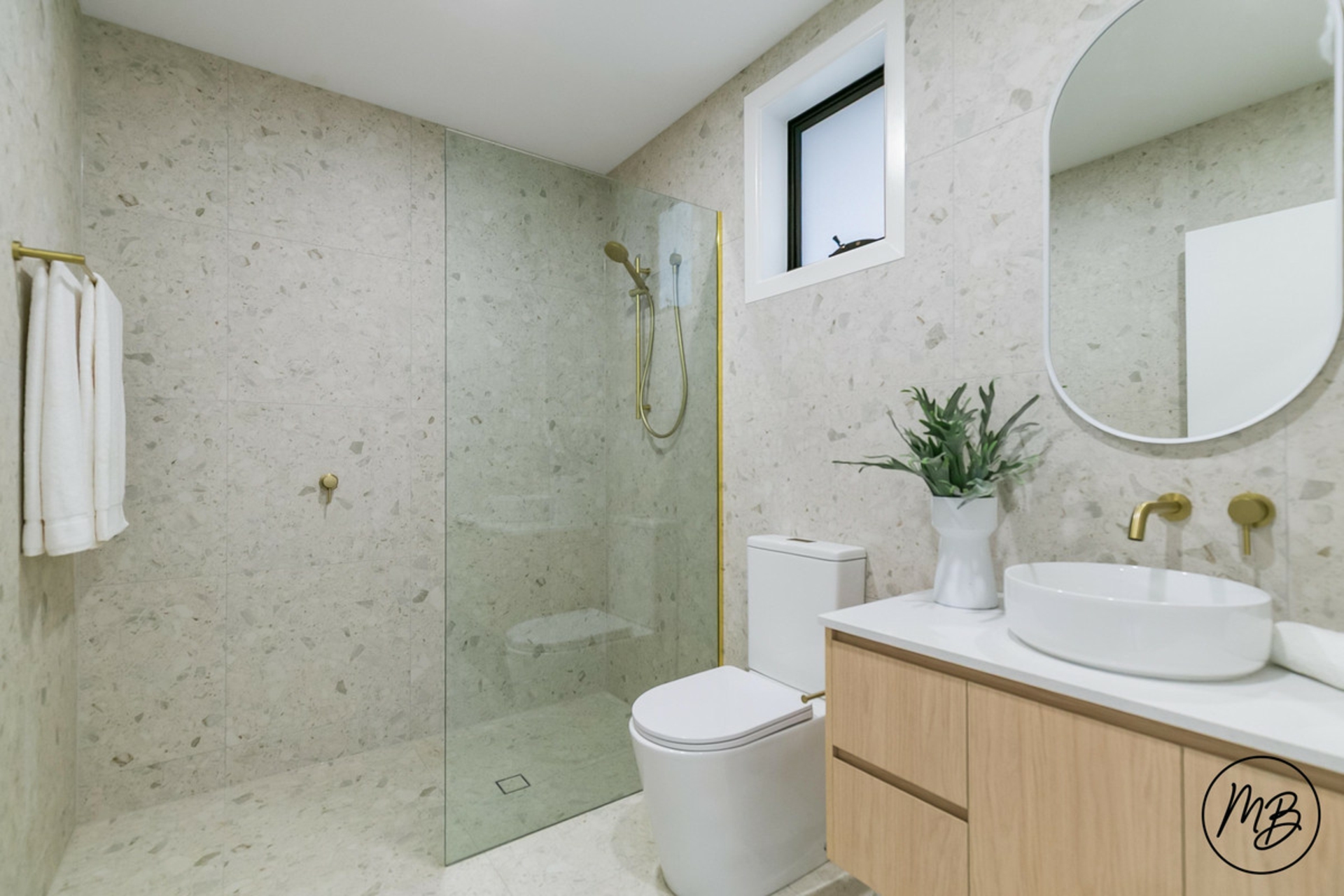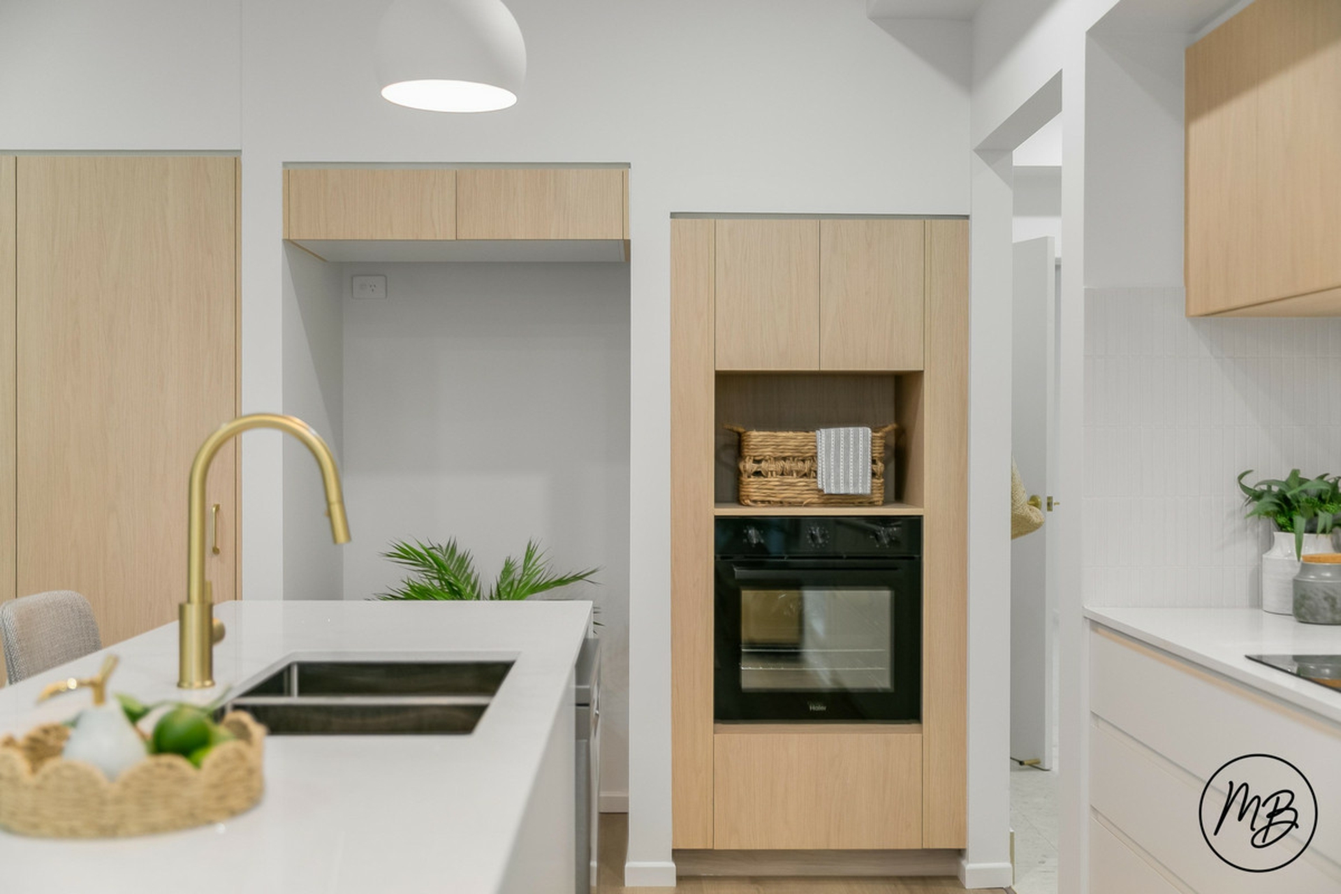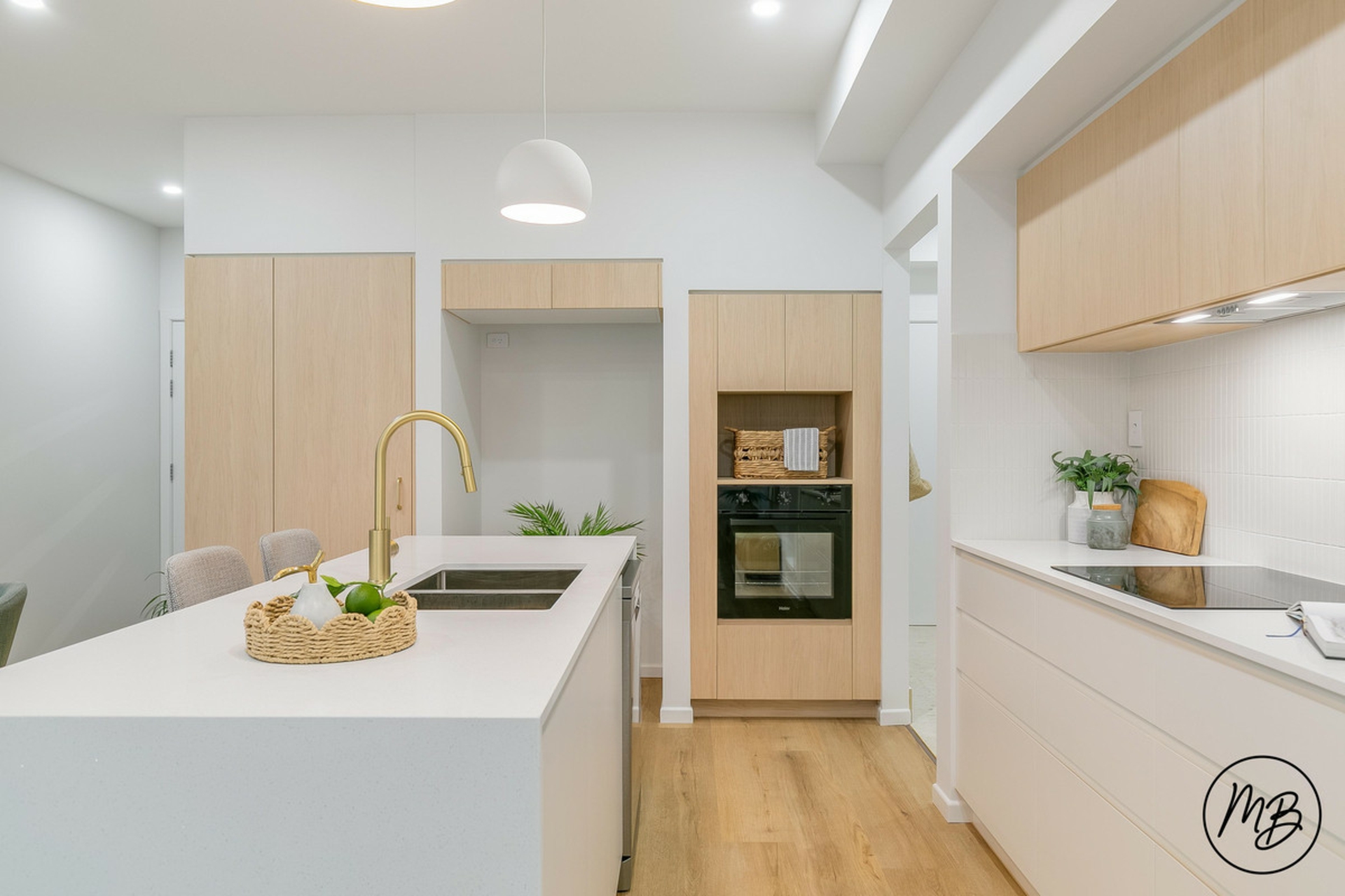 At the centre of the home, the Palm Springs�inspired kitchen sets the tone for effortless living and entertaining. Featuring YDL Star Burst stone benchtops with waterfall edges, an extended statement island, Haier oven and induction cooktop, and an integrated dishwasher, this space balances beauty with practicality.