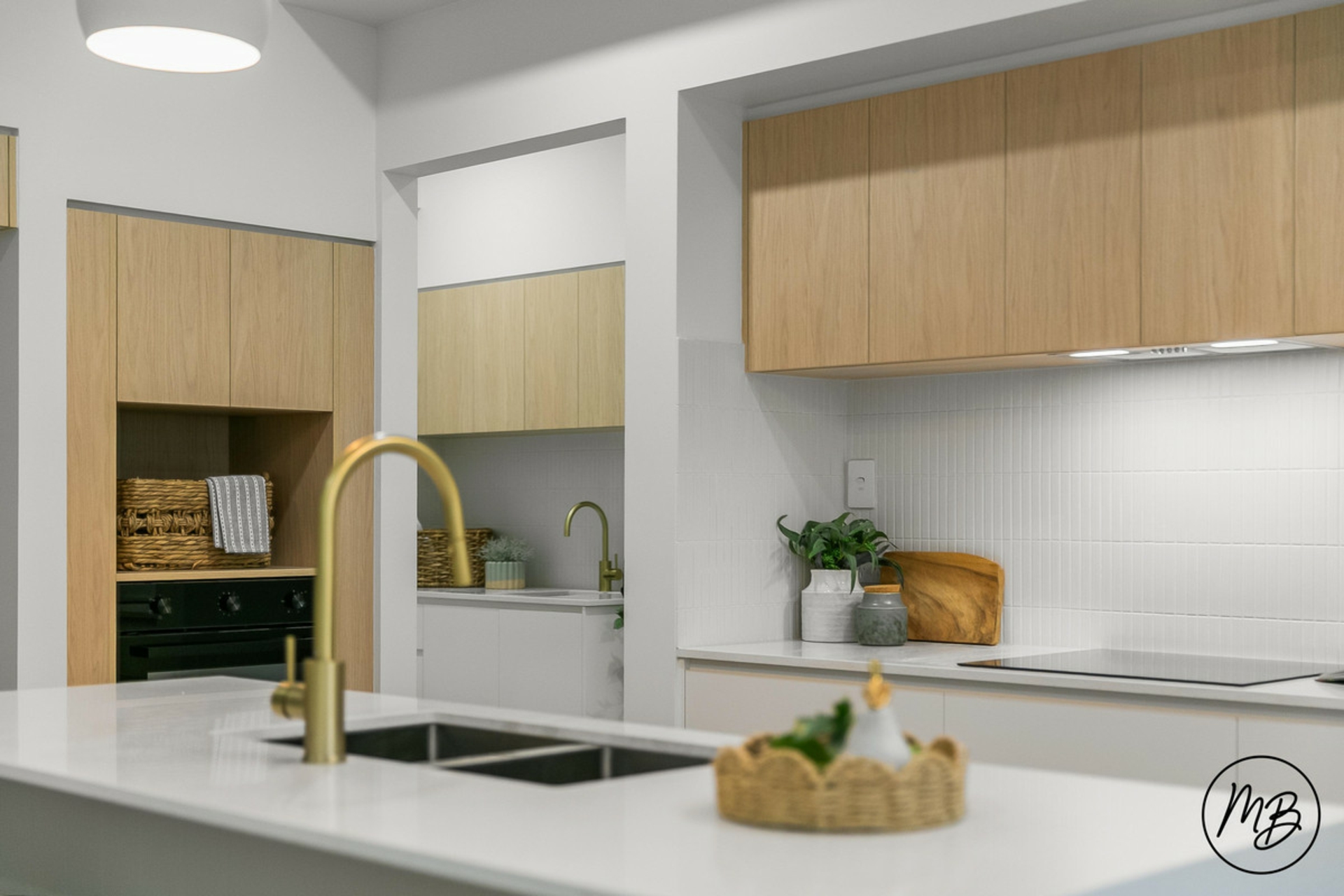 Engineered timber flooring flows seamlessly throughout, paired with brushed brass fittings and a striking Durian hardwood timber staircase, creating interiors that feel warm, tactile, and timelessly elegant.