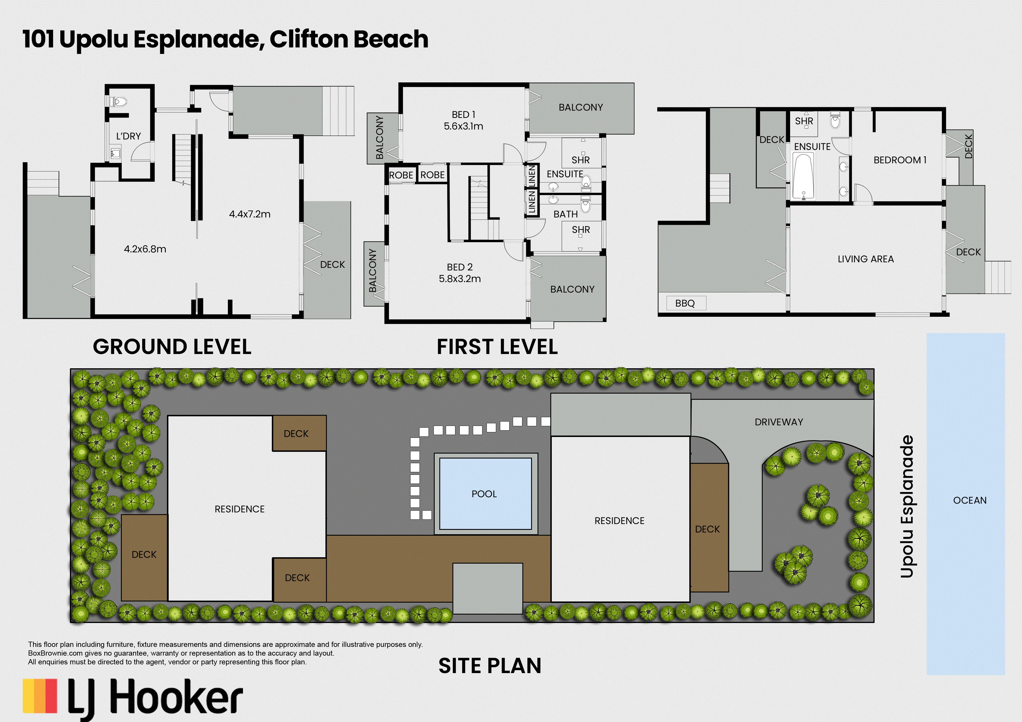 The rear pavilion is also fully self-contained with Living, Dining, and study areas downstairs. Upstairs, you will find well-appointed bedrooms, 2 bathrooms, and individual balconies with sensational ocean views, air conditioning, and ceiling fans for year-round comfort.