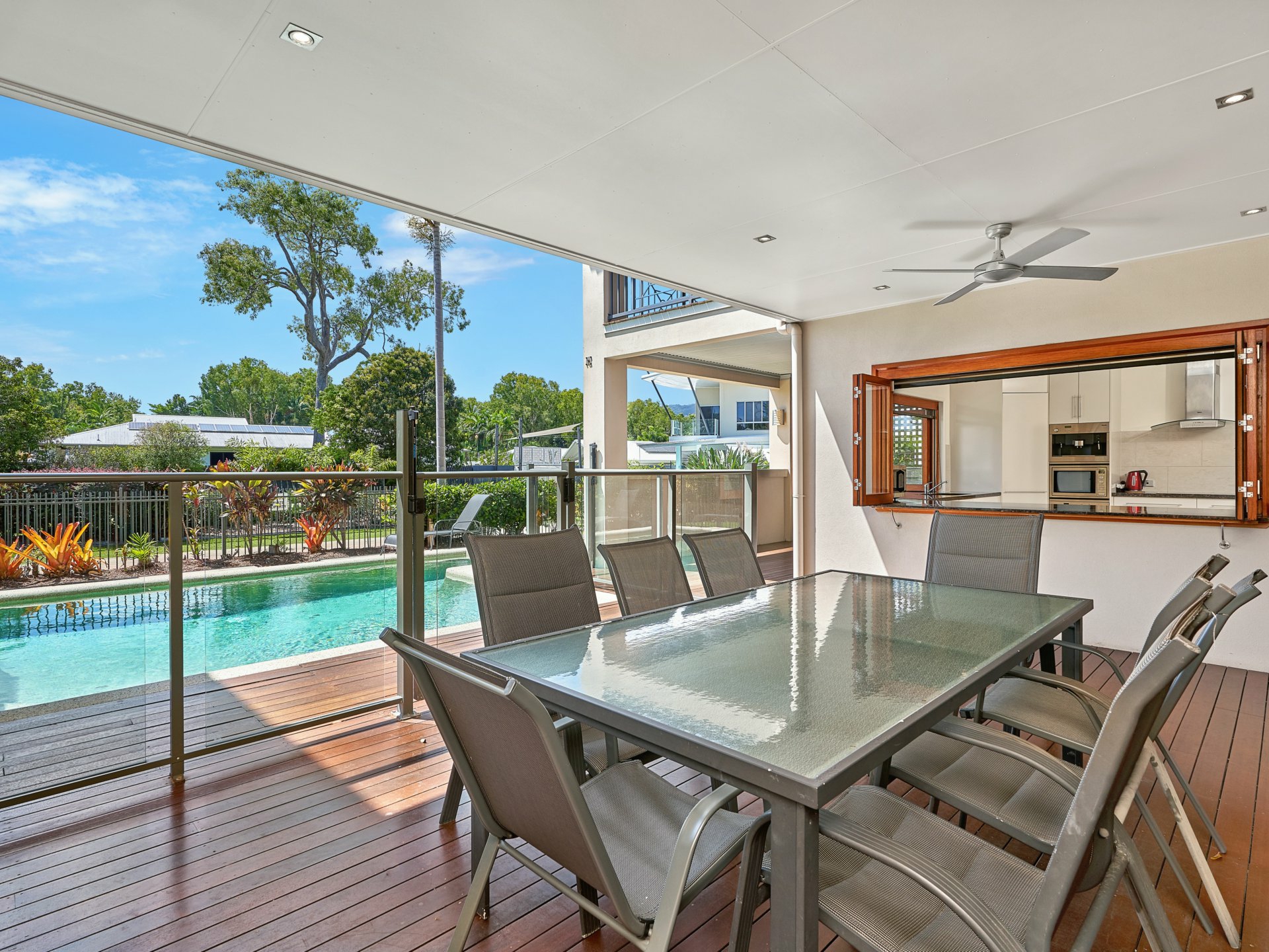 • Modern Kitchen finished with Porcelain tiles, marble bench tops, built in Coffee Machine complete with a duel servery to the undercover entertainment area.