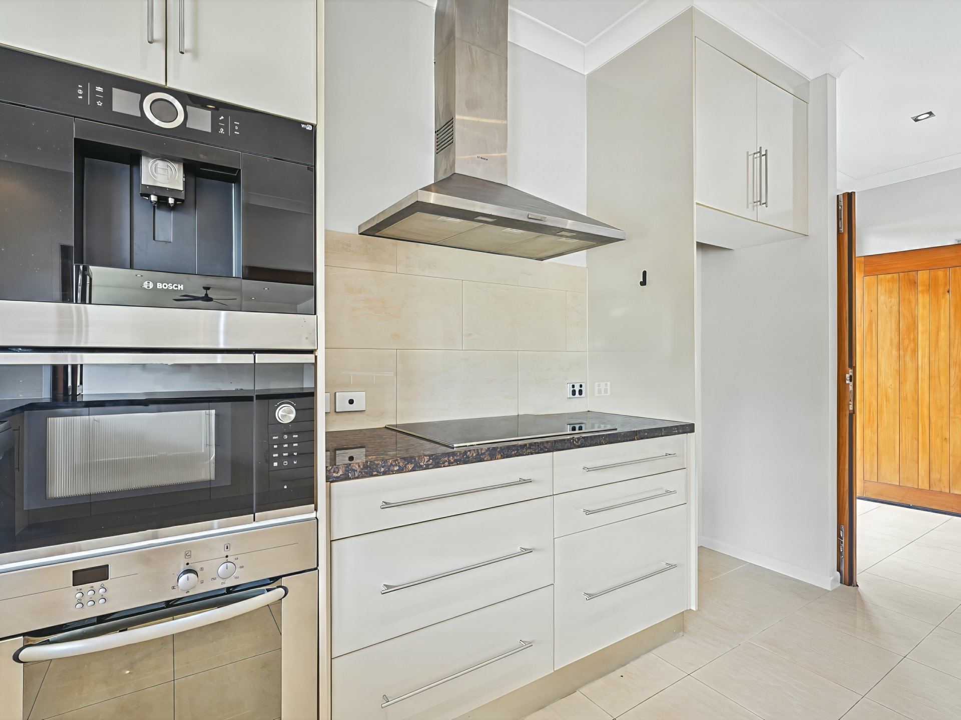 • Modern designer kitchen with porcelain tiles, marble benchtops, built-in coffee machine and dual servery to the undercover outdoor entertaining area