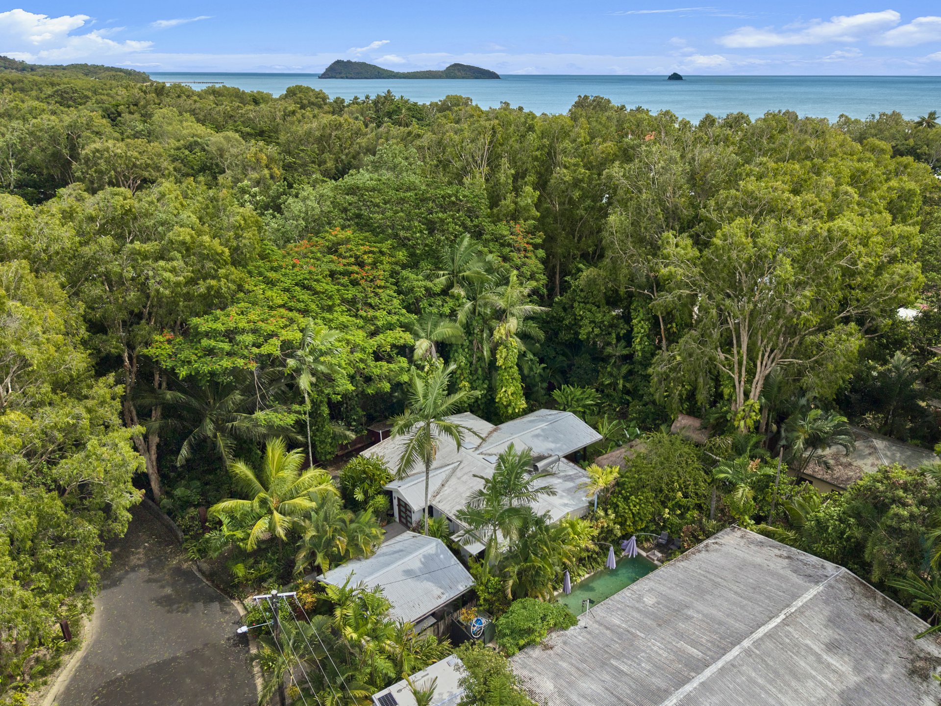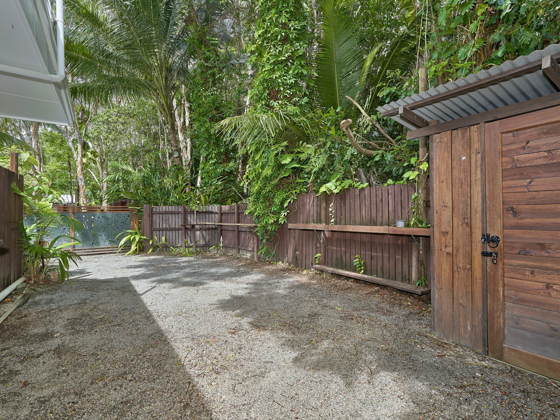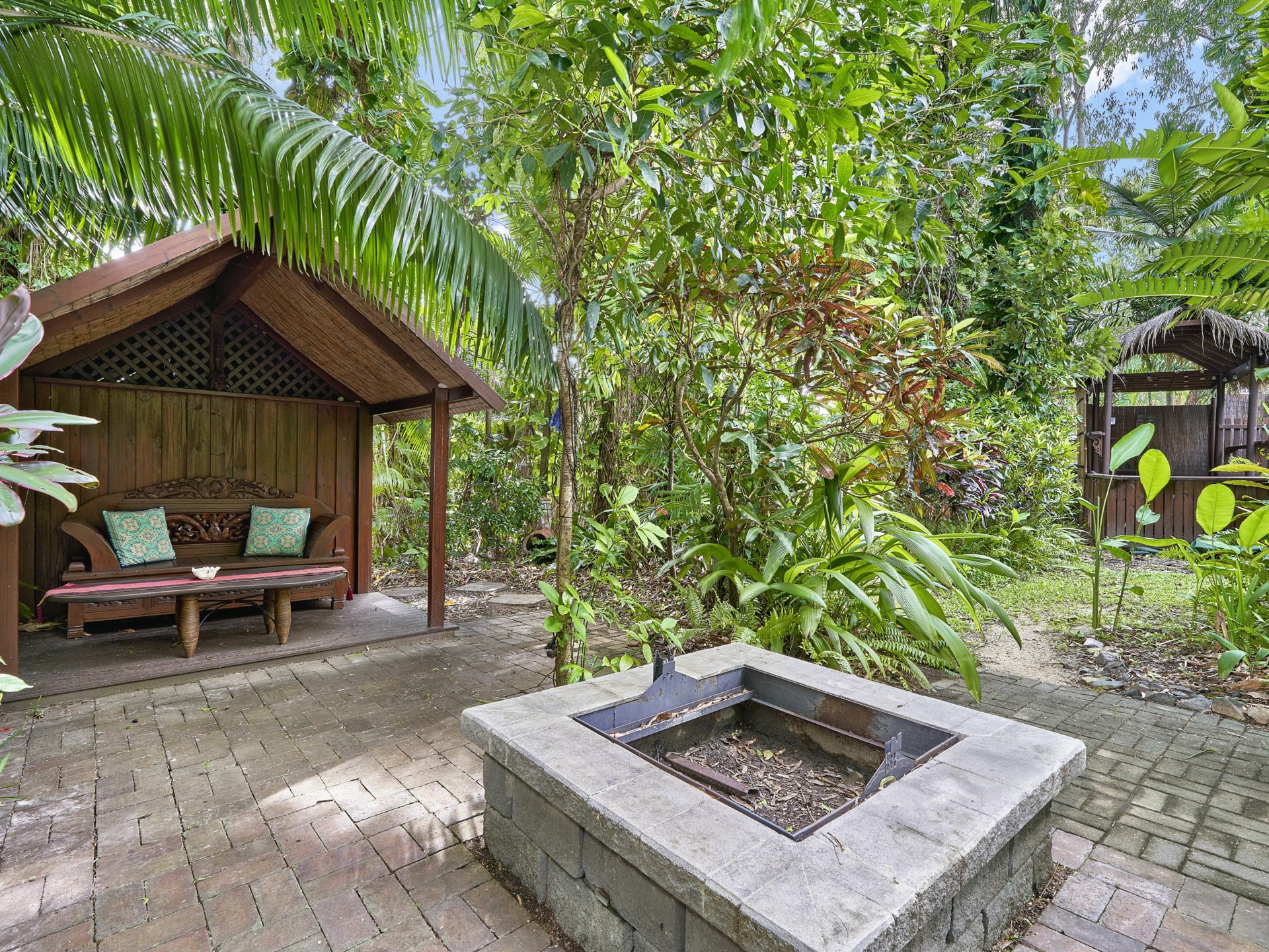 Multiple sheds at the rear for storage of garden tools to keep this tropical oasis in tip-top condition
