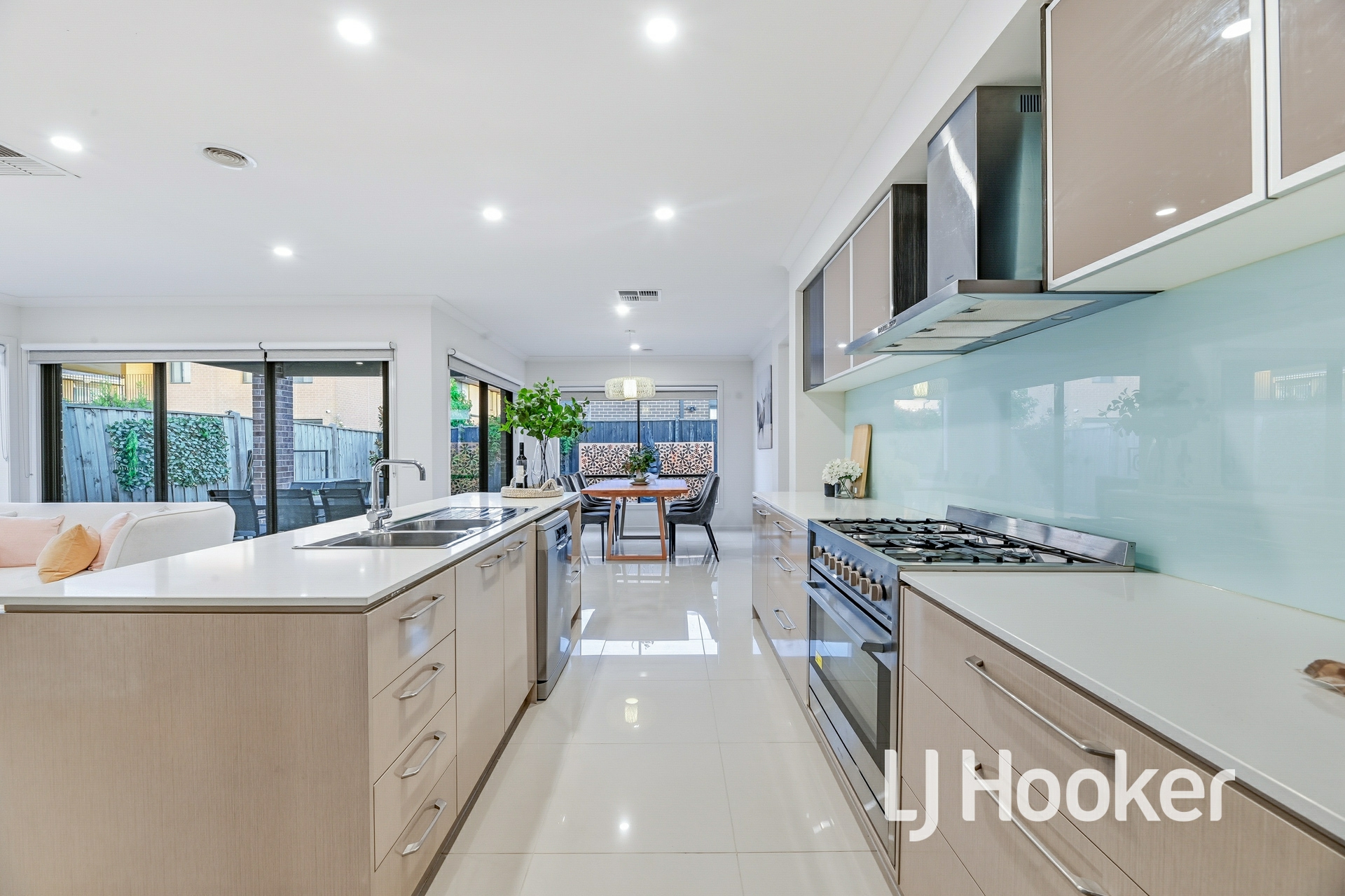 At the heart of the home, expansive open-plan living and dining spaces seamlessly connect with a stylish, modern kitchen designed for both everyday living and entertaining. The kitchen is appointed with a large island bench, ample cabinetry, walk-in pantry, 900mm stainless steel gas appliances and dishwasher, combining form and function with effortless elegance.
