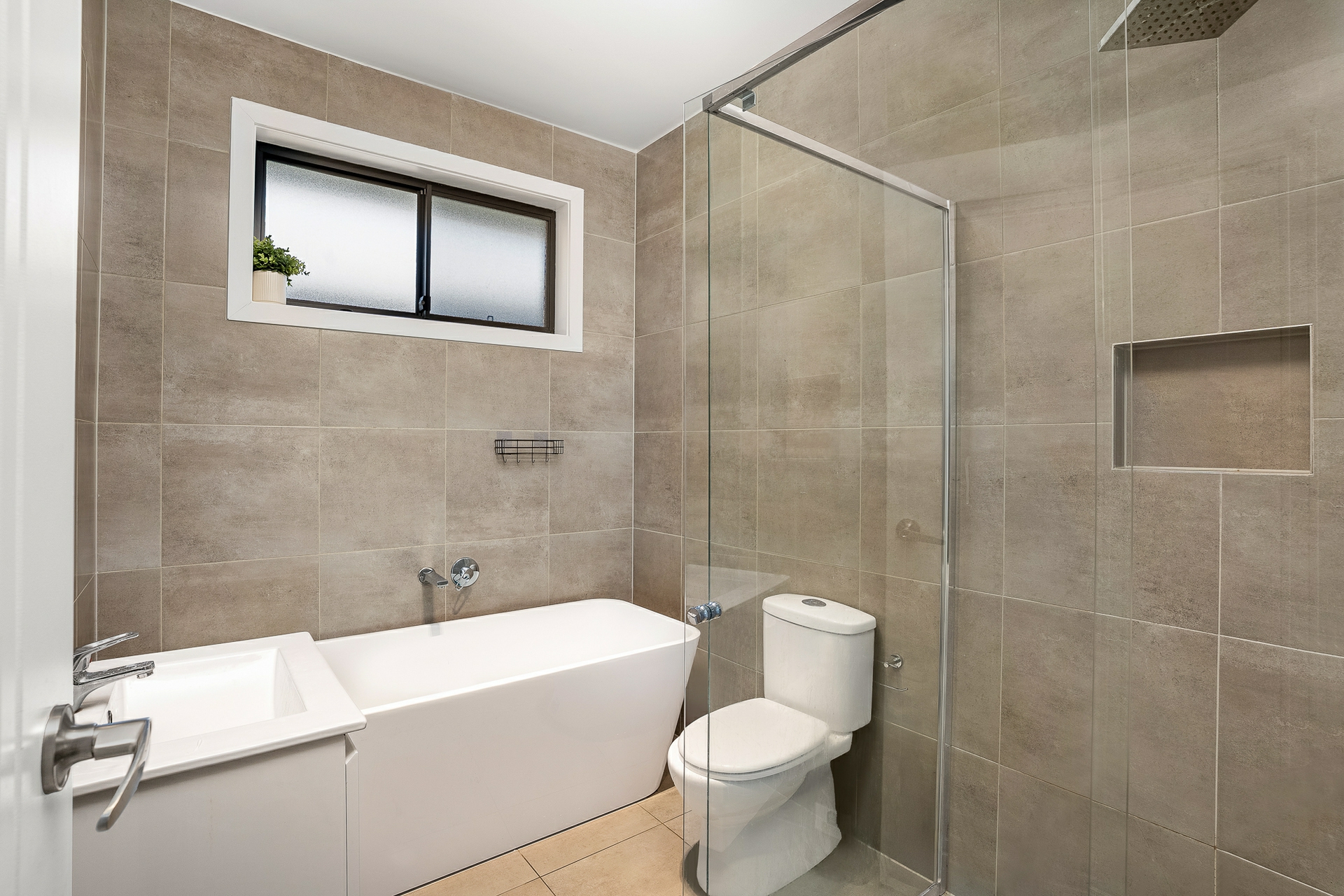 The main bedroom features timber flooring, a walk-in robe and ensuite bathroom, while the remaining bedrooms include built-in robes and are serviced by a main bathroom tiled to the ceiling.