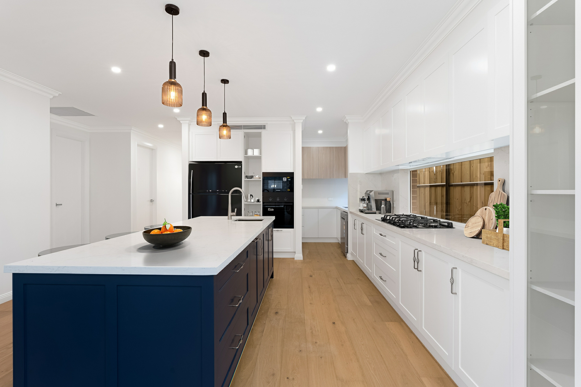 Step inside to an inviting open-plan layout that seamlessly connects the kitchen, dining and living spaces. The designer shaker kitchen is a standout, featuring 40 mm marble-finish stone benchtops, integrated appliances including microwave, dishwasher, a 900mm gas stove, ducted rangehood, wall-mounted ovens, dishwasher and a walk-in butler's pantry with additional cooktop.