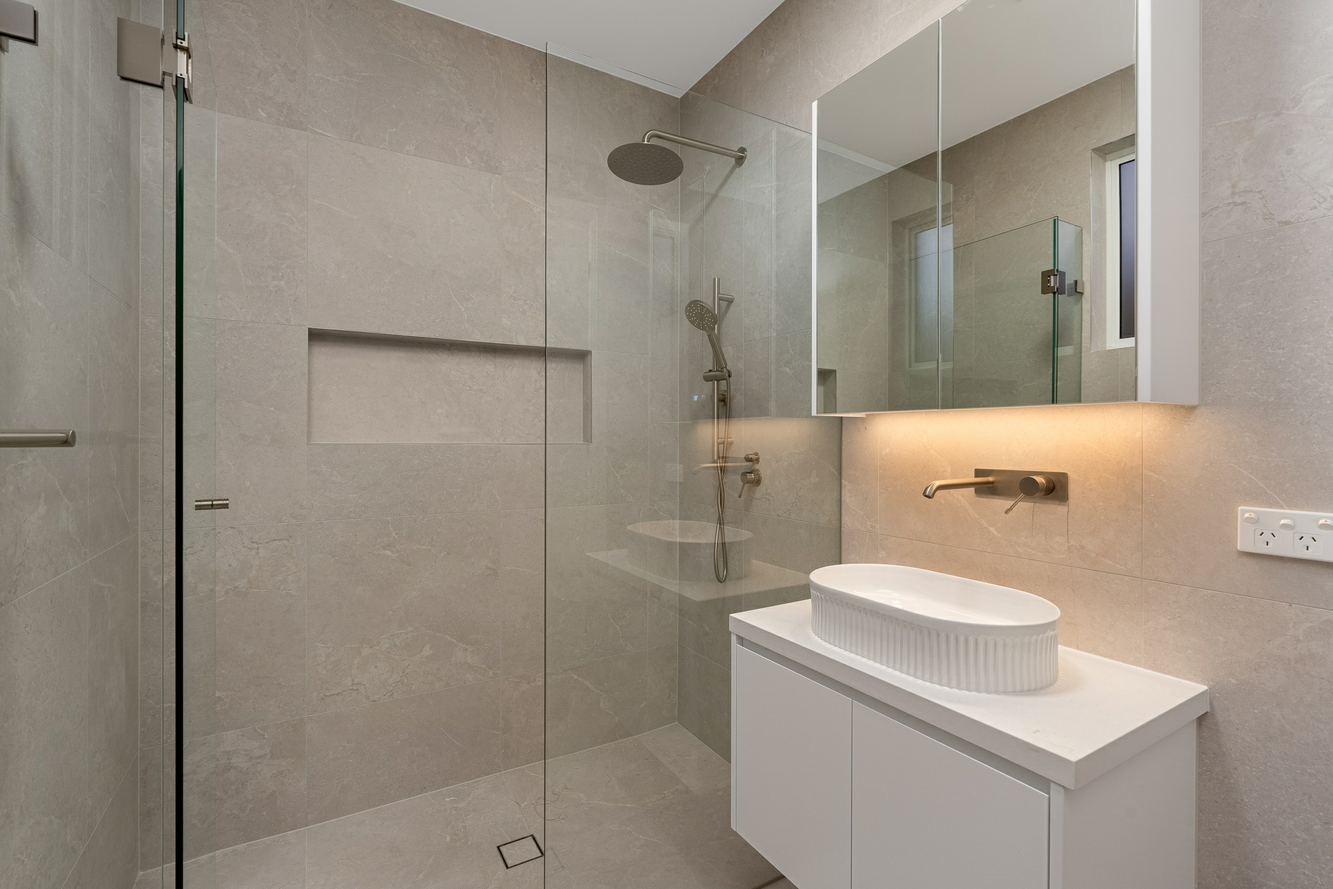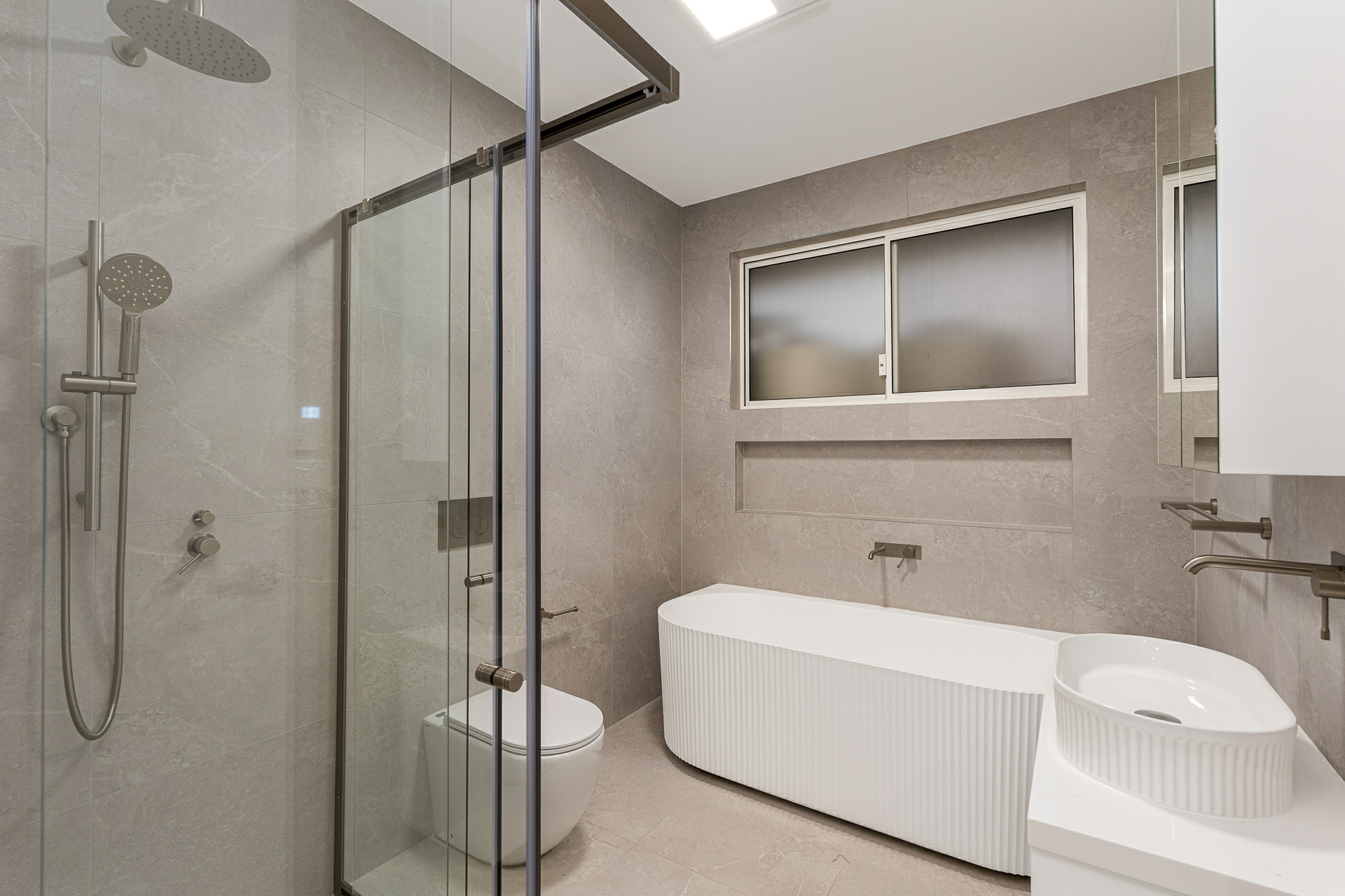 •Floor to ceiling tiles in bathrooms.