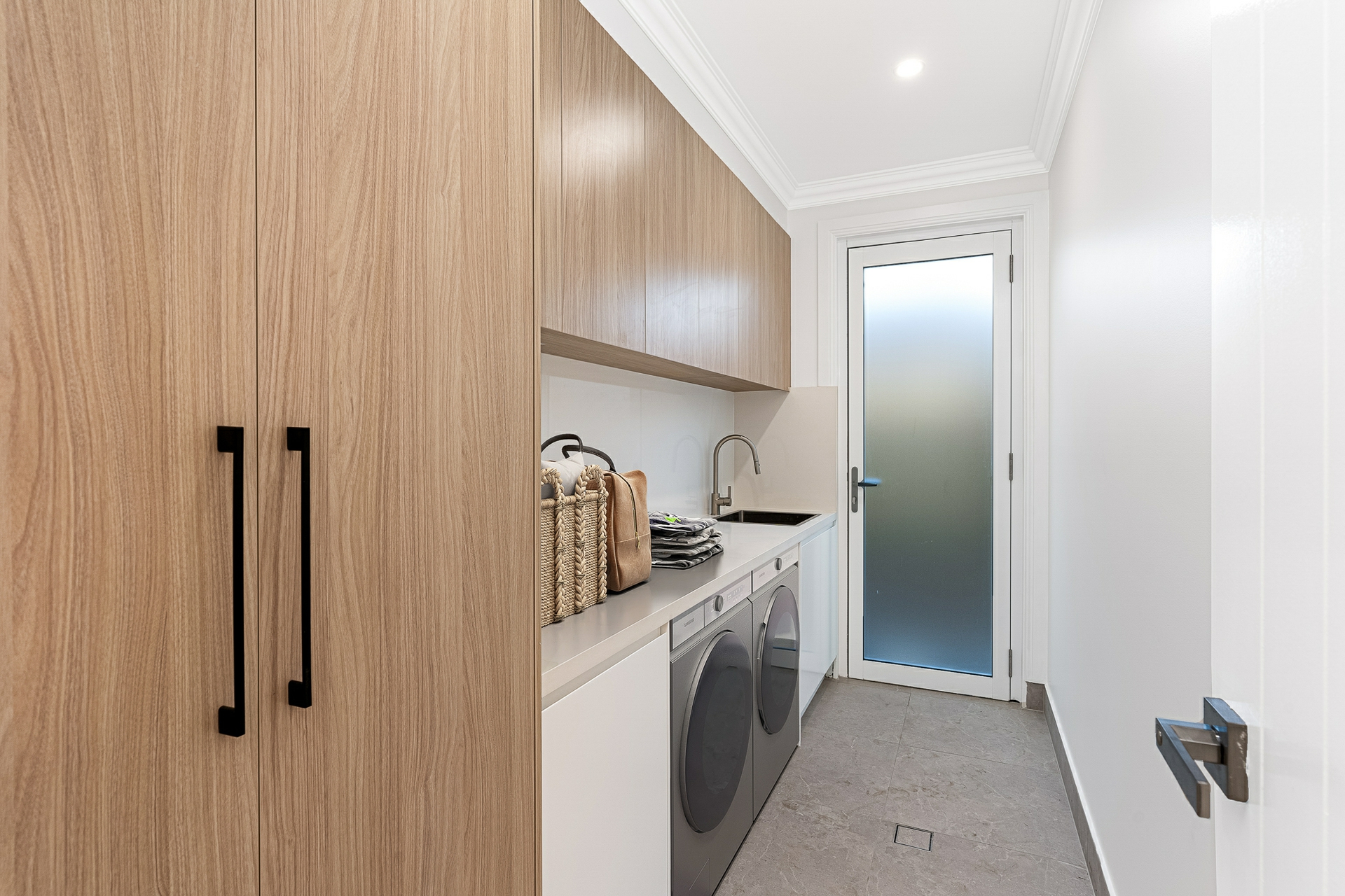 •Laundry with custom cabinetry.
