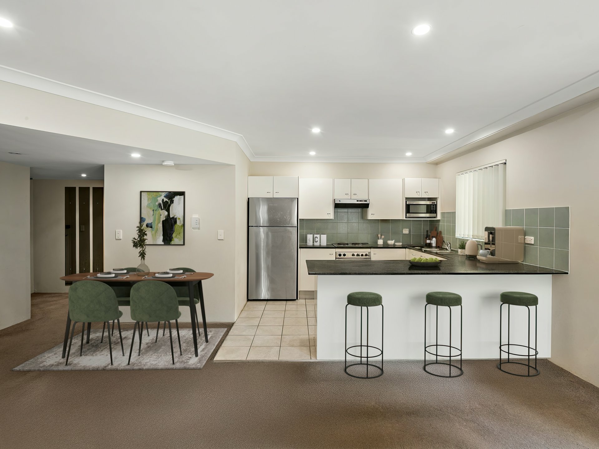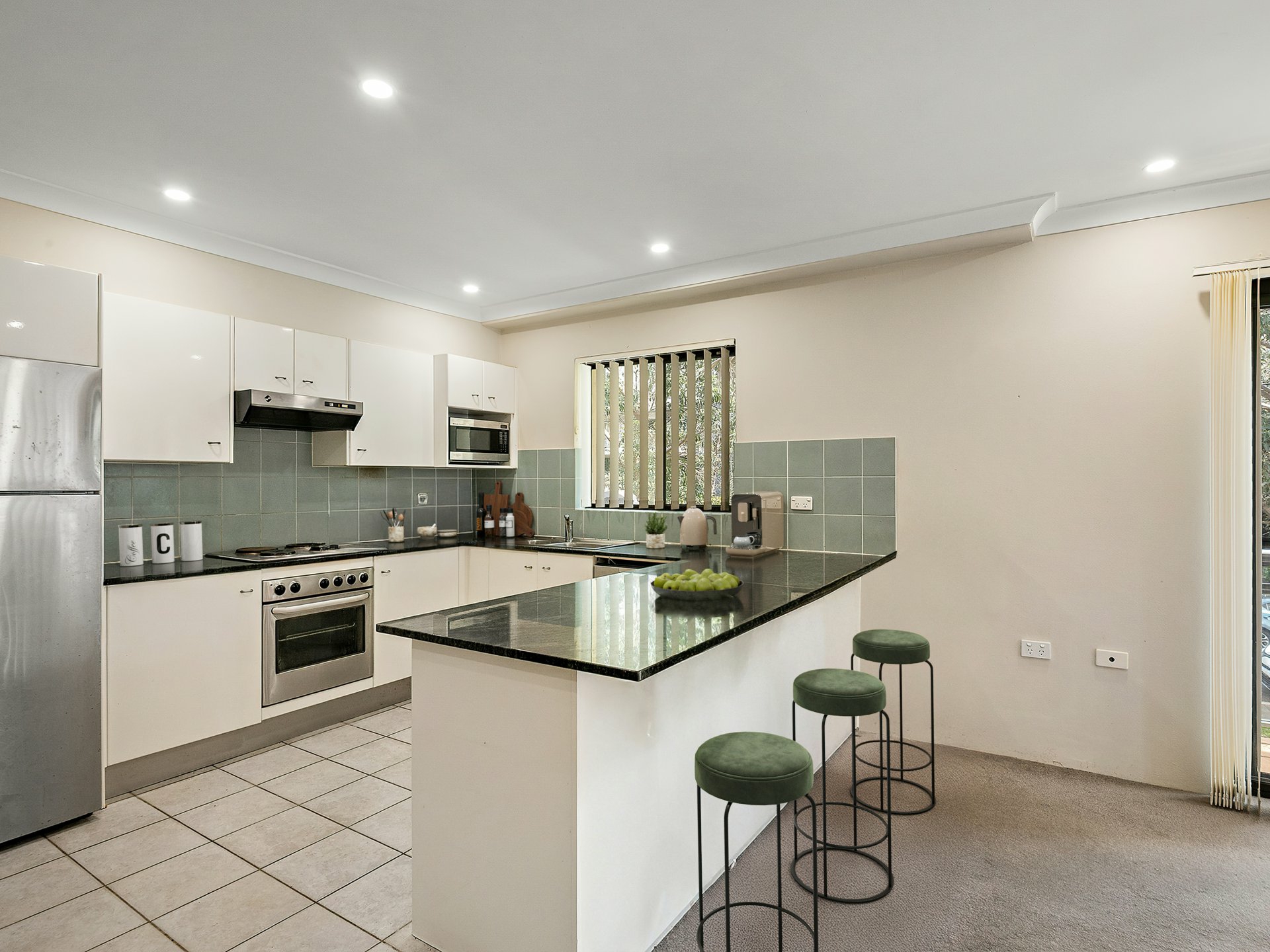 - The kitchen has abundant bench & cupboard space, stainless steel appliances and a breakfast bar