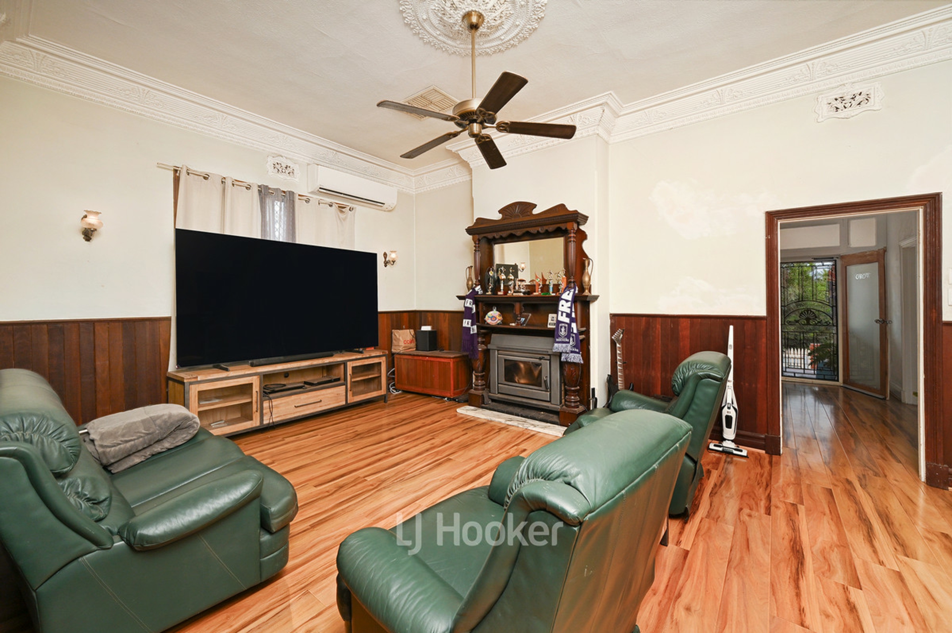 - Comfortable lounge room with charming jarrah mantle, dado boards, cosy log