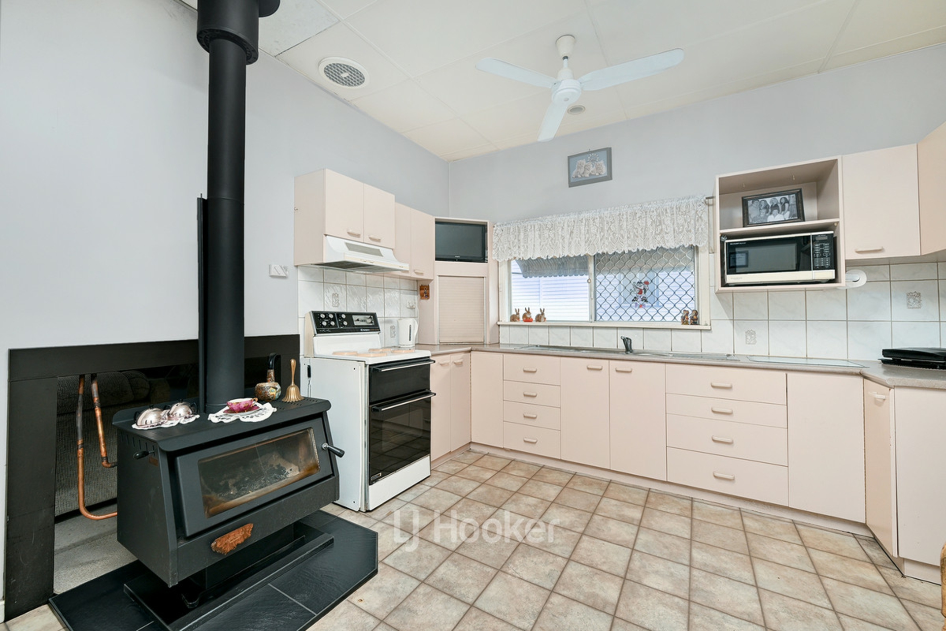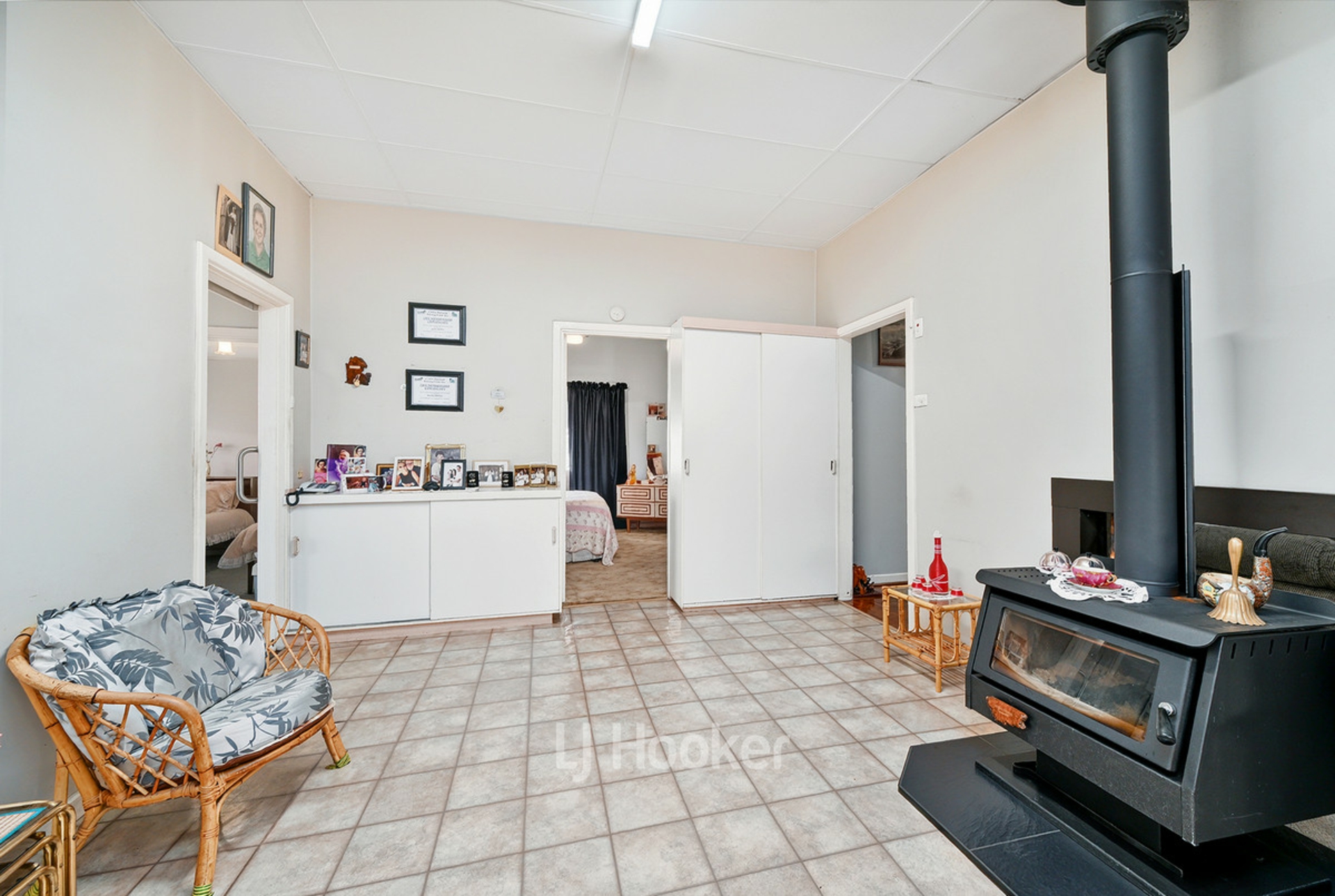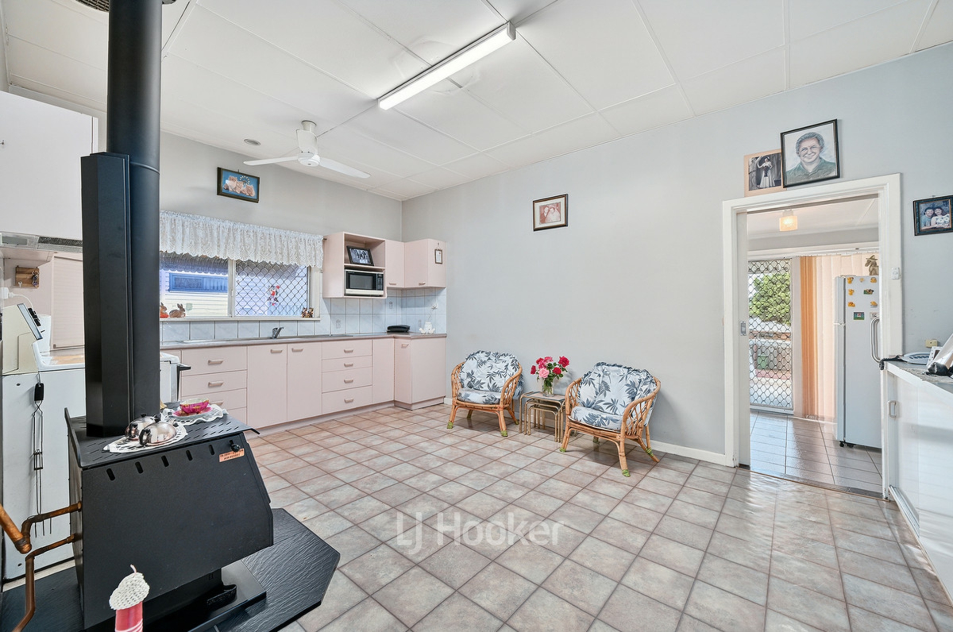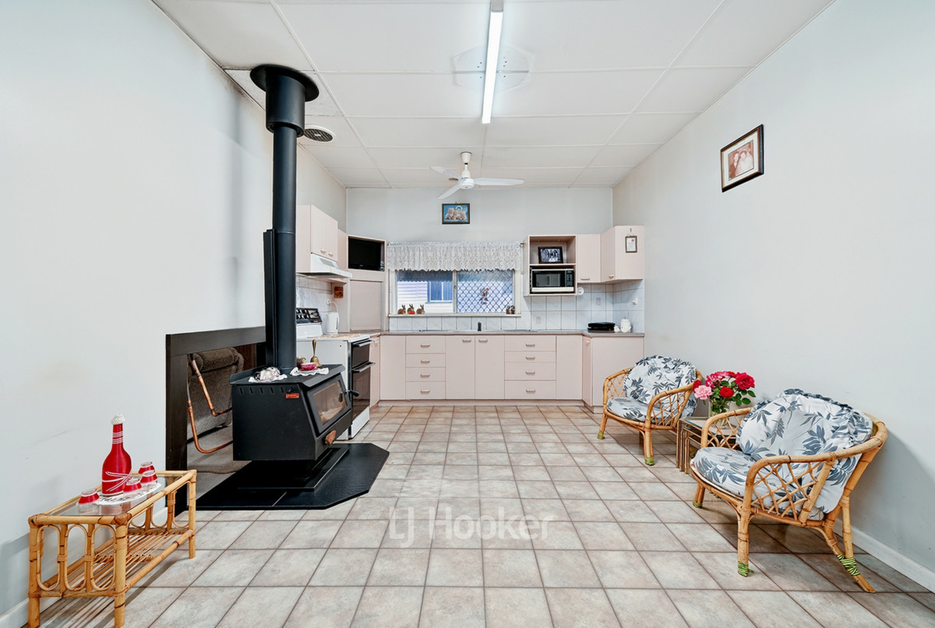 -Open plan dining with new log fire, ceiling fan, built-in cupboards and lino flooring