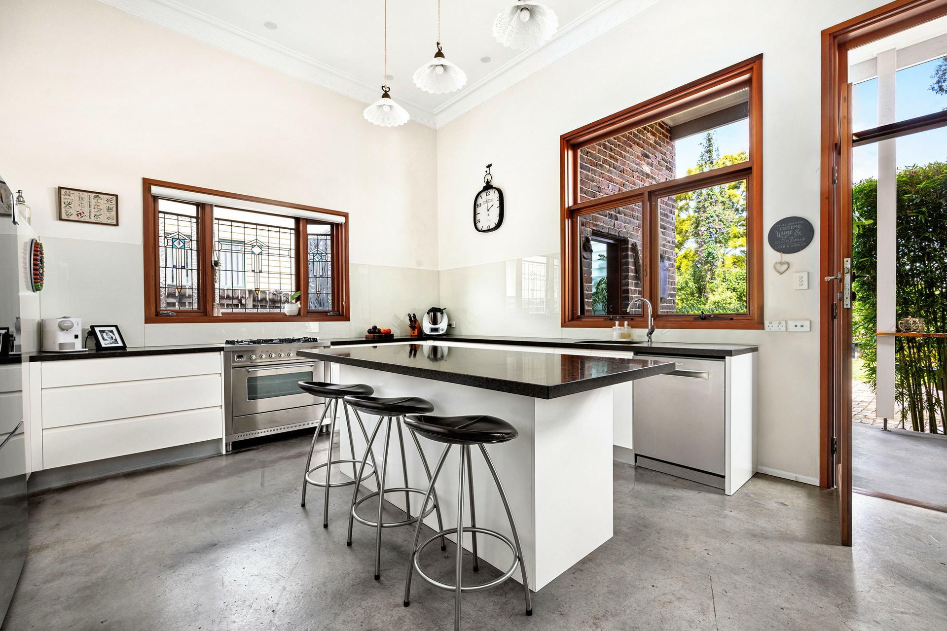 Nestled on a wide and peaceful street, the original part of the house comprises three double bedrooms flanking the entry hall, with built-in robes and ceiling fans, plus a chic central bathroom with shower. The living room features a Rinnai Gas Fireplace, and offers multi-use potential such as home office, theatre, or play room. From here, the old transforms into new as you step into a combined kitchen/living of epic proportions, with concrete floor, reclaimed-brick feature wall, and an abundance of natural light. The chef's kitchen centres around an enormous island, with Ilve gas cooktop, stone benchtops and streamlined cabinetry. A well-equipped laundry room with guest WC is accessed from the back terrace.