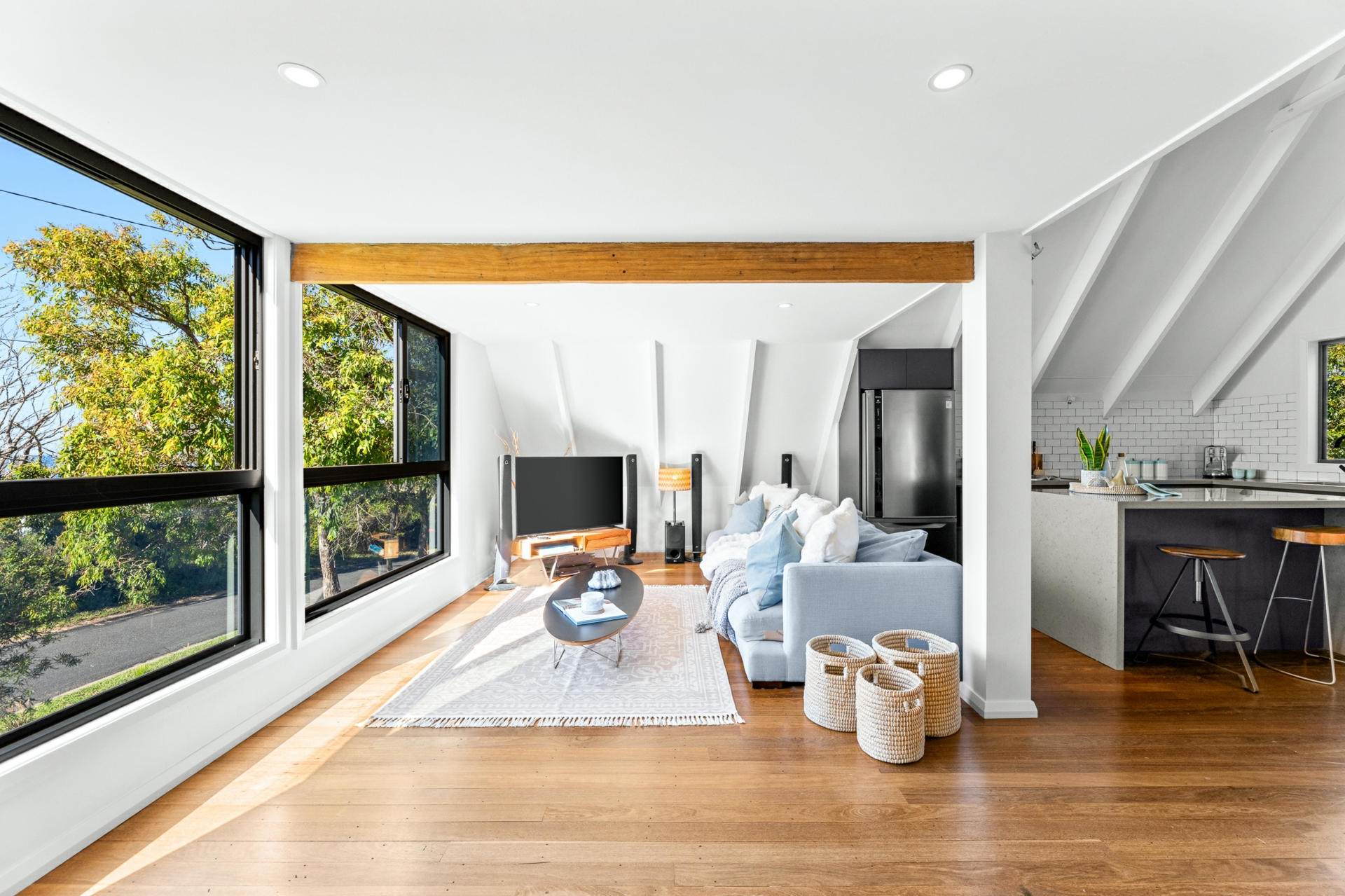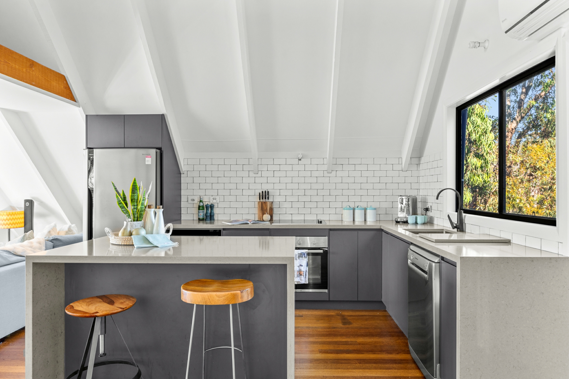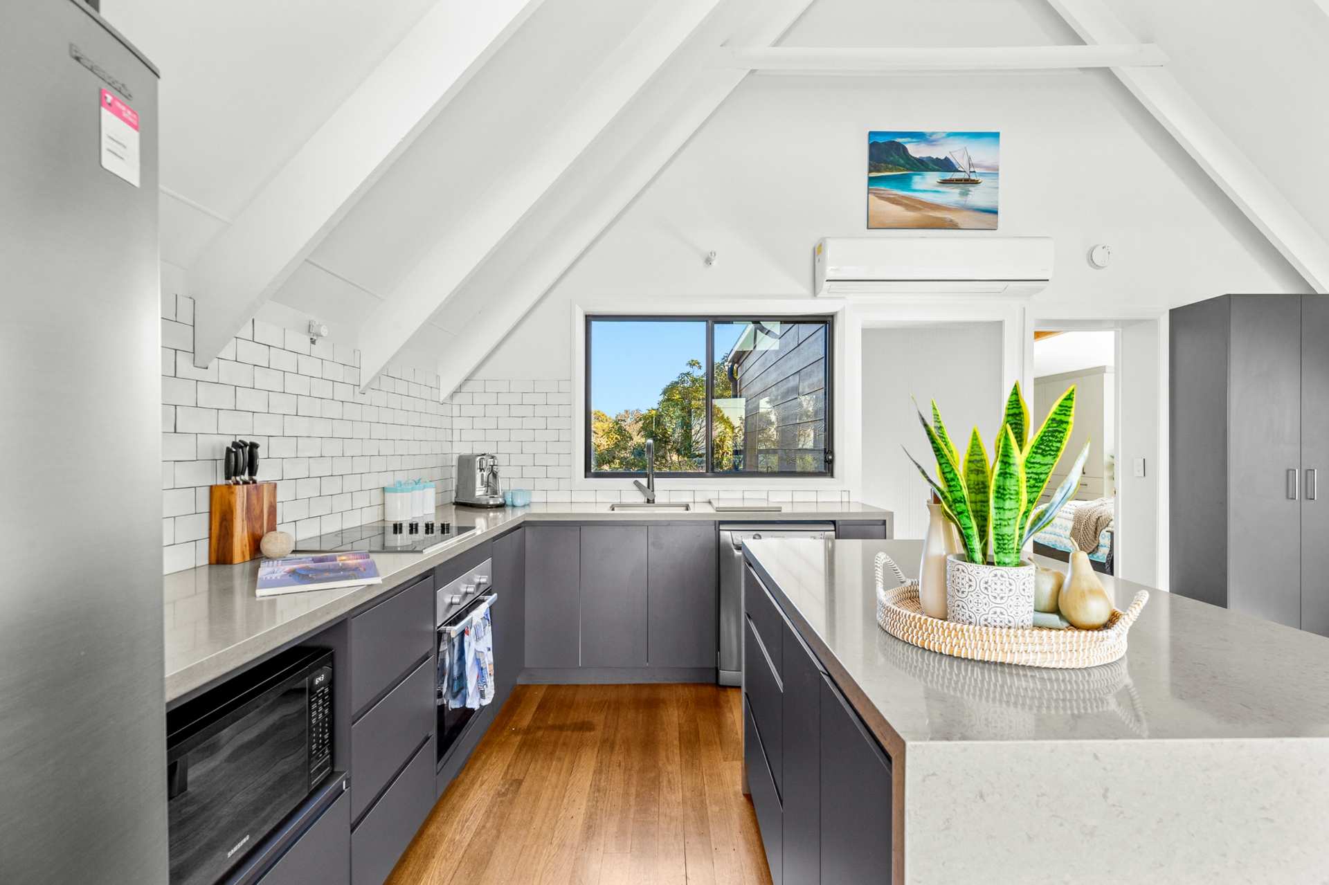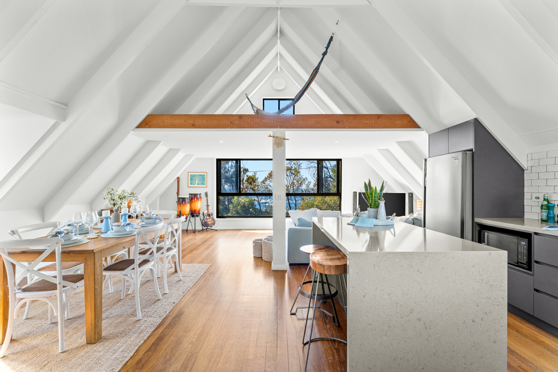 Upstairs, the light-filled heart of the home showcases a brand-new L-shaped kitchen complete with stone benchtops, breakfast bar, dishwasher, and soaring raked ceilings. The open-plan living and dining area flows effortlessly, capturing calming sea views and connecting to a unique mezzanine level above - the perfect retreat with a hammock for quiet moments.