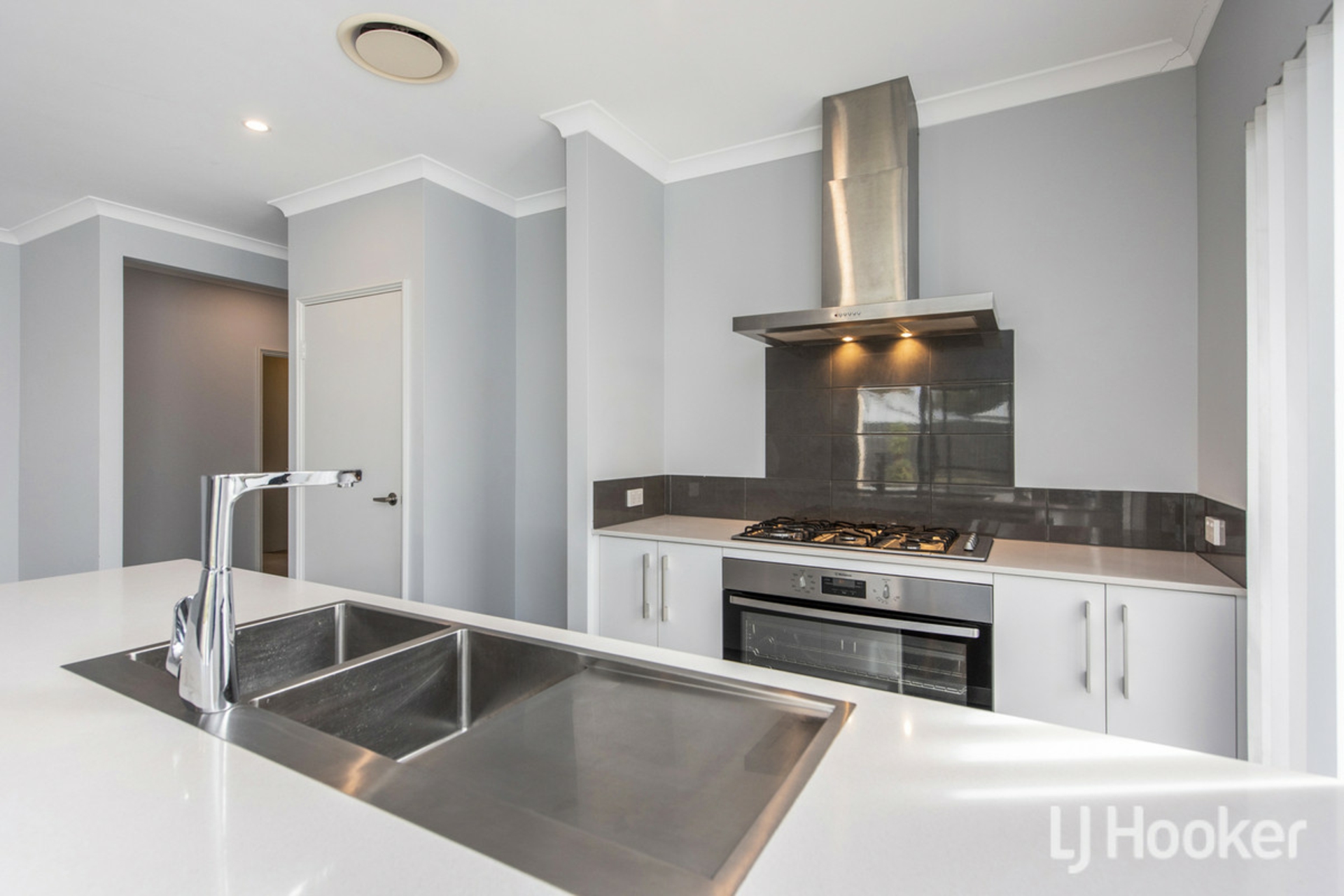 The kitchen is well-appointed with stone benchtops, a 900mm oven, five-burner gas cooktop, rangehood, dishwasher, and twin sinks-everything you need for both everyday living and hosting.